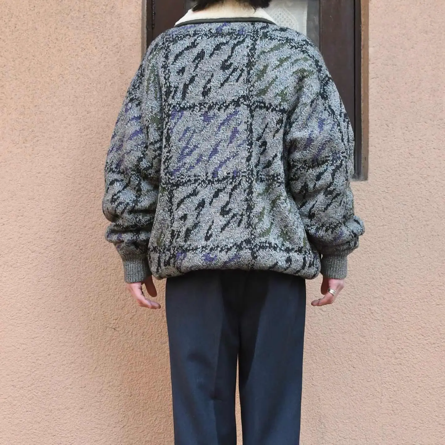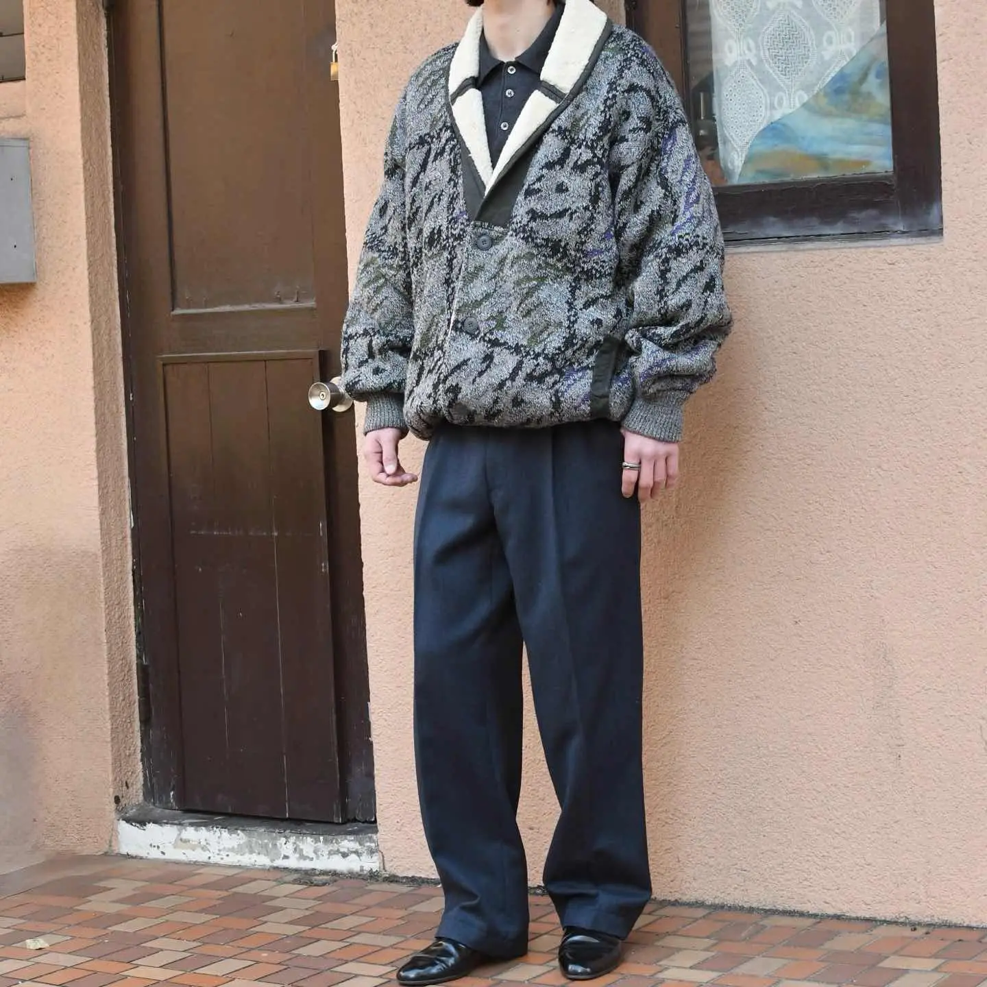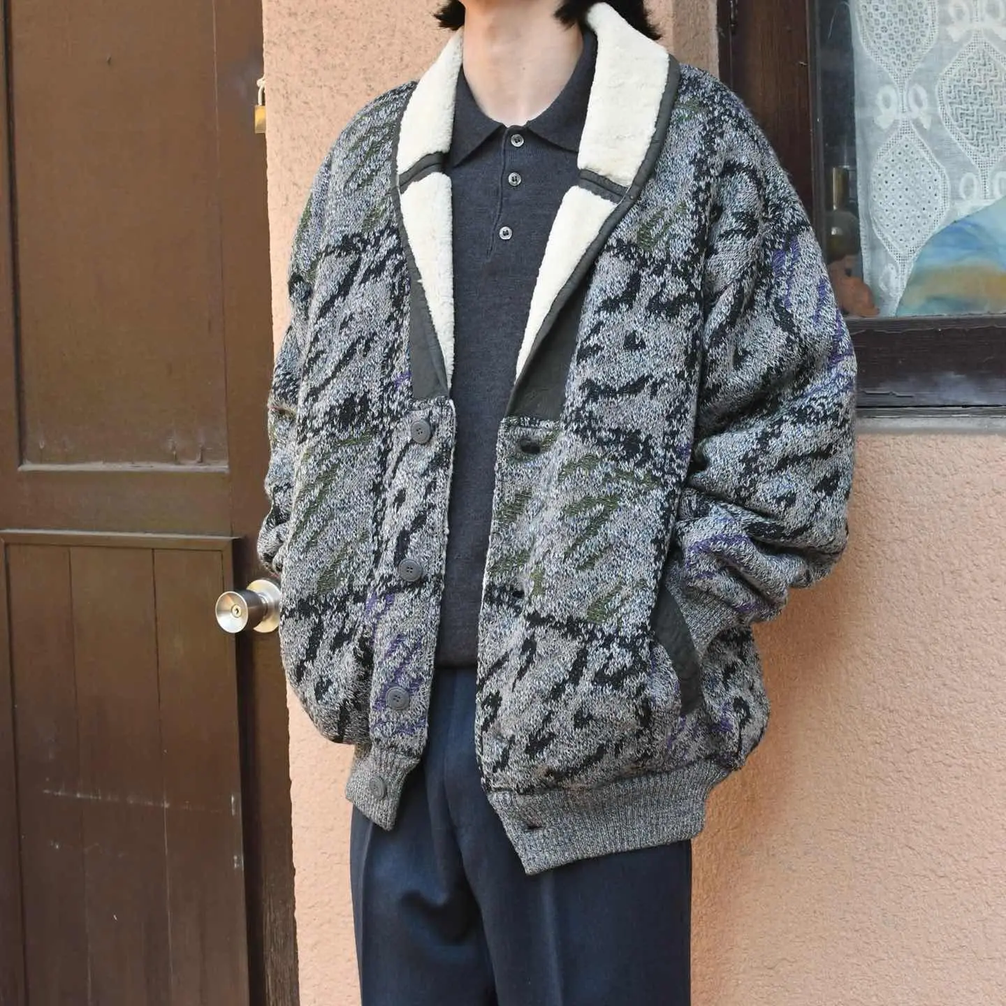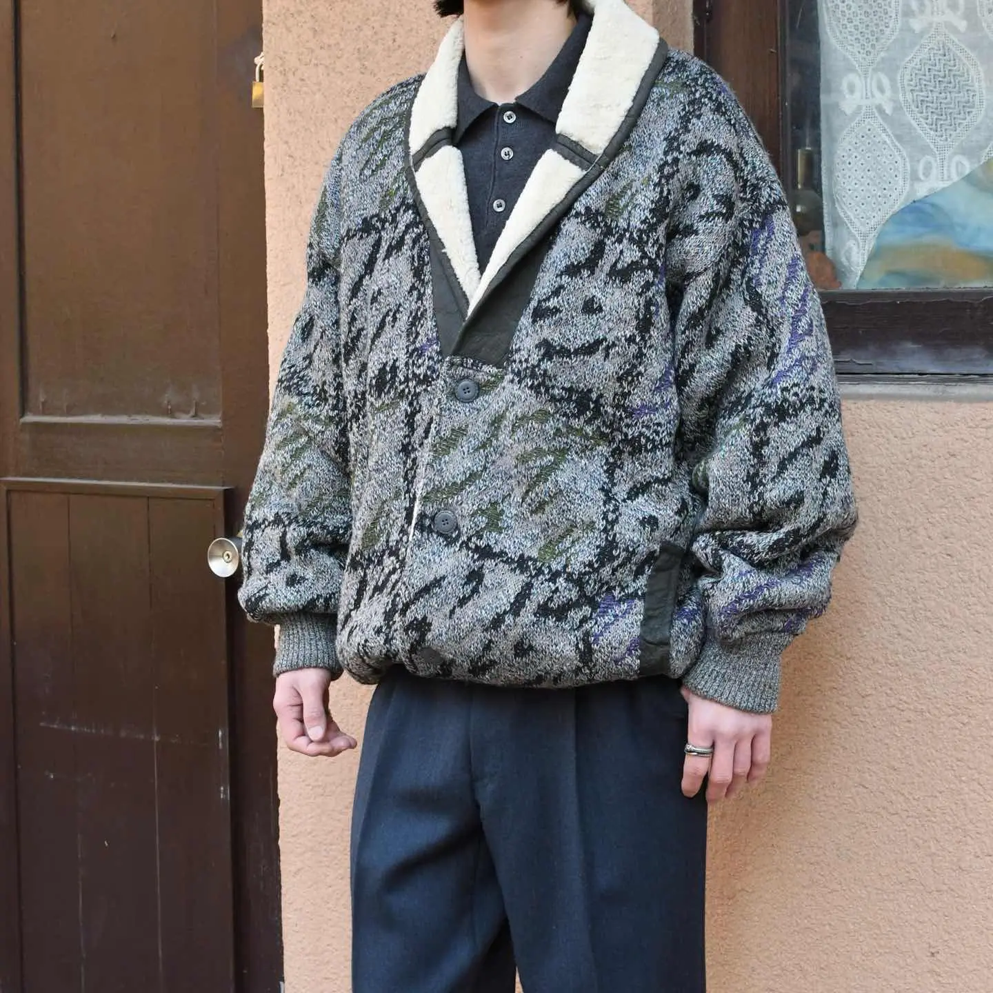 SIZE:L 着丈79cm 肩幅61cm 身幅70cm 袖丈64cm fabric/wool・alpaca・acrylic made in italy 着用画像 173cm/58kg ショールカラーの襟はリアルムートン、そして 色鮮やかなネップが散りばめられた ニットへ切り替えられ、裏地はムートンから ボアへ切り替えられるというニットブルゾンの中でも至極な逸品。 アウターの中でも柔らかい印象のある ニットブルゾン、名のあるアウターに埋もれ 万人が知るカテゴリーではないですが、だからこそ 積極的に取り入れていきたいアウターのひとつです。 熟れた雰囲気と新鮮味、ドレス寄りにも カジュアルにも落とし込めるアウターとして おすすめです。 ※撮影状況により、実物と多少色が異なる場合が ございます。 ※古着を取り扱っているため、気づかない汚れや ほつれ等がある場合がございます。 ※サイズは着用感で選んでおり、 表記サイズは説明欄の最初に記載しております。 オーバーサイズ old vintage ヴィンテージ used 80's 90's アメリカ古着 ユーロ古着 POLO RALPH LAUREN Eddie Bauer OLD GAP LANDS' END ランズエンド LLBean エルエルビーン オールドギャップ エディーバウアー ラルフローレン ブルックスブラザーズ Brooks Brothers 灰色 グレー ムートンジャケット ジャケット ネップ などがお好きな方 #vintage #old #used #90s #80s #古着 #ヴィンテージ #アメリカ古着 #ユーロ古着 #LLBean #エルエルビーン #EddieBauer #エディーバウアー #oldgap #オールドギャップ #LANDSEND #ランズエンド #NAUTICA #ノーティカ #ラルフローレン #POLORALPHLAUREN #ブルゾン #ムートンジャケット