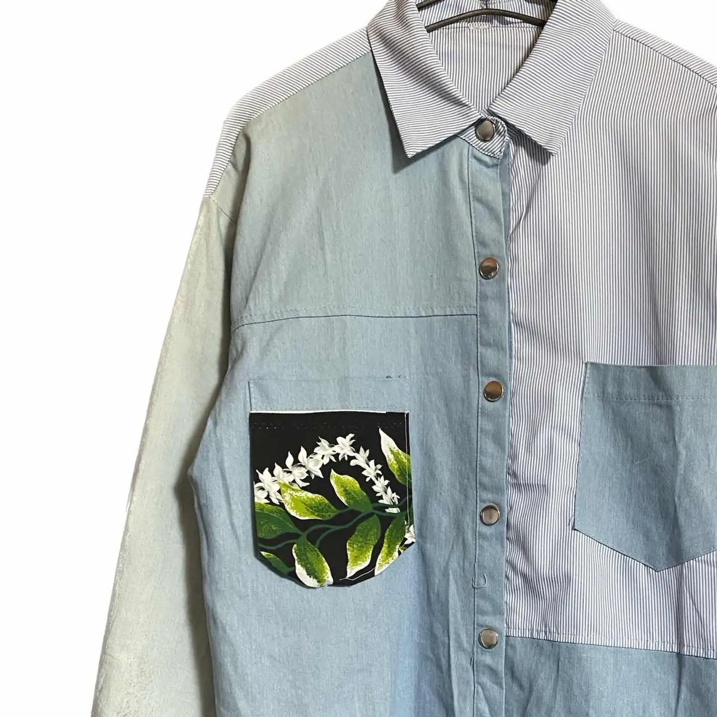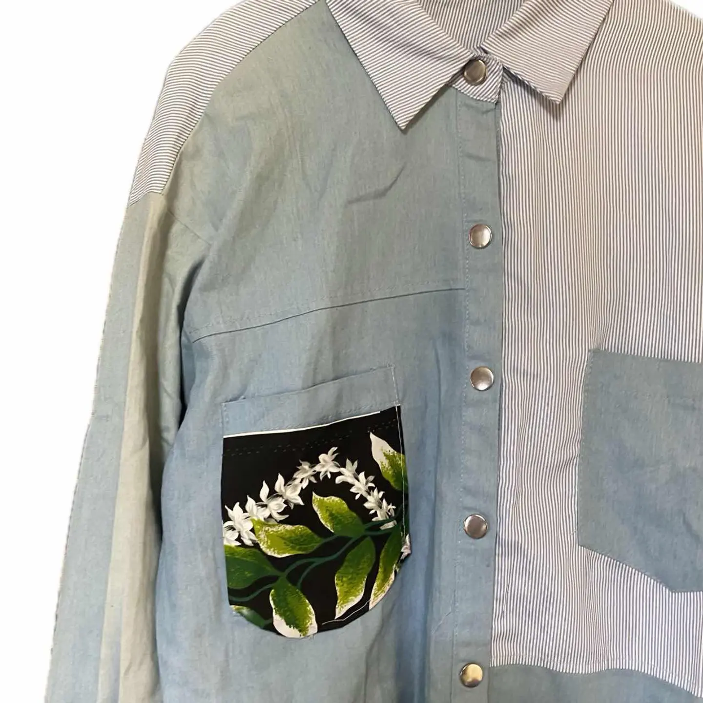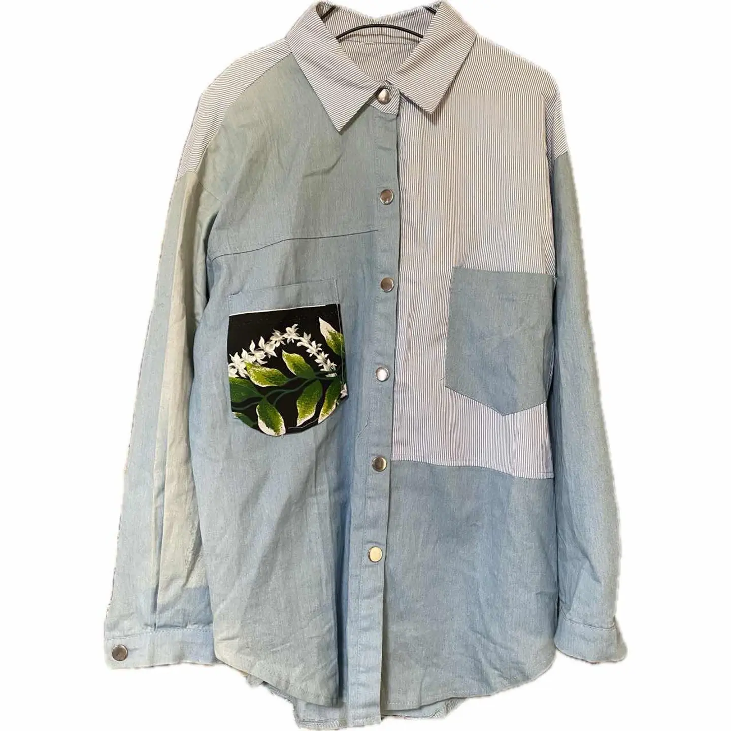 vinvage remake KHAOS pattern シャツ L フェードUTILITY 一撃でインパクトあるのに行き過ぎないこなれたコーデ!! どんなボトムむ、一気にお洒落に決まるシャツを、作りました^_^ KHAOS【混沌】 pattern crazyは、イカれた patternから、きますが、 KHAOSは、様々な、ジャンルが、入り混じるの意味、 計算し尽くしてパネルパターンにしてますが、 フェード加工ダンガリー フォーマルな、ストライプを、武骨と、フォーマルを融合するから。どちらのスタンスでも使えるんです。 また、世界に一つのシャツな、どの角度でも、印象違うように、計算された、パーフェクトな1着となります、 メインでも。インナーでも活躍する、UTILITY風仕上げシャツです^_^ ▷color◁ 写真通り ※ブラウザで異なる場合ありますがかなり実物には、近づけてます、 ▷size◁ 平置き片面採寸【㎝表記】 表記size Lに。設定、 着丈/74 身幅/53 肩幅/54DS 袖丈 /62DS DSは袖はハンガー採寸 ※多少の誤差は理解下さい 170/Mジャスト体型の私が着て、✔️参考に ジャスト オーバーサイズ✔︎ ビックサイズ 【素材】 70s ミリタリーダンガリー ※フェード加工 60s チンストフォーマルシャツ ポケット 00sハワイアン material 【状態】 極上リメイク!!最強 検品、洗濯、検品で、3回チェックして発送しますので、ご安心して、お買い求め下さい!!