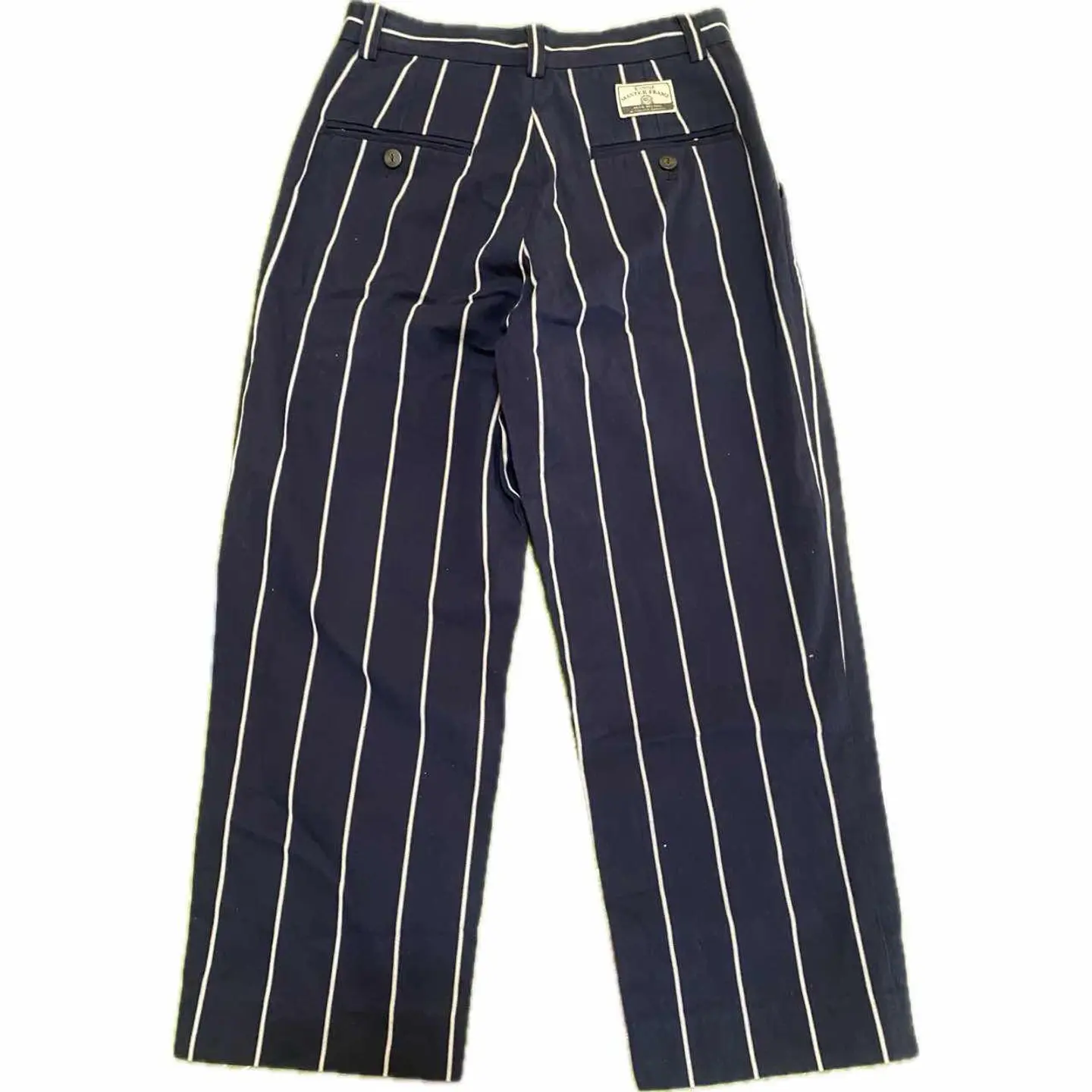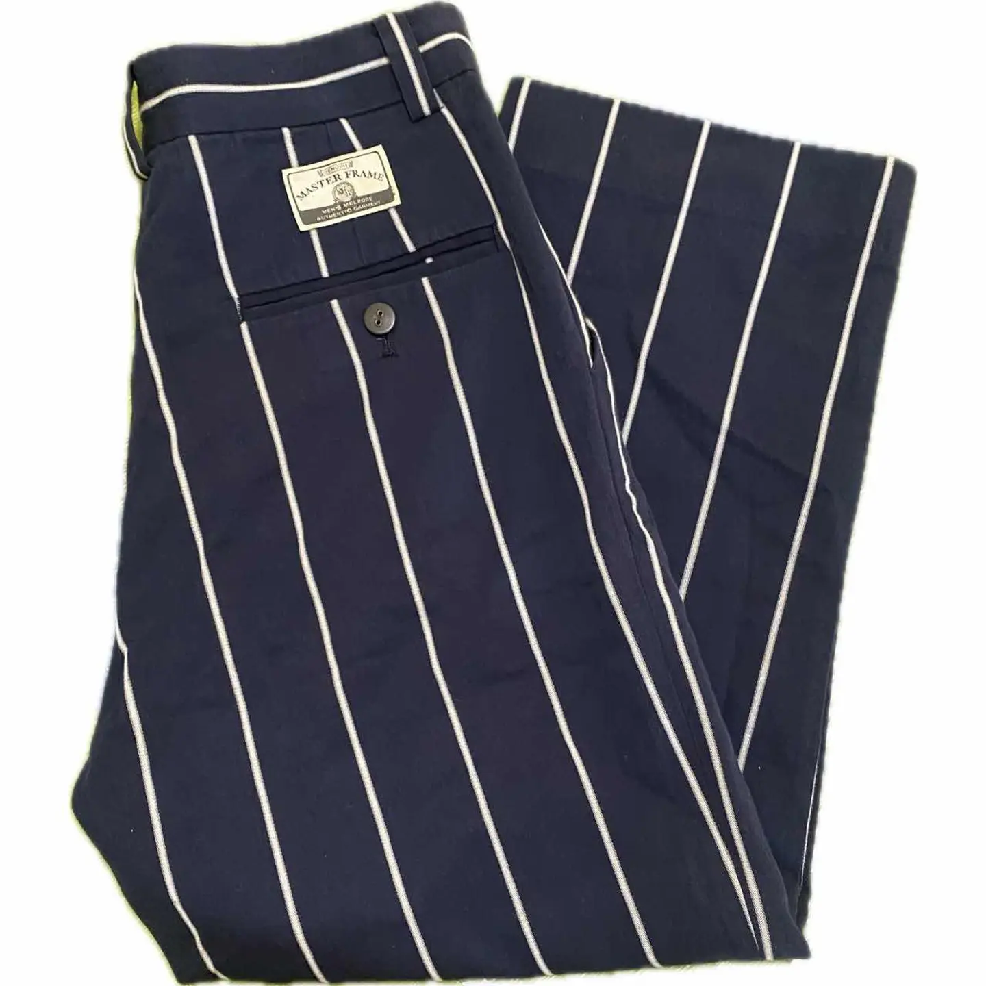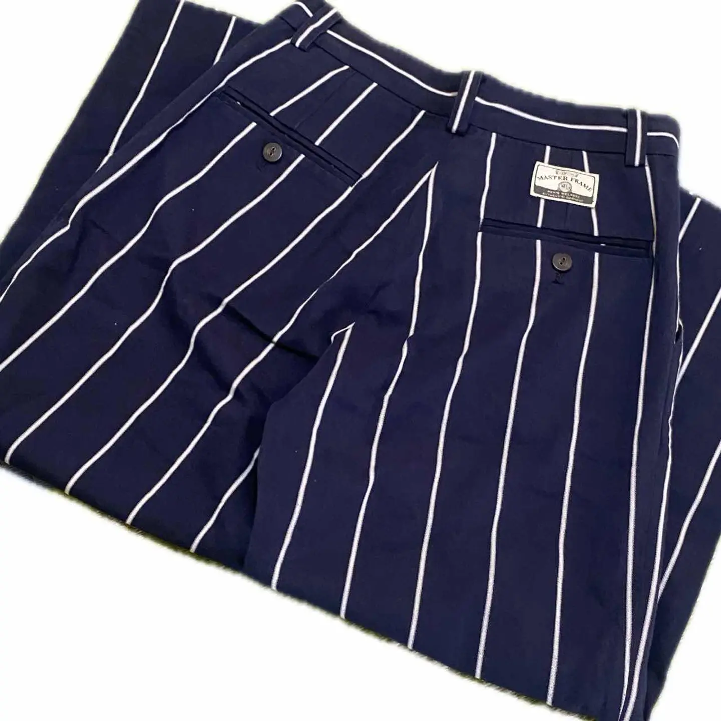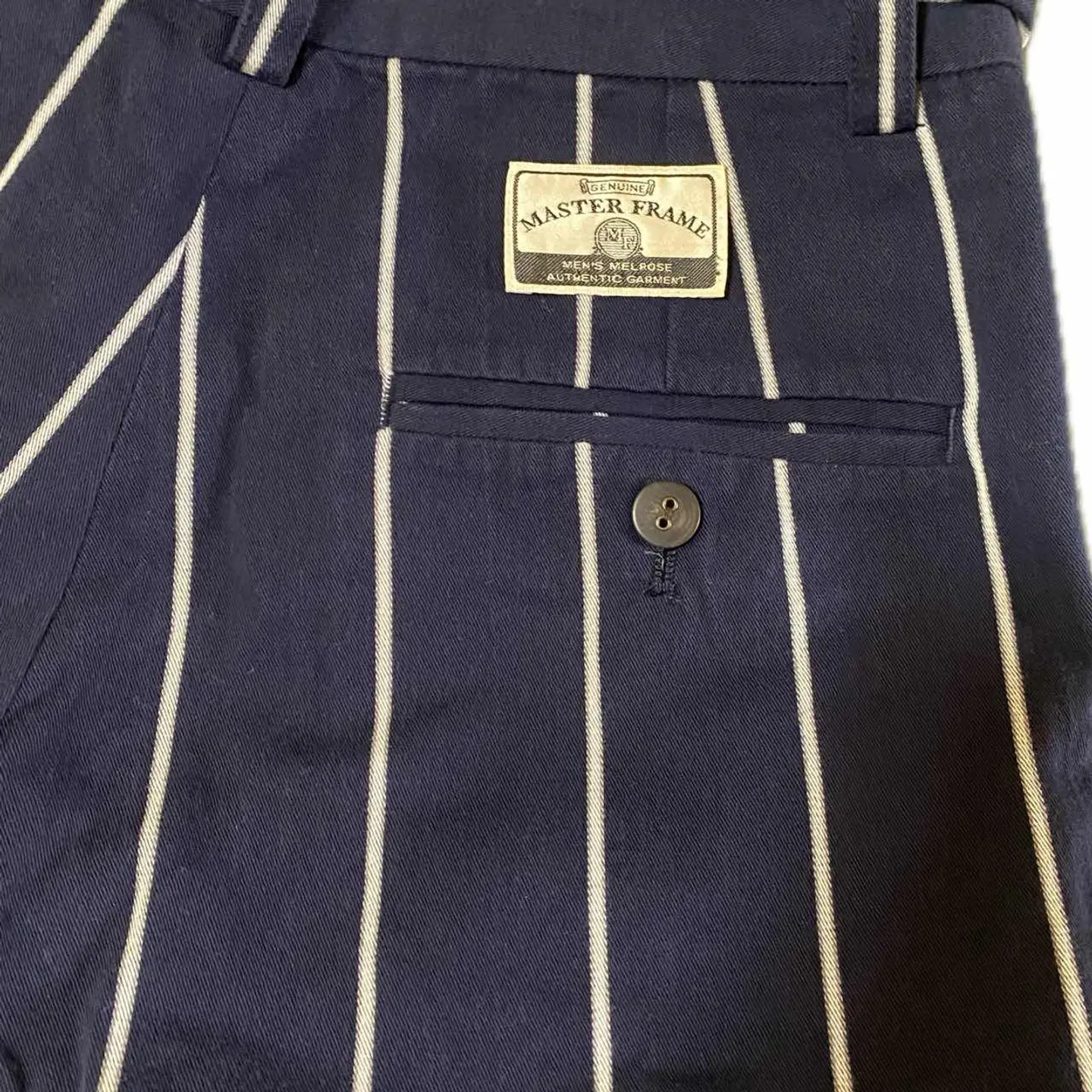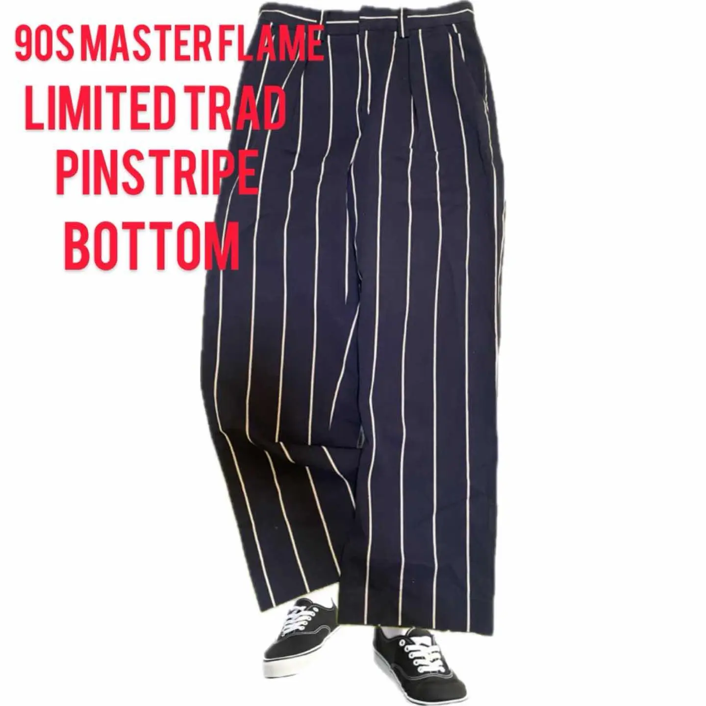 90s master フレイム トラッド限定モデル、ピトラッドボトム •brand vintage •data 90s 普遍的なトラディショナルを原点に、シンプルでモダンな要素をプラスし、洗練された大人のスタイルを、提供する master flagme limited TRAD ライン90s 45no 18カム、 no45は、みつけたら、即ゲットが鉄則 •point もはやさすがとしか言いようのないブランドのポリシーが見える限定ライン、ストライプパンツって様々なものがありますが、ピンストライプタイプのやつのネイビーはトラッドなんですよ。TRADの象徴ともいえます。 そこで今回はスニーカーはvansにして、カジュアル感を見せてますが、まず最初のコーディネート、完全に大人コーディネート1950トラッドスタイルです。 いやいや、いやいや、タフすぎるんだよって方いるかもしれませんよね。はい余裕です。超オーバーサイズのゆるだぼニットを1枚で決める季節変わったら、これでこなれた感じでカッコイイですよね。どちらでもいけるってことです。それはやりすぎてないストライプだしクールなトラッドボトムだからです、 サイズさえ合えば、確実にこれは即ゲットしたほうがいいですね ▷color◁ ネイビー ※使いのブラウザにより色が変わってみえる場合あります ▷size◁ 平置き片面採寸【㎝表記】 表記size 不明 Mくらい私が入るので 【※ウエストのみ、メジャーで一周採寸】 ウエスト73 ベルトループあるから、それ以下は対応 股上32 股下68 腿渡り30 裾幅30 ナチュラルstraight モデル170㎝/普通体型、30インチジャストな体型参考に、 ▷material◁ 斜織コットンよってシワに強い ▷condition◁ 不具合無し ※入念にチェックは、しておりますが、vintage/usedの特性ご理解下さい