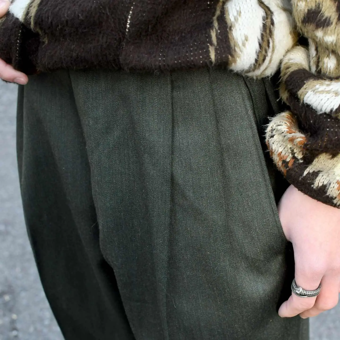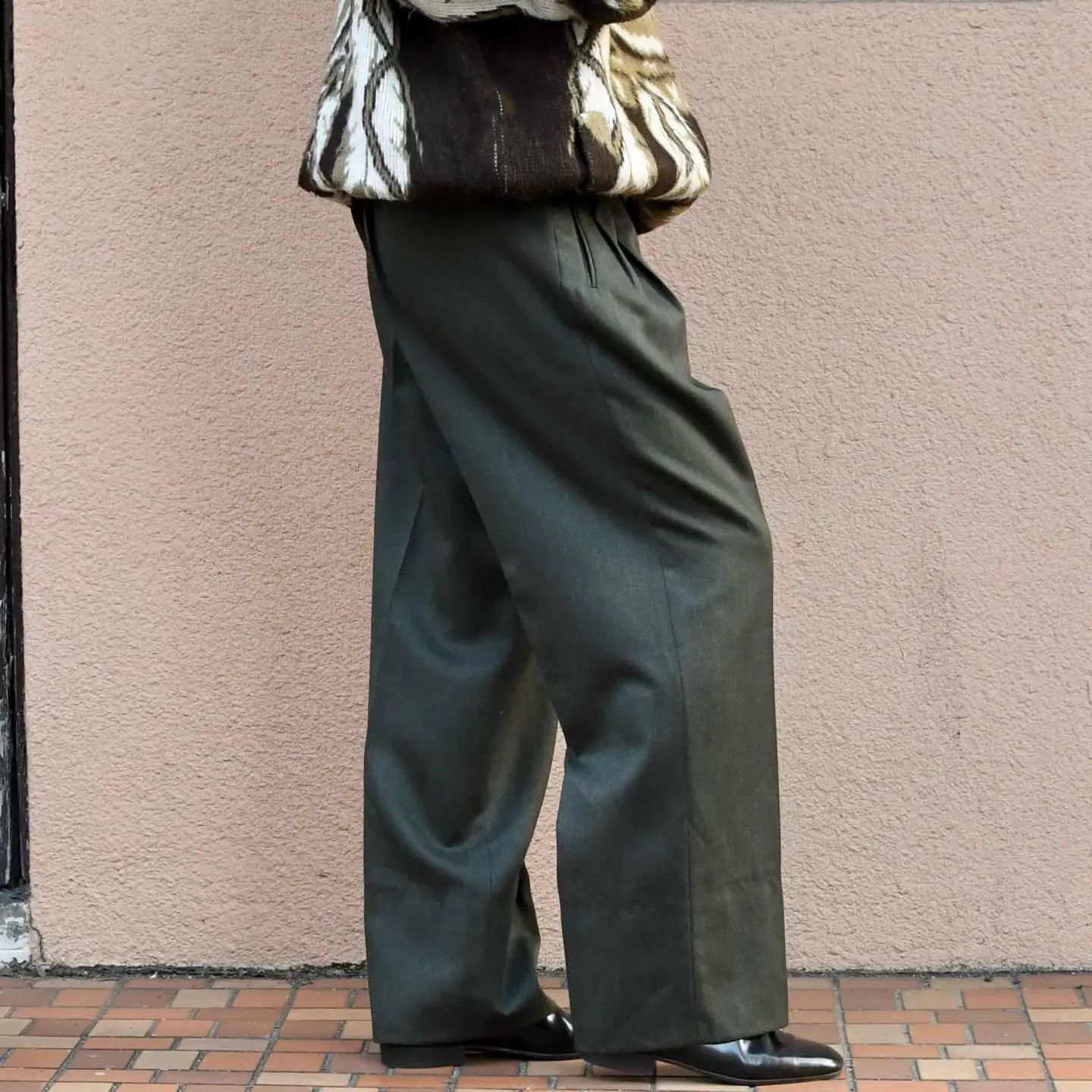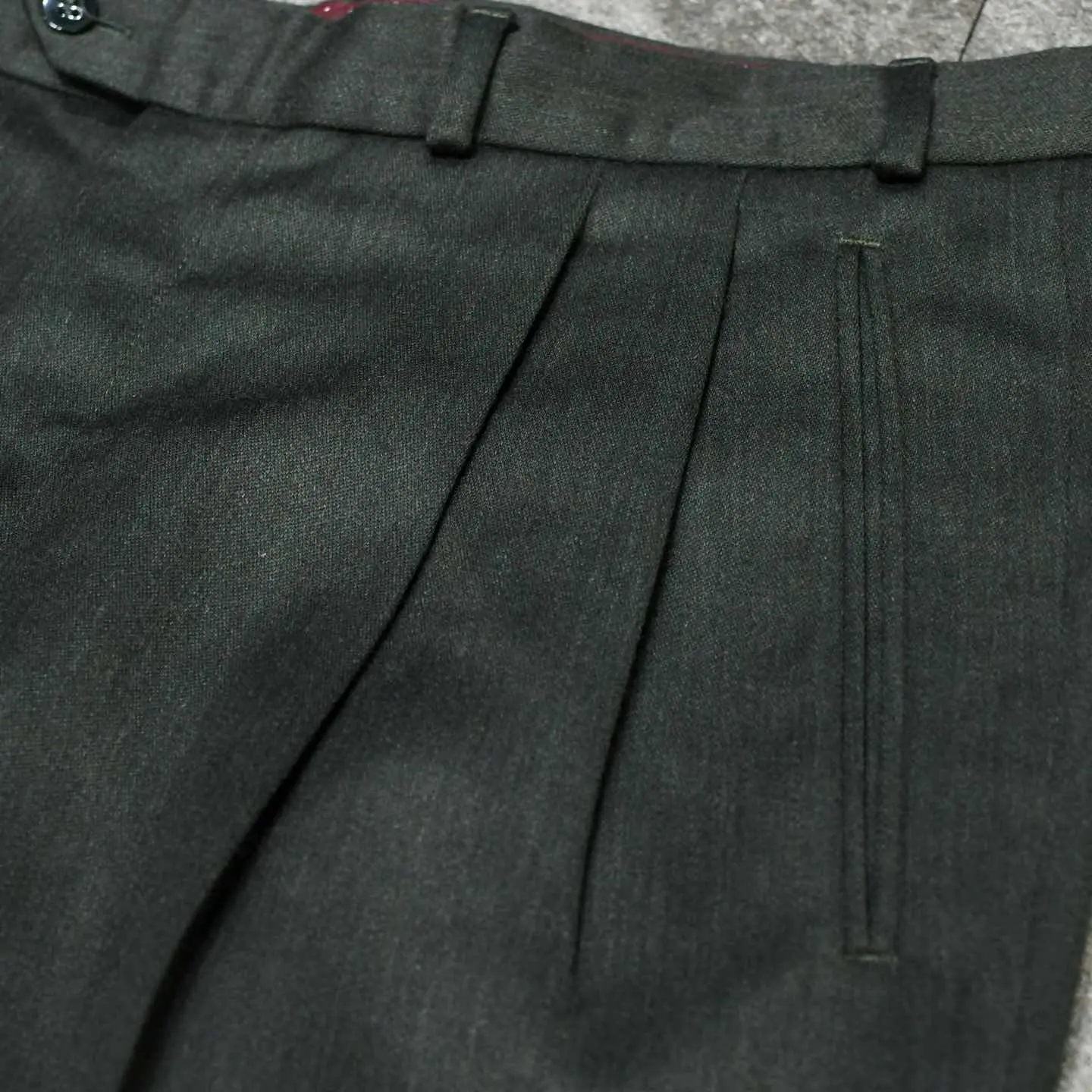 古着 ダークグリーン ウールスラックス 裏地付き タックパンツ ワイドパンツ