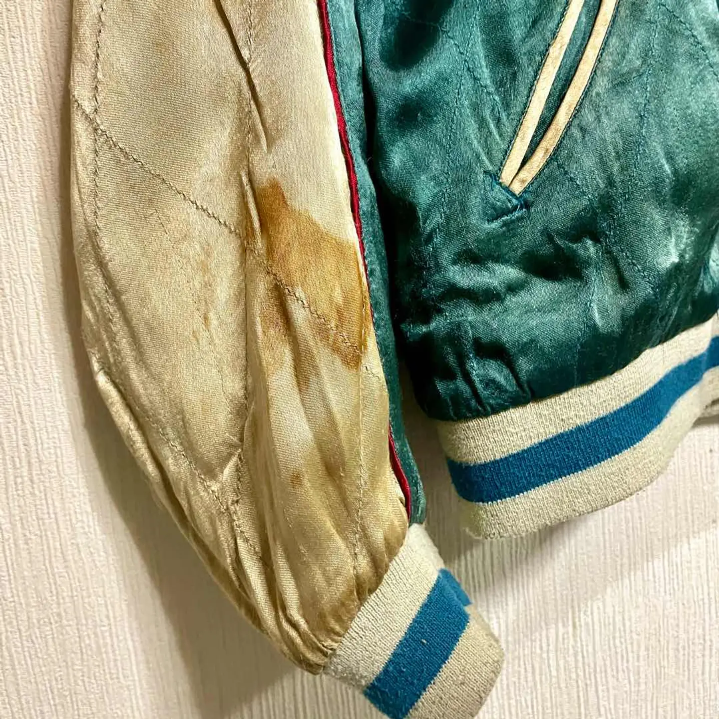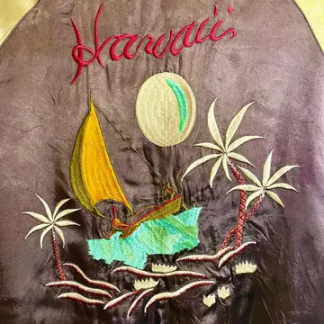 舞妓と桜、ハワイとサーファーがデザインされているスカジャン。 素材はレーヨン100%でサテンです。 身幅 57cm 総丈 65cm 写真のように汚れ、シミいくつかあります。 破れなどはなく着て楽しむ分には全く問題なく状態はいいですがあくまで古着、ヴィンテージ品であり、新品では無いのでそういったものへの理解がある方のみ購入をお願いします。 #古着 #古着屋 #ヴィンテージ #ティンクウッド #used #usedclothing #vintage #vintageclothing #tinkwood #スカジャン #スーベニア