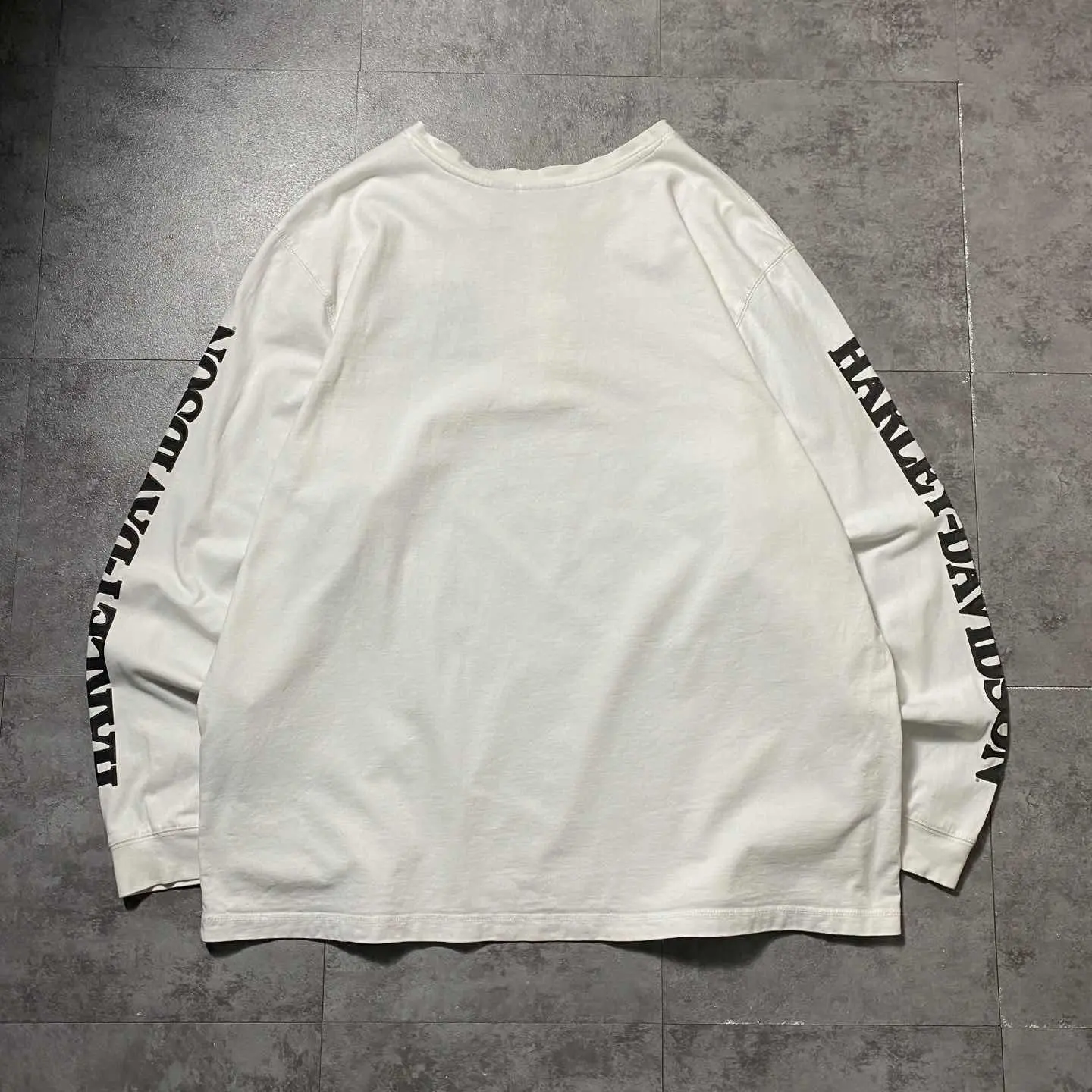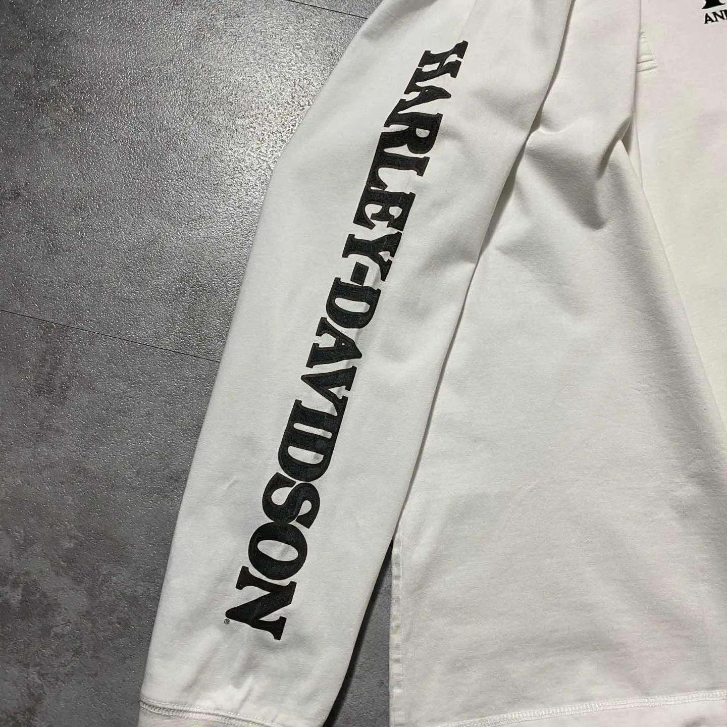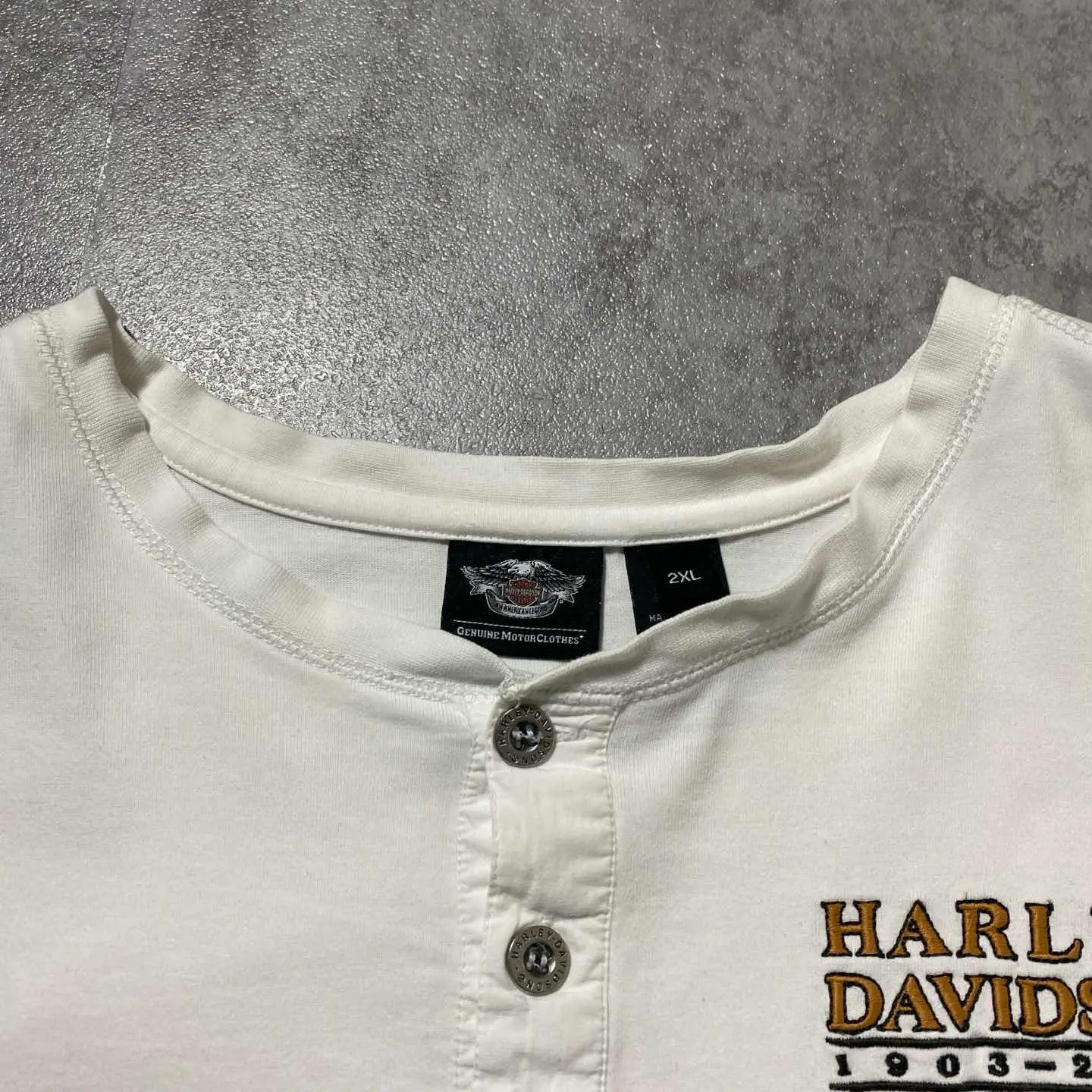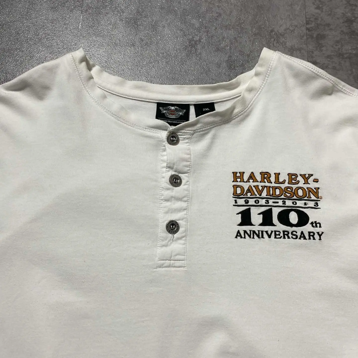 ハーレーダビッドソン 110周年刺繍ロゴ アームプリント ヘンリーネック ロンT