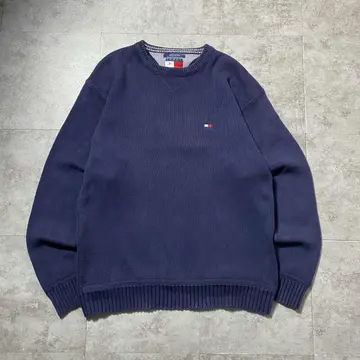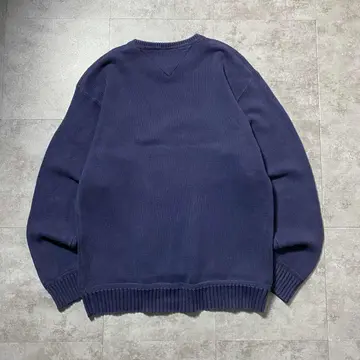 90s トミーヒルフィガー 刺繍ワンポイント 前V ネイビー コットンニット