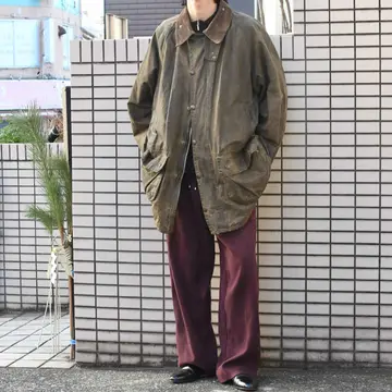 SIZE:C46 着丈86cm 身幅76cm 裄丈90cm fabric/cotton 着用画像 173cm/58kg 1960年代から存在する、BARBOURの代表的なモデル”GAMEFAIR” 何度か細かいディテールが モデルチェンジしているようですが、 こちらは93年製の個体。 90年代後半には歴史に幕を下ろした モデルでもあるため、晩年頃でしょうか。 ”BEDALE”や”BEAUFORT”、そして最近では ”SPAY”や新品のモデルなど数多くのモデルが 存在する中、あえてこのモデルを選ぶ方は 少ないように感じます。 ただ個人的には流行りに乗らず、この丈感で、 尚且つゆとりのあるこのサイズで身に纏いたいなと。 雑にがばっと、古着らしくどうぞ。 ※撮影状況により、実物と多少色が異なる場合が ございます。 ※古着を取り扱っているため、気づかない汚れや ほつれ等がある場合がございます。 ※サイズは着用感で選んでおり、 表記サイズは説明欄の最初に記載しております。 オーバーサイズ old vintage ヴィンテージ used 80's 90's アメリカ古着 ユーロ古着 POLO RALPH LAUREN Eddie Bauer OLD GAP LANDS' END ランズエンド LLBean エルエルビーン オールドギャップ エディーバウアー ラルフローレン ブルックスブラザーズ Brooks Brothers カバーオール オイルドジャケット カーキ ゲームフェア などがお好きな方 #vintage #オーバーサイズ #old #used #90s #80s #古着 #ヴィンテージ #アメリカ古着 #ユーロ古着 #LLBean #エルエルビーン #EddieBauer #エディーバウアー #oldgap #ラルフローレン #POLORALPHLAUREN #オイルドジャケット #カバーオール #BARBOUR #GAMEFAIR