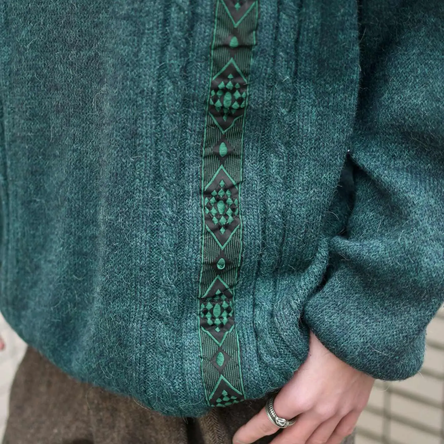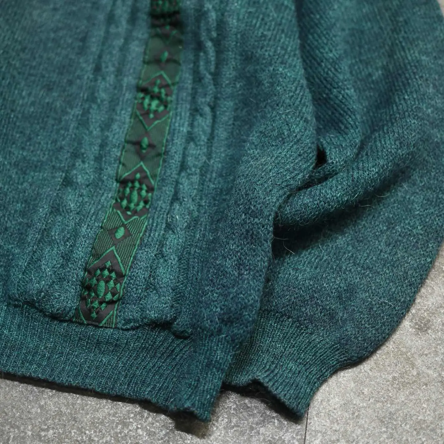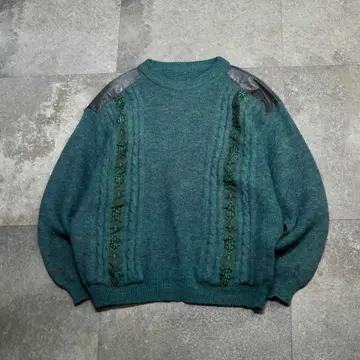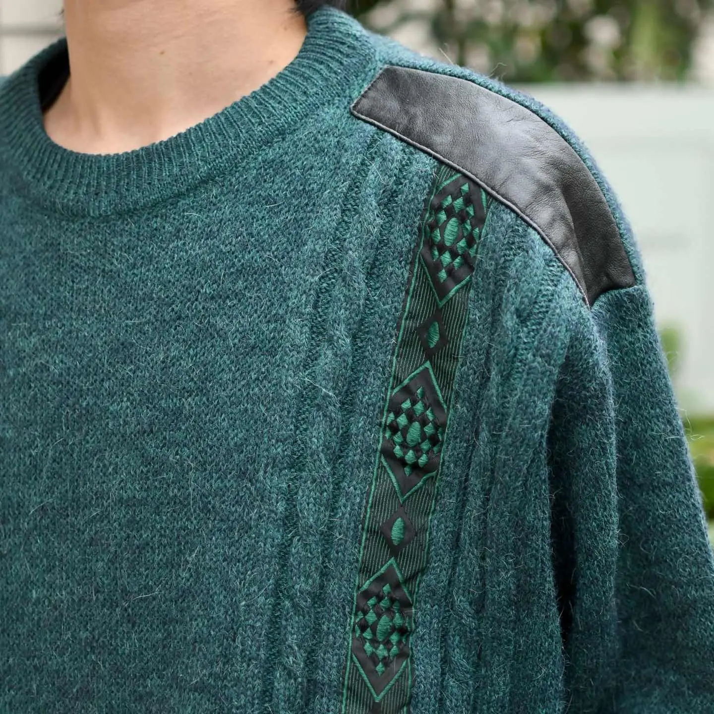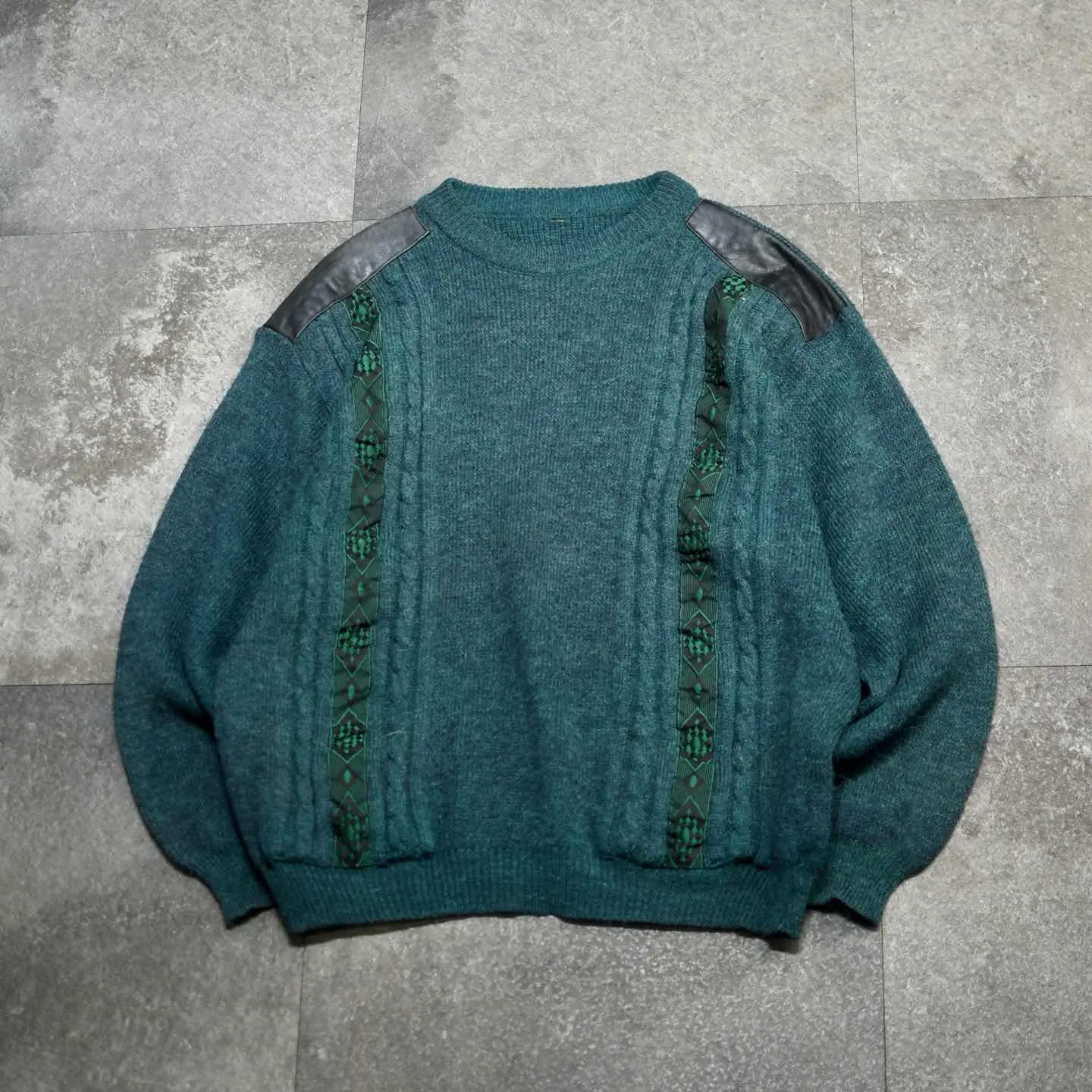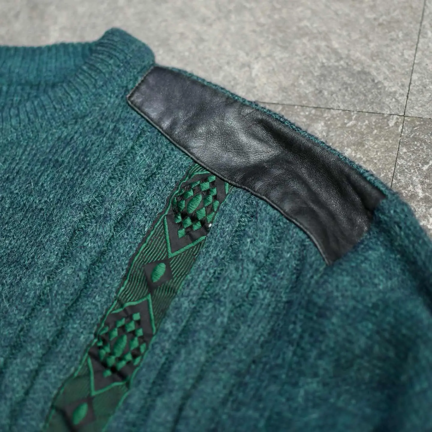 古着 アルパカ混 レザー 切り替え デザインニット ニット セーター グリーン