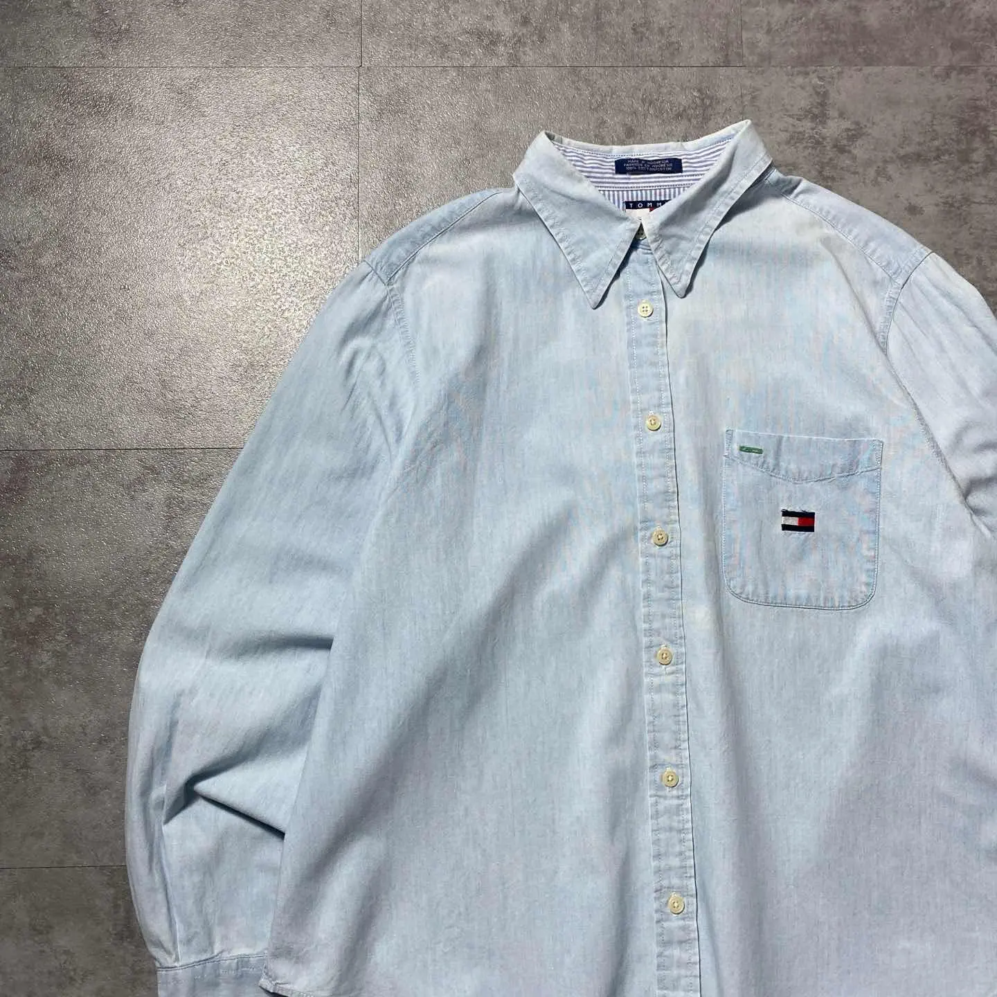 90s トミーヒルフィガー 刺繍ロゴ胸ポケット デニムブルー ボタンダウンシャツ