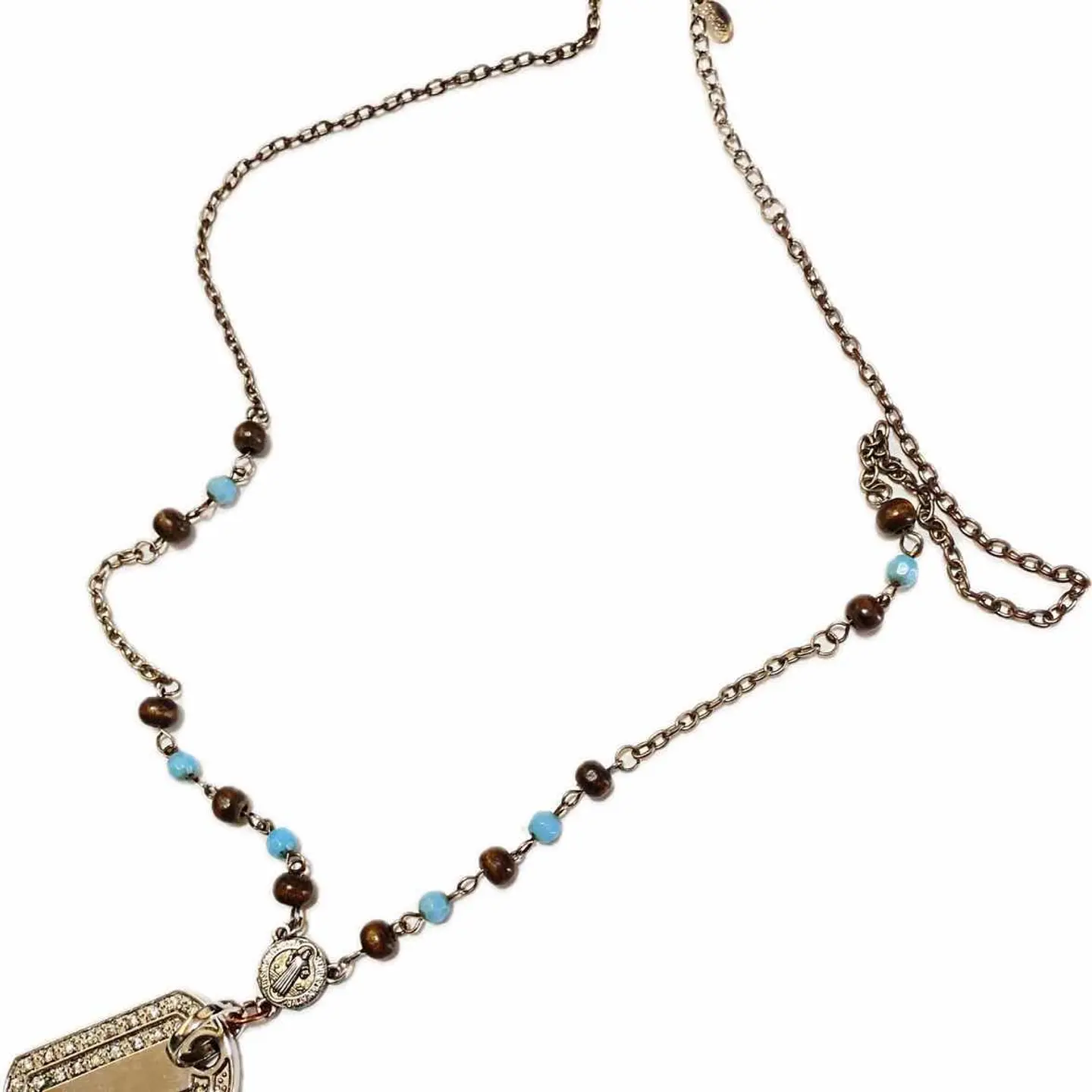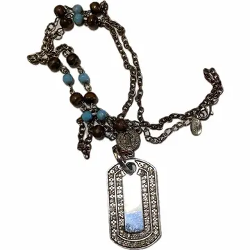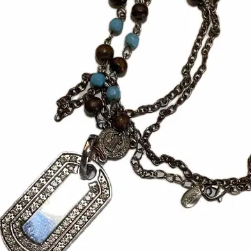 90s O.E.M.【特注】Opera necklace EXPLESS インポートブランドから依頼を受けて、日本が誇るセレクトショップが作ったOEM外注特注の意味オペラタイプのネックレスです。 ダブルネームといってもいいですね。ターコイズカラーのウッドとメタルプレートシルバー50ミックス しかも、ネックレスの中では、一番人気のオペラタイプ。オペラタイプとはミドルの長さのネックレスの事、 特質ポイントとしては刻印のかっこよさです。グランドクロスクロスとキリストがさりげなく刻印されており、さらにポンチでメタルにまでデザインがされているギミックの効いた最高級のネックレスをつければ、あなたのおしゃれは確実にかっこよくなります。 すべて取り扱い商品でコーディネートしました。1940年とか50年代のトラッドスタイルに合わせる感じで、タフに決めて欲しいです。 【カラー】 写真参照 【素材】 シルバーミックスメタル、 【状態】 よい、最高、磨きあげ、完了 #1点物 #ネックレス