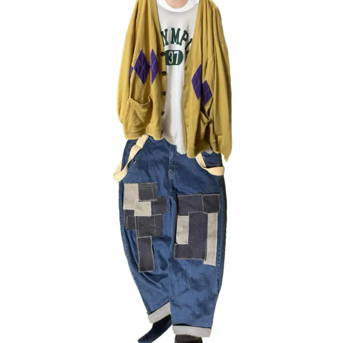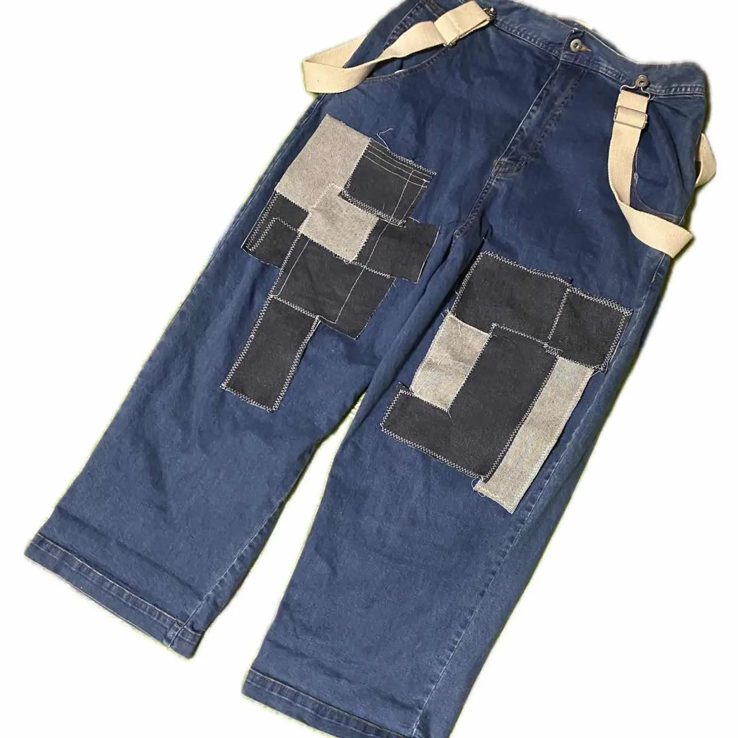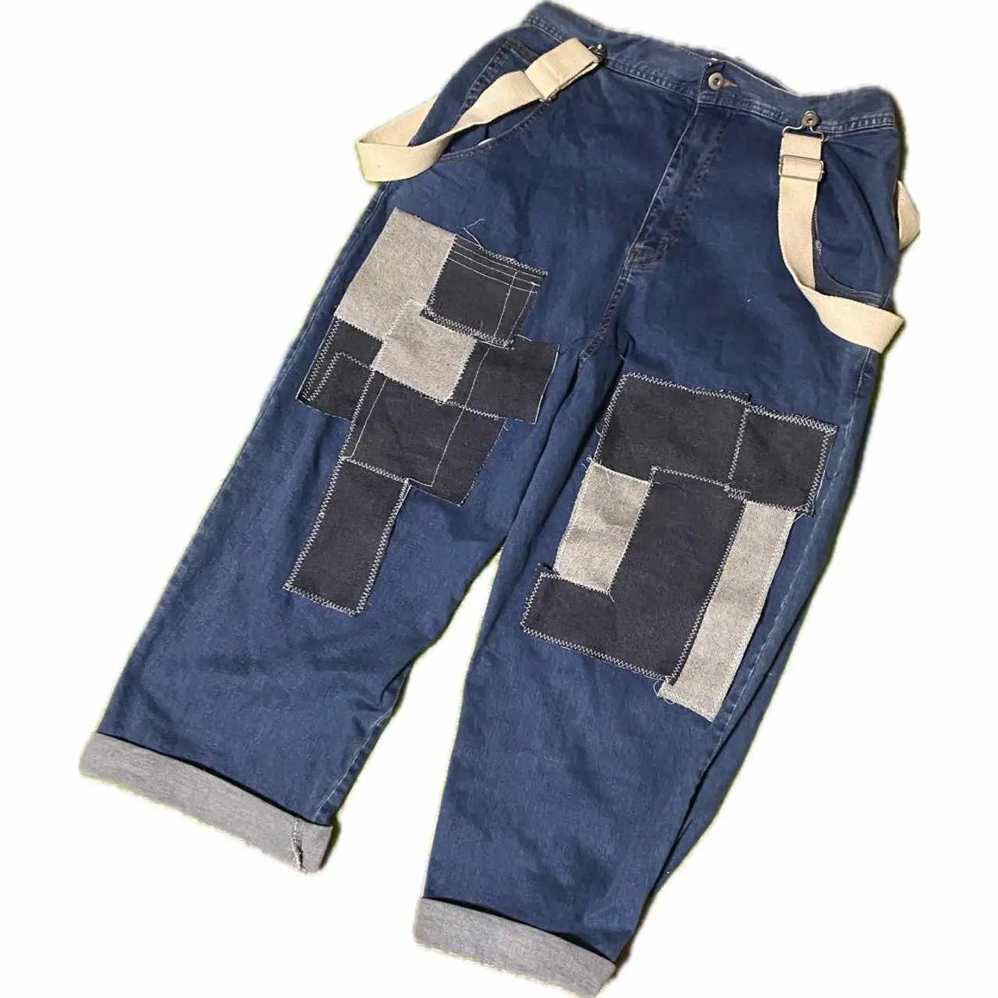 80-90s立体裁断 リメイク 18カム45no パッチデニム TRAD W85 18爪カム45no 立体裁断の美しいボトムを、もっと1950とかの、トラッドみたいな、カッコいい一本つくりたくてやりました^_^ デニムを何枚もマルチに画像通りつなぎ合わせさらにサスペンダーボタンは取り付け。ウェストのサイズを気にしなくて済むような1本に仕上げてますので、ウェスト85センチまでの人は確実に対応すると言うネットでサイズが心配と言う人にも向いています。 そんな事は正直どうでもよくてフロントに取り付けたジグザグミシンとかしてチャートまで施したデニムパッチは力作なのと コーディネートご覧くださいね。めちゃくちゃシンプルなカットソーですら、一気にこなれ感でる、計算、 例えば、冬にコートを着たときに、パッチアートが見える位置に計算しつく子して作成してますので、年中活躍しますし、シンプルな、 季節なら、かくじつに、こっちが、目を惹くのは間違いないです、さらに、 ゆるテパカーブに、立体裁断された、シルエットは、 ゆるってしてるのに、だらしなくなく、カッコいいです、 ラストせっかくサスペンダーボタンまで取り付けたんですから、サスペンダーはおまけでお付けします。それではリメイクは世界に1つなんで、 お気に召しましたら即ゲットください ▷color◁ 写真参照、 ※お使いのブラウザにより、色が異なって見える場合がございます、 ▷size◁ 平置き片面採寸【㎝表記】 表記sizeLくらいですが、サスペンダーあるので それ以外の方も対応また、僕も安全ピンで折り返しという技術使って、ベルトなしで着用してます 【※ウエストのみ、メジャーで一周採寸】 ウエスト85 股上38 股下64 腿渡り幅28 裾幅23 モデル170㎝/普通体型、30インチくらいいつも 着用な体型の私がゆるっと着用、 ▷material◁ デニム 生デニムみたいな、バキバキじゃないから快適かつ、年中いけます、 ▷condition◁ 最強に最高!これから育てる楽しみ抜群の一本!! ※入念にチェックは、しておりますが、vintage/usedの特性ご理解下さい #ゆるデニム #fudge #80sデニム