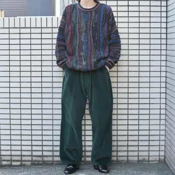 古着 ダークグリーン 太畝 コーデュロイパンツ ワイドパンツ スラックス 深緑