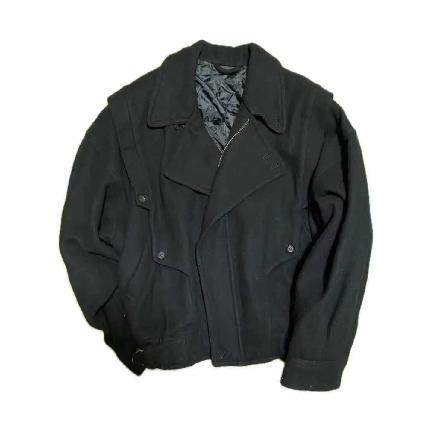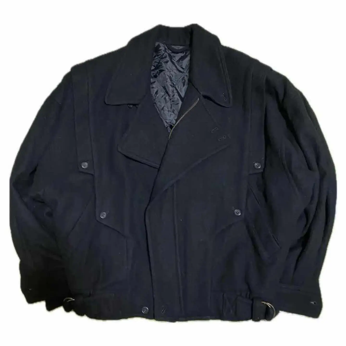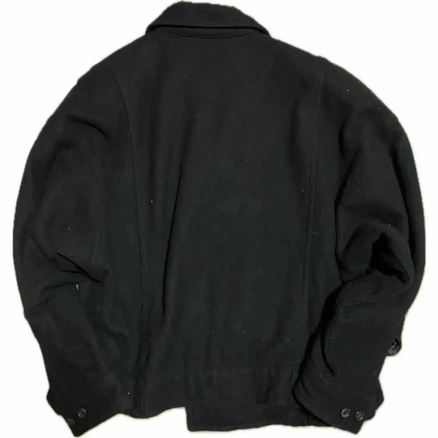 60-70s vintage melton ビックサイズ ダブルライダース、 どんなスタンスにもマッチするヴィンテージの魅力がふんだんに詰まったダブルライダースの紹介です。 ピュアウールを贅沢に70%もミックスして、もしこれがウール100だと真冬だけじゃないのって言う方いますよね。そこにレーヨン30%いれるギミック!!これが意味することわかります。虫食いのリスクがなくなるってことです。 さらに真冬だけではなく、春先もいけるって意味です。 さらにポイントとしてはそのありそうでない圧倒的なサイズ感です。ヴィンテージならではのサイズ感とワンタグと、言われる。ヴィンテージの証も全て残っており、しかも状態が美品!! ビックサイズのダブルライダースは確実に1着持っていると重宝するが保証いたします。 最近はアメカジストリートの方も取り入れてますね。あれもすごくかっこいいですが、大人気の雑誌ファッツ系もピタピタのライダースは全く推奨しません。確実にオーバーサイズです。 さらにもちろんですが、グランジだろうが、パンクだろうが、オーバーサイズっていうのは肩たらしや、重ね着様々な、スタンス対応!! どなた様もいろいろなサイズバランス遊びで楽しめるので、かなりオススメです。 お洋服を迷うときにポイントがあります。簡単に説明しときます。軽くネットで調べましたが、ネットで調べるとき不安なポイントまとめました。 1.サイズ 2.着回し 3.イメージとちがったら らしいです、 先ず、1.オーバーサイズ、はい、クリア 2.着回し抜群、よゆーでクリア 3.イメージと違ったら?? 逆イメージを、超える上質さ、はい、悩むひつようすらないっすね。 ▷color◁ 大人気のブラック ※ブラウザで異なる場合ありますがかなり実物には、近づけてます、 ▷size◁ 平置き片面採寸【㎝表記】 表記size M表記だが、明らかにFです!! 着丈/72 身幅/69 肩幅/67DSbox 袖丈 /64↓ DSは袖はハンガー採寸 ※多少の誤差は理解下さい 170/Mジャスト体型の私が着て、✔️参考に ジャスト オーバーサイズ ビックサイズ✔︎ 丈は、トレンド、 【素材】 ピュアウール70 レーヨン30※これがポイント、真冬だけではない、 【状態】 良い、パーフェクト!!