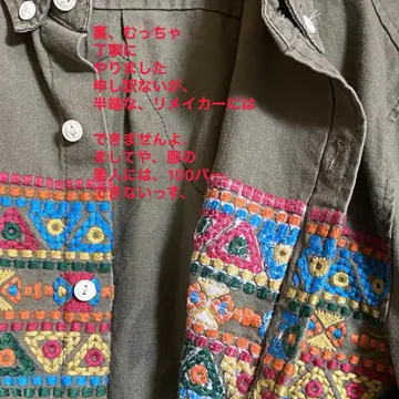 70s R.B.U シャツ リメイク猫目ボタン オルテガ 刺繍 Fメイソン R.B.U先ずこの希少価値を説明します。 R real B battle U uniform の、意味、軍が、本格的な、戦闘のさい 使うシャツ、vintagepointと、リメイクpointは、写真に載せてますが、 まず、リストスリーブなのも理由が、あります、戦闘の際Lスリーブだと、ひっかかりが、出る場合あるから、さらに、チンストでほこりある、だらしなさなく、BD.これも前項と一緒、で、猫目ボタン 70sミリタリーにおおい、これは、着脱素早くできるから、 です、 それを、フロントネイティブ刺繍 、オルテがガンアート バックバンダナに、 バティグ フリーメイソンアートを、岡山denim hickoryペインターで、コーデ、パーフェクト!!年中活躍間違いなし!! ※近年増えすぎの、リメイクにまで、最安値求める方は、ご自分で、やれるもんなら、作って下さい、 刺繍うてます??アートできます??さすがに、手前は、理解下さいね! ▷カラー◁ 写真通り ▷size◁ 平置き片面採寸【㎝表記】 表記size Lを使用しました、 着丈75 身幅57 膚幅50 袖丈59 シルエット、襟で完全70sですね、 DSは袖はハンガー採寸 ※多少の誤差は理解下さい 170センチ Mジャストの私が、着用してゆったりです、インナーXL着てます参考に 【素材】 コットン 【状態】 最高級、丁寧にリメイクしたんで、 検品、洗濯、検品で、3回チェックして発送しますので、ご安心して、お買い求め下さい!!