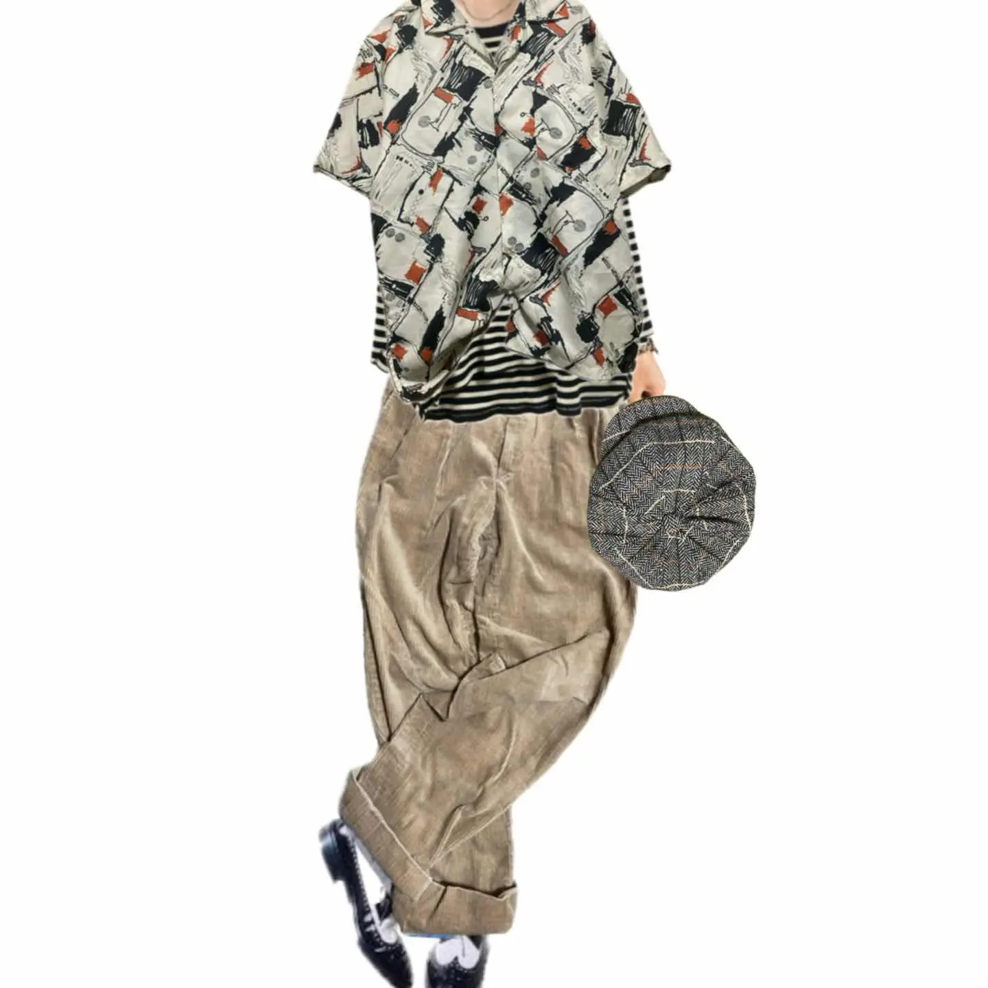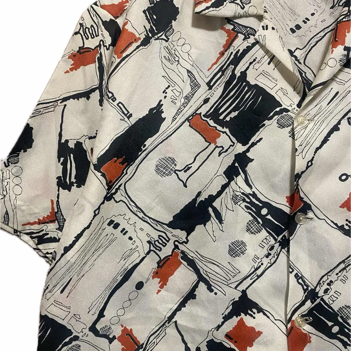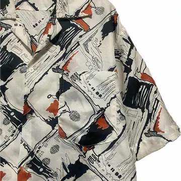 70-80s 【美品】特注 サイケデリック 幾何学 tradシャツ L 1940年から1950年にかけて流行ったオールドアメリカン、またはレトロアメリカンと言われるスタイルを70年から80年にかけてオーダーメイドしたと思われるシャツです。理由は簡単です。マテリアルタグはすでに義務化されてるのに、それが一切ないのはオーダーメイド さらにシルエットですね。70年代の鋭い襟の形を残しつつ、脱力感のある身幅とちょいドロップショルダー80年代の初期の形が混じっていますので、70年から80年と簡単に推測できます。 音楽と。ファッションの融合が素晴らしかった時代のシャツ。ぜひ、ご自分のスタンスで、お楽しみ下さい 今回は、私は、オールドアメリカンスタイルにしました!! ▷color◁ 写真通りサイケデリックな、geometry【幾何学柄】 ※ブラウザで異なる場合ありますがかなり実物には、近づけてます、 ▷size◁ 平置き片面採寸【㎝表記】 表記size Lくらい採寸判断 ですが、人によりますが、XLもいけそう 着丈/75 身幅/58 肩幅/50DS 袖丈 /30 DSは袖はハンガー採寸 ※多少の誤差は理解下さい 170/Mジャスト体型の私が着て、✔️参考に ジャスト オーバーサイズ✔︎、 ビックサイズ 【素材】 おそらくポリですが、凹凸タイプで、かなり、着心地よい、 【状態】 美品 検品、洗濯、検品で、3回チェックして発送しますので、ご安心して、お買い求め下さい!!