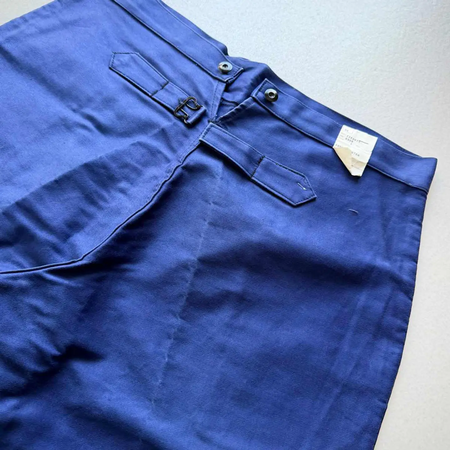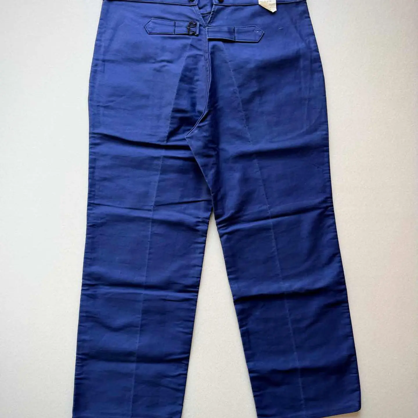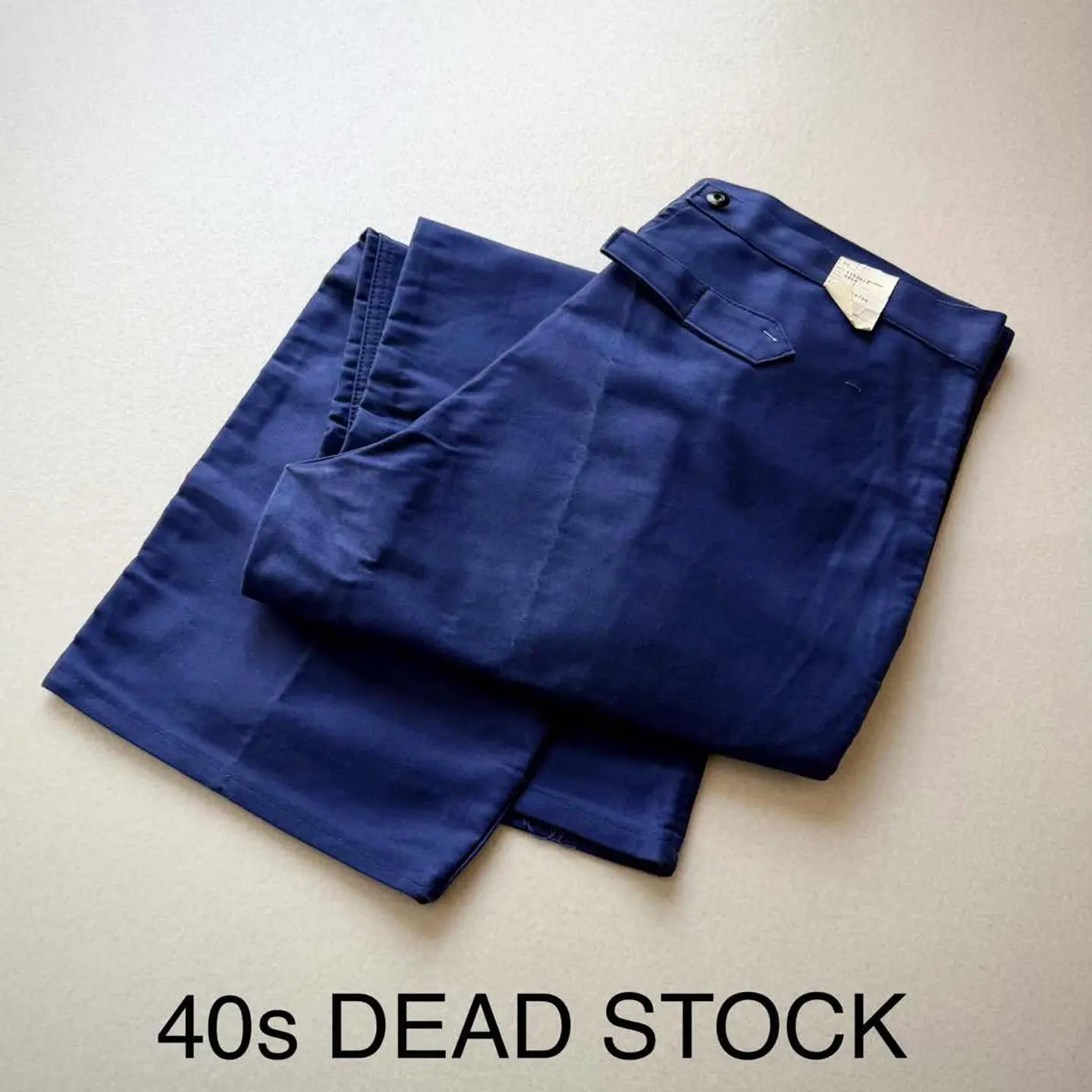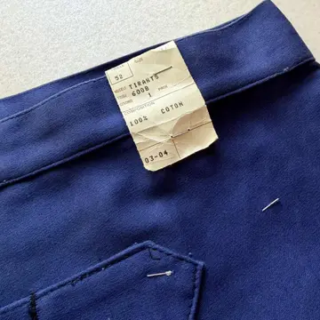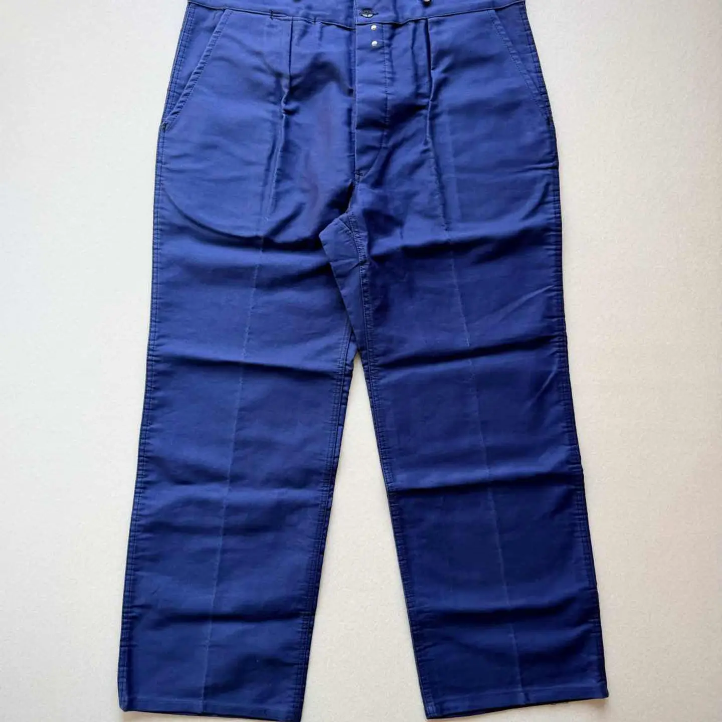 【 商品説明 】 DEAD STOCK 40s〜 “ MONT-ROUGE ” BUCKLE BACK MOLESKIN WORK TROUSERS FRENCH VINTAGE 。 フランスワークウェア黄金期と称され古くは18世紀頃から続く意匠を継承したお馴染みのデザインで絶大な人気を誇るFRENCH WORK MOLESKIN TROUSERS 。 フロントはフック付きボタンフライにスラッシュポケット、バックサイドは特徴的な針刺しのバックルバックに黒ラッカーサスペンダーボタンと古いディテールを兼ね備えた希少なVINTAGE 。 着用する度に風合いが増し経年変化も楽しみなモールスキンの素材感にフレンチブランドとしては安定の《 MONT-ROUGE 》、やや大きめなサイズですがコレクションとしても相応しい貴重なDEAD STOCK、お好きな方は是非この機会にいかがでしょうか。 商品名 : 40s〜 BUCKLE BACK MOLESKIN PT ブランド : MONT-ROUGE サイズ : 52 ※ 平置き実寸 ウエスト ー 49 ※ シンチバックにて多少調整可 レングス ー 76 裾幅 ー 26.5 総丈 ー 109 ※ 多少の誤差はご了承下さい 素材 : COTTON 100% 【 商品の状態 】 DEAD STOCK.タグ付き未使用の綺麗な状態になります。 あくまで長期保管品になりますので、経年変化やクスミ.薄汚れ等はご了承下さいますようお願い致します。 その他,経年により折り目跡が僅かに見受けられますが、着用に支障のある目立つような汚れや大きなダメージ等は見受けられません。 古着,ビンテージ慣れされている方であれば問題無い程度、まだまだ充分着用していただけると思います。 注意事項 : ※ usedビンテージ等にご理解いただける方のみお願い致します。 細かくチェックはしていますが、細かい見落し等,全ては記載できませんのでご了承下さい。 個人保管品のため、記載以外のわずかなシワ・小キズ・薄よごれ・経年の劣化・擦れ等がある場合がございます。 あくまで個人保管のコレクション品ですので、完璧品を求められる方・神経質な方、評価の悪い方はご入札をお控えください。