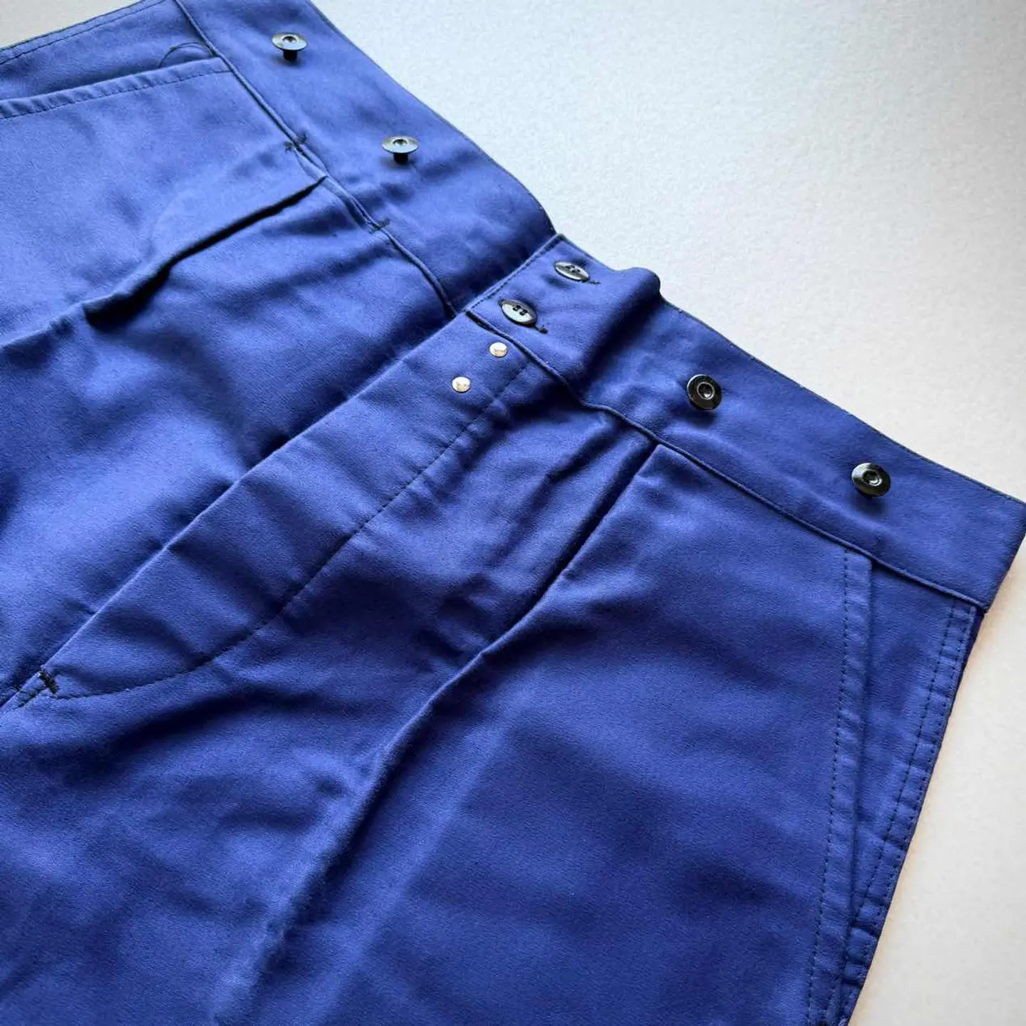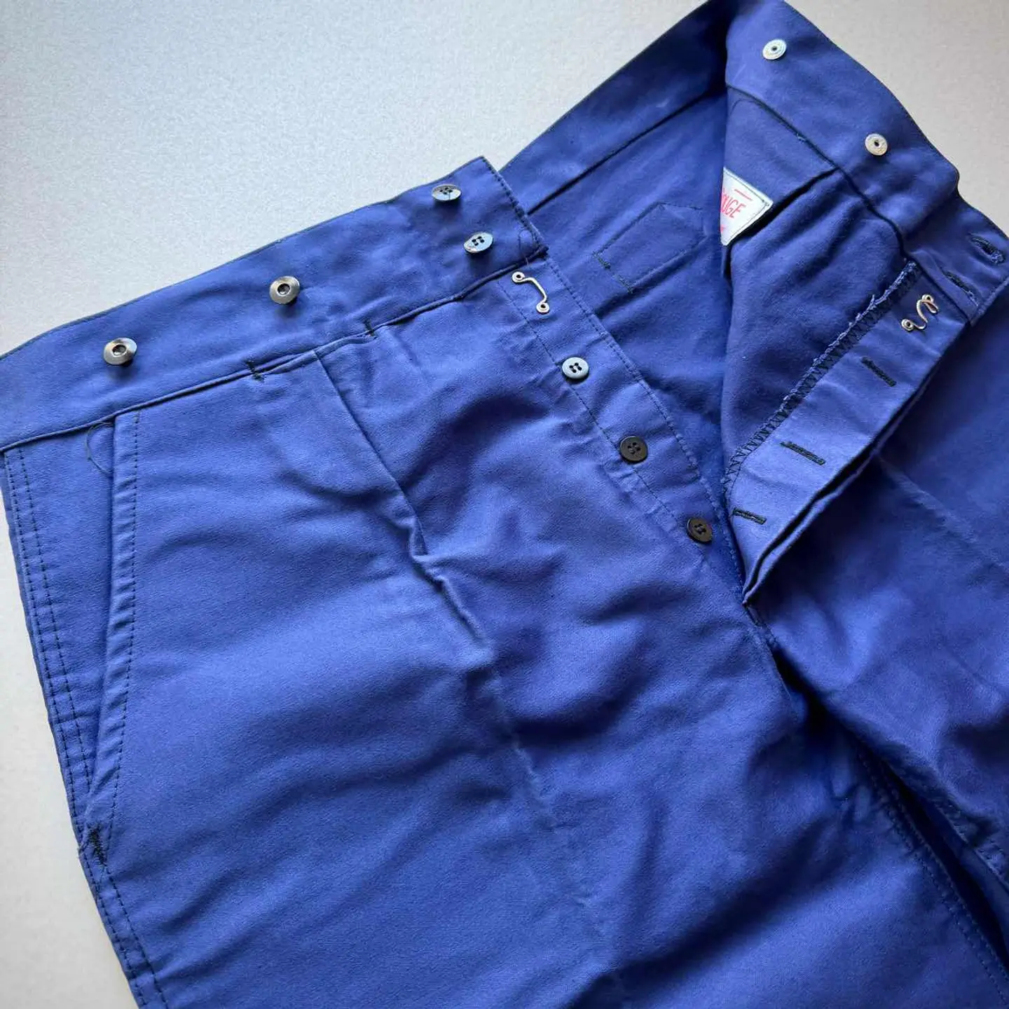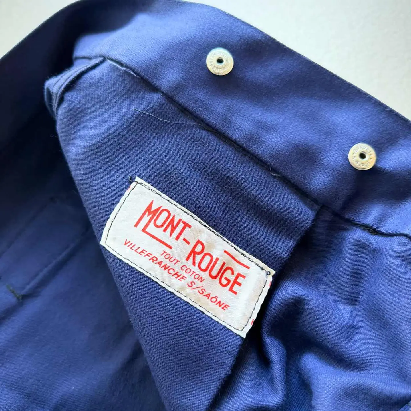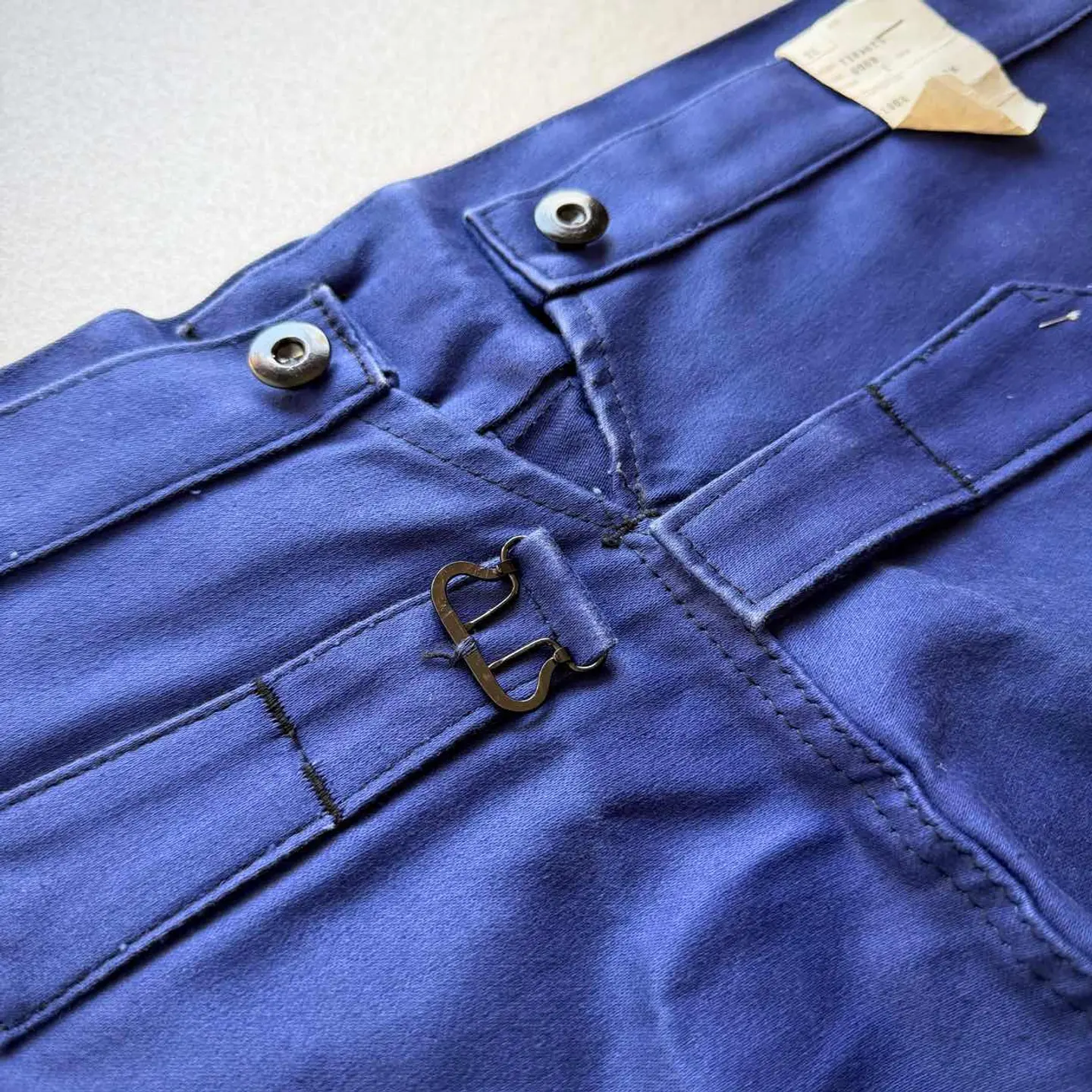 【 商品説明 】 DEAD STOCK 40s〜 “ MONT-ROUGE ” BUCKLE BACK MOLESKIN WORK TROUSERS FRENCH VINTAGE 。 フランスワークウェア黄金期と称され古くは18世紀頃から続く意匠を継承したお馴染みのデザインで絶大な人気を誇るFRENCH WORK MOLESKIN TROUSERS 。 フロントはフック付きボタンフライにスラッシュポケット、バックサイドは特徴的な針刺しのバックルバックに黒ラッカーサスペンダーボタンと古いディテールを兼ね備えた希少なVINTAGE 。 着用する度に風合いが増し経年変化も楽しみなモールスキンの素材感にフレンチブランドとしては安定の《 MONT-ROUGE 》、やや大きめなサイズですがコレクションとしても相応しい貴重なDEAD STOCK、お好きな方は是非この機会にいかがでしょうか。 商品名 : 40s〜 BUCKLE BACK MOLESKIN PT ブランド : MONT-ROUGE サイズ : 52 ※ 平置き実寸 ウエスト ー 49 ※ シンチバックにて多少調整可 レングス ー 76 裾幅 ー 26.5 総丈 ー 109 ※ 多少の誤差はご了承下さい 素材 : COTTON 100% 【 商品の状態 】 DEAD STOCK.タグ付き未使用の綺麗な状態になります。 あくまで長期保管品になりますので、経年変化やクスミ.薄汚れ等はご了承下さいますようお願い致します。 その他,経年により折り目跡が僅かに見受けられますが、着用に支障のある目立つような汚れや大きなダメージ等は見受けられません。 古着,ビンテージ慣れされている方であれば問題無い程度、まだまだ充分着用していただけると思います。 注意事項 : ※ usedビンテージ等にご理解いただける方のみお願い致します。 細かくチェックはしていますが、細かい見落し等,全ては記載できませんのでご了承下さい。 個人保管品のため、記載以外のわずかなシワ・小キズ・薄よごれ・経年の劣化・擦れ等がある場合がございます。 あくまで個人保管のコレクション品ですので、完璧品を求められる方・神経質な方、評価の悪い方はご入札をお控えください。