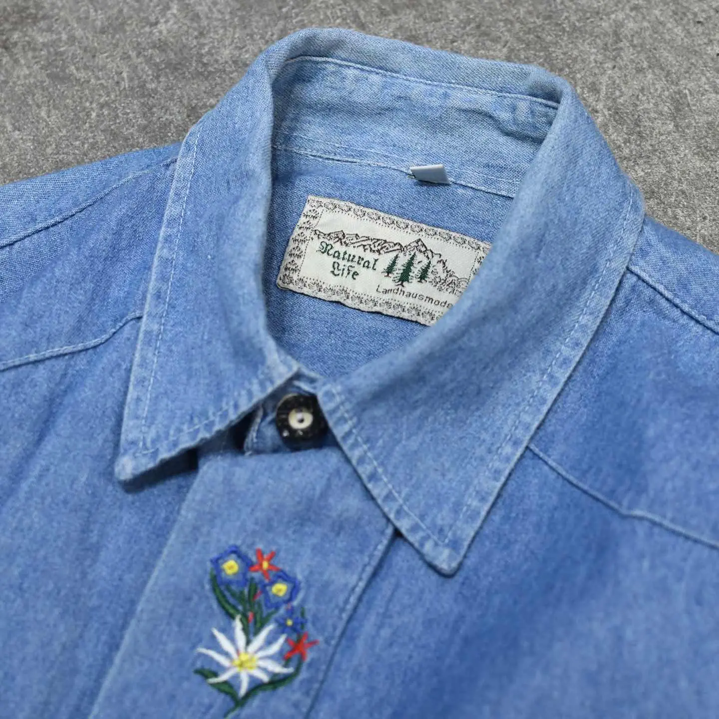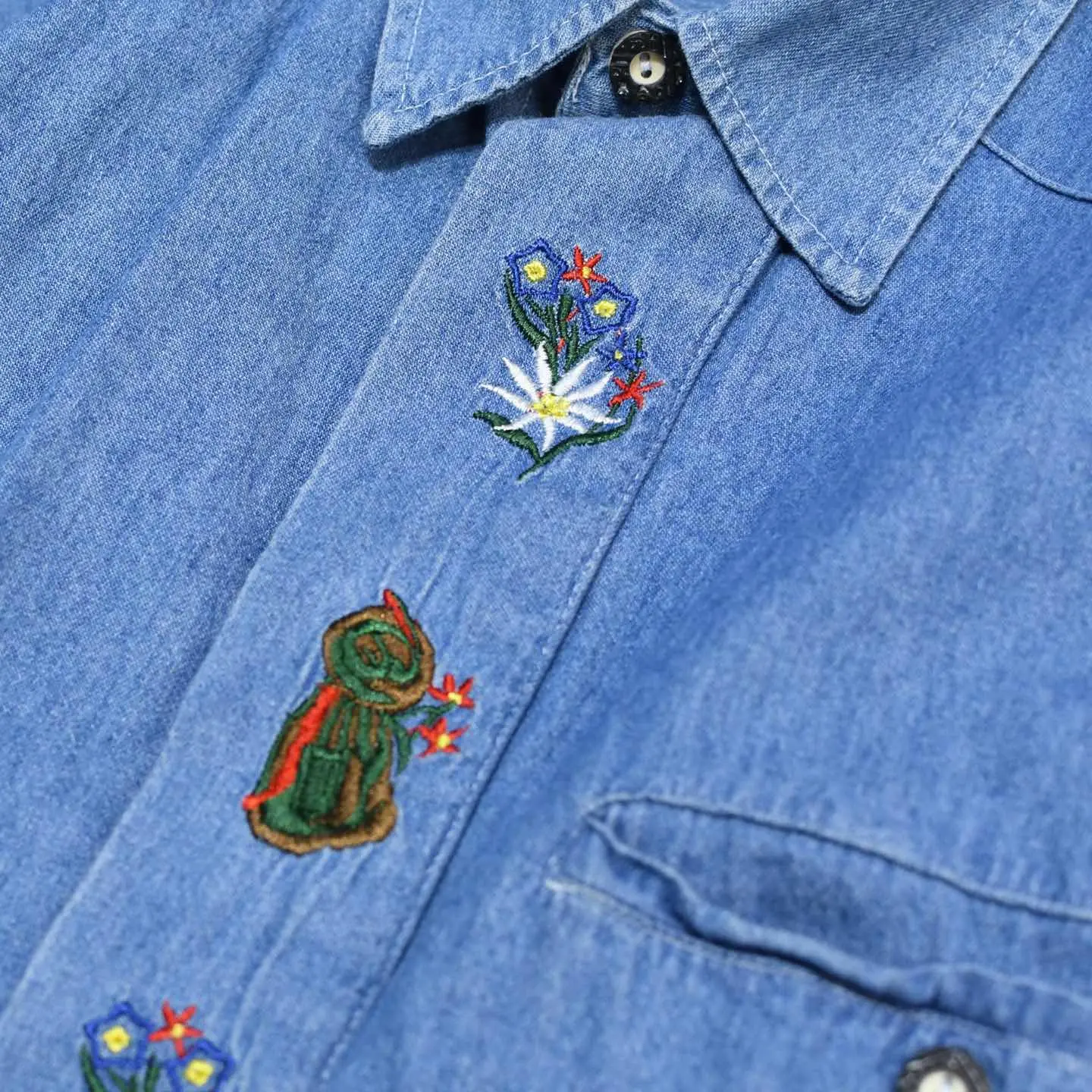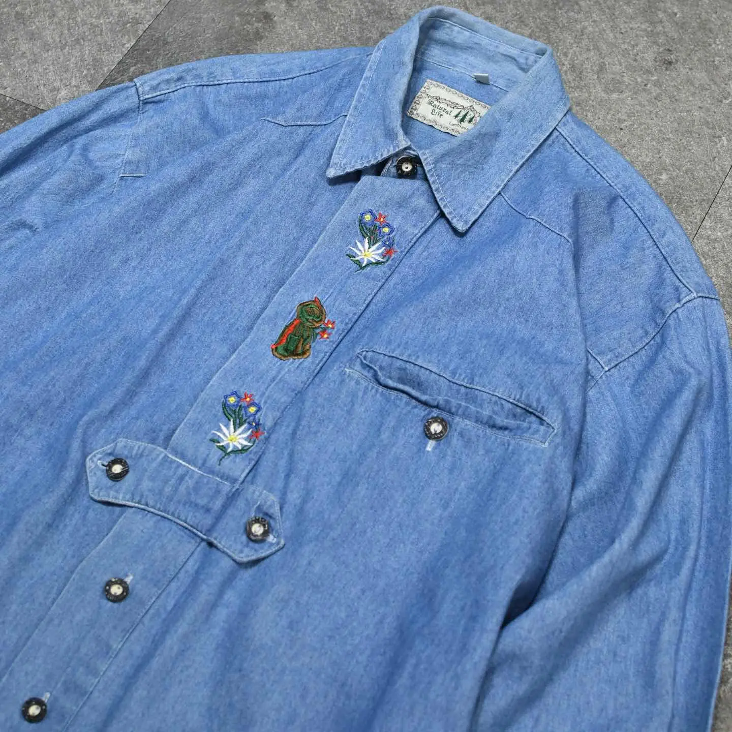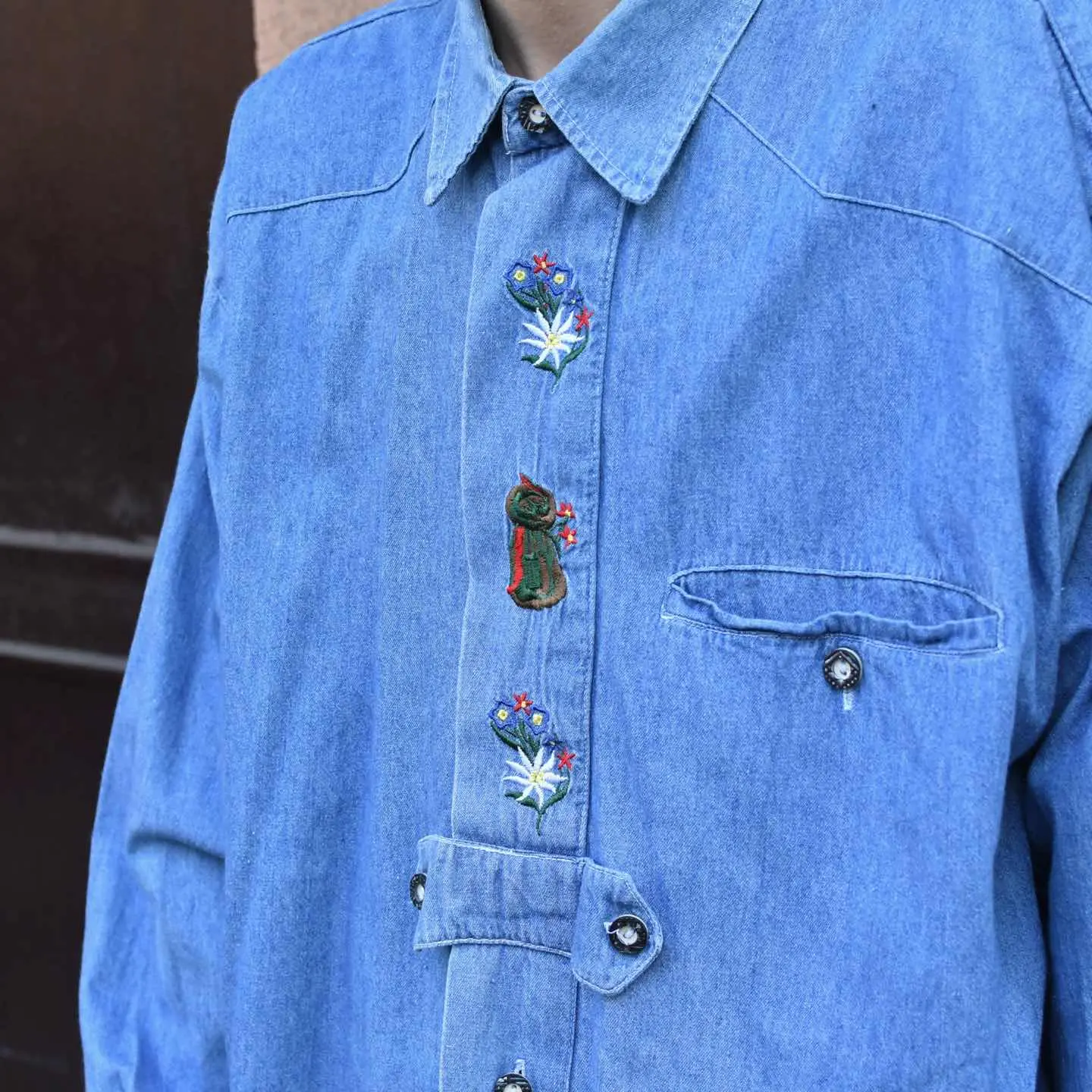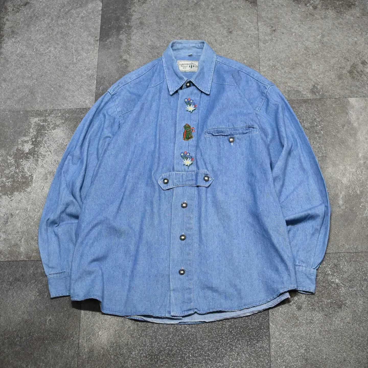 古着 チロリアンシャツ デニムシャツ デザインシャツ 刺繍 ブルー 青