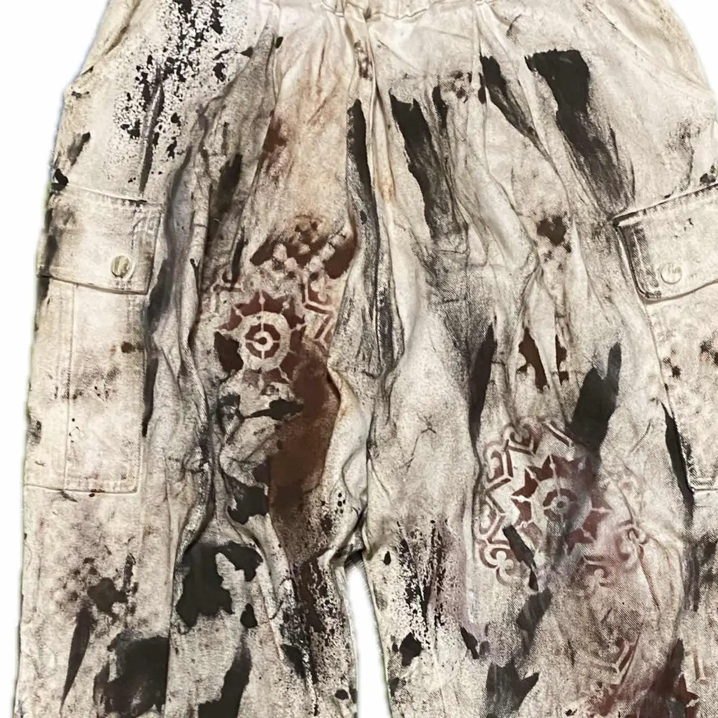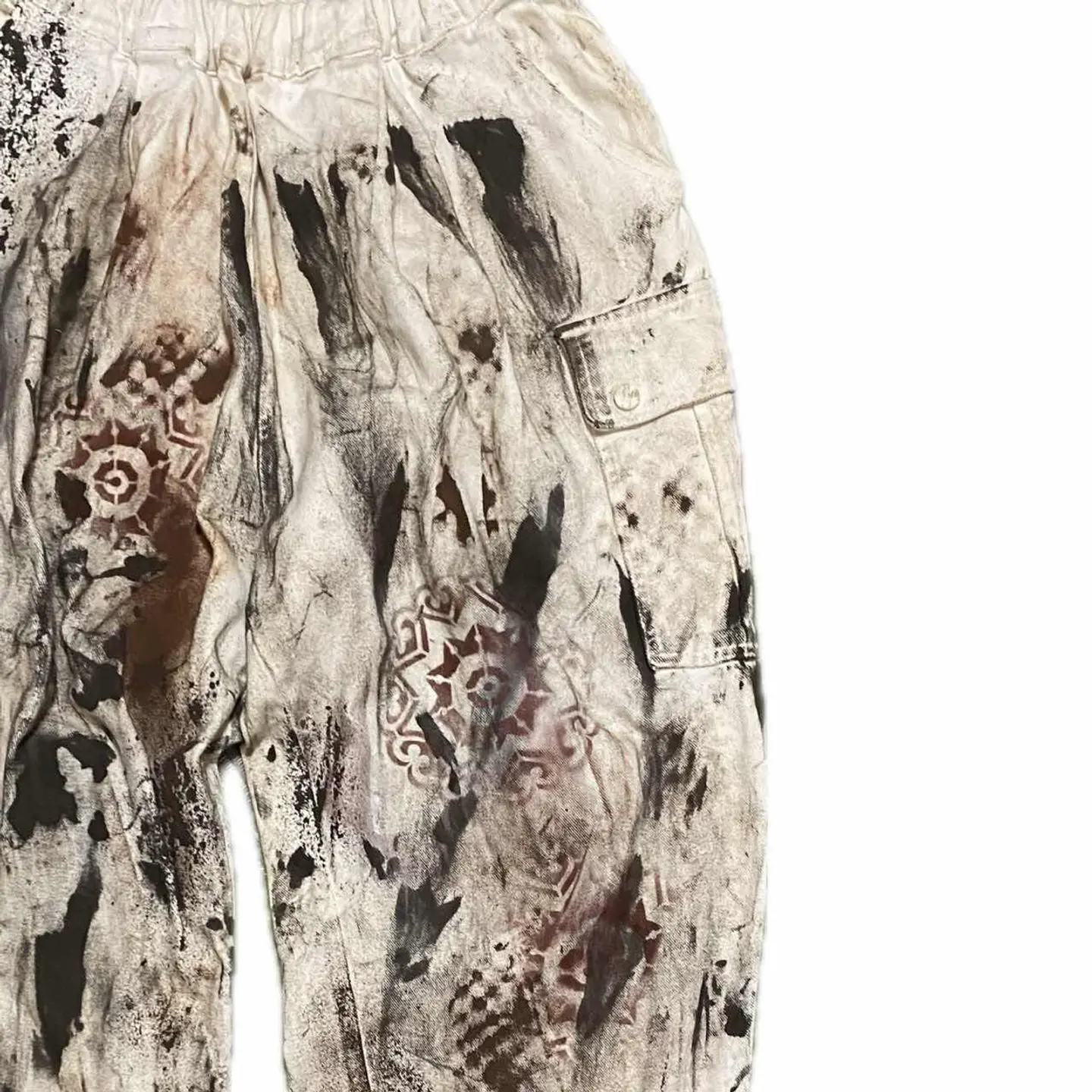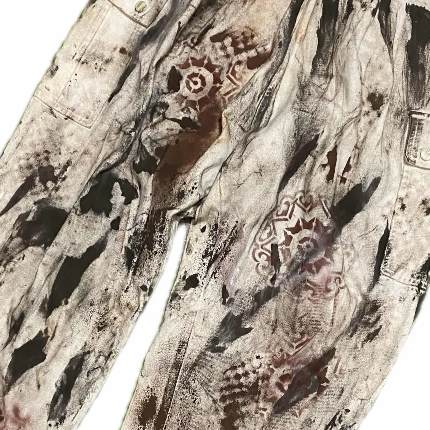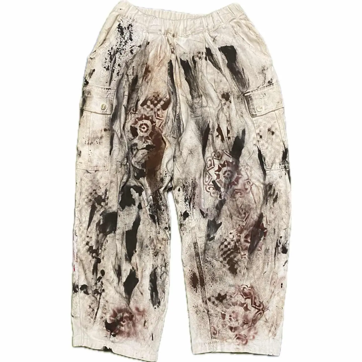 90s W66-90対応 リメイク トラッドペイントリメイクボトム まるで何年も愛用して育てたかの様な、トラッド感を出したペイントリメイクなのですが、使ったボトムが90年代ヴィンテージのデッドストックナチュラルカーゴと言われる綺麗めに向けた 1stを、遠慮なくエモーショナルに感情のままに仕上げた一本となります。このタイプのボトムは、とことんシルエットが洒落感があり ベルトレスでも行けるので、めちゃくちゃフットワークも軽く手間もなく愛用すること間違いないのですが、 ただのホワイトはつまらないなと思い、TRAD汗を出したくてペイントリメイクしました。ランダムにやってるように思われるかもしれませんが、よく見てくださいね。様々なアートを施しております。シャドウステンシルアート施してますので、よーく見ると様々な形が見えてかなりかっこいい一本となっております。コーディネート見ればわかると思いますが、足元はスニーカーでもブーツでもオッケーです、ただ、 お気に入りのキャスパー、ジョンのただの無地のトップスがこんなに入るのはこのボトムの破壊力なんです。それを参考にいただきましたらご購入よろしくお願いいたします。 【カラー】 トラッドフェードアート ▷size◁ 平置き片面採寸【㎝表記】 表記sizeLくらい 【※ウエストのみ、メジャーで一周採寸】 ウエスト66-90対応Lとしときます 股上33 股下64 股下短いと勘違いする方へ、股上深いだけですよ、理由ハイウエストも決めれるようです、 腿渡り幅30 裾幅23 モデル170㎝/普通体型、30インチジャストな体型参考に、 ▷material◁ バイアスcotton ▷condition◁ カッコ良くしあげて、最高です^_^ ※入念にチェックは、しておりますが、vintage/usedの特性ご理解下さい