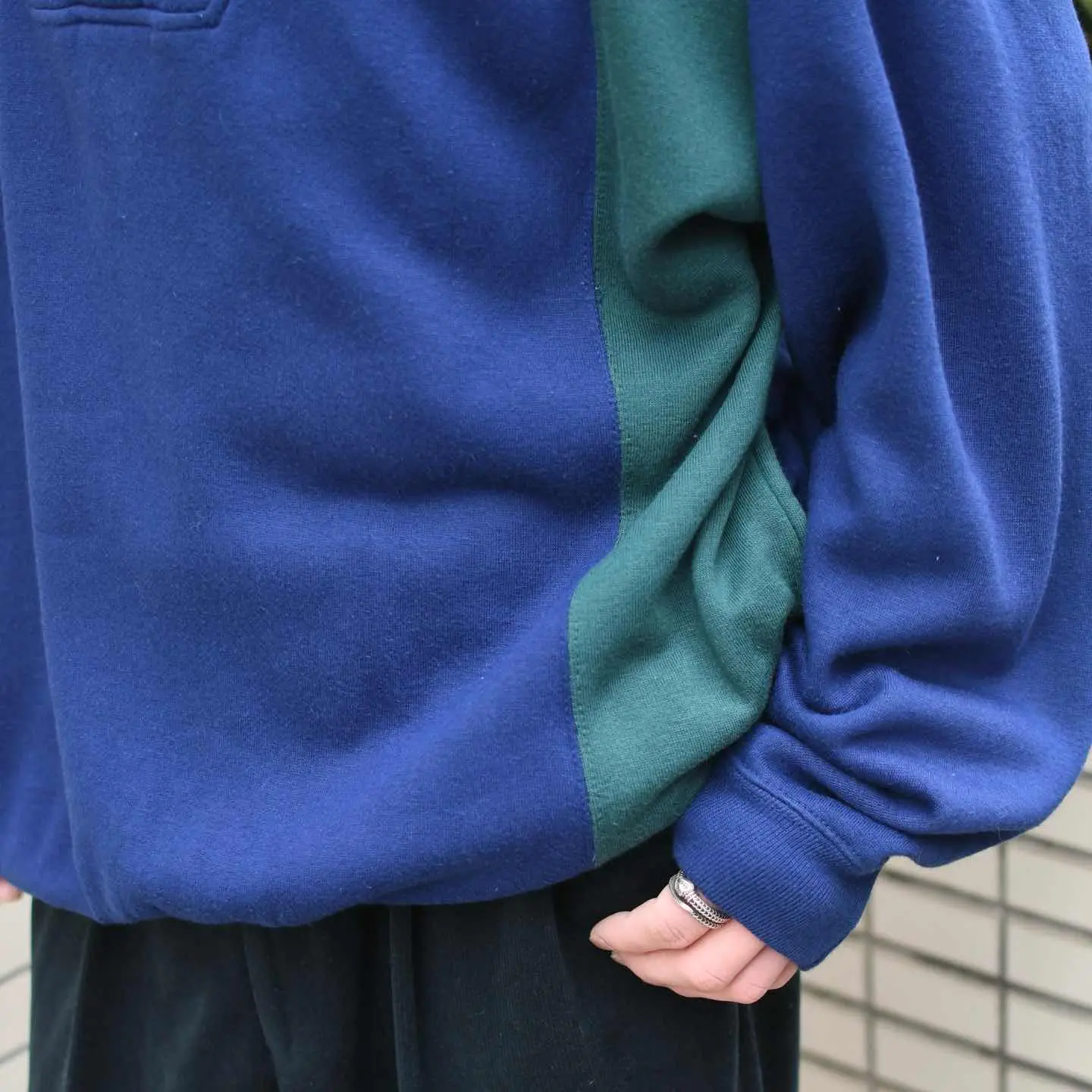 古着 切り替え ヘンリーネック デザインスウェット パーカー フーディ ネイビー