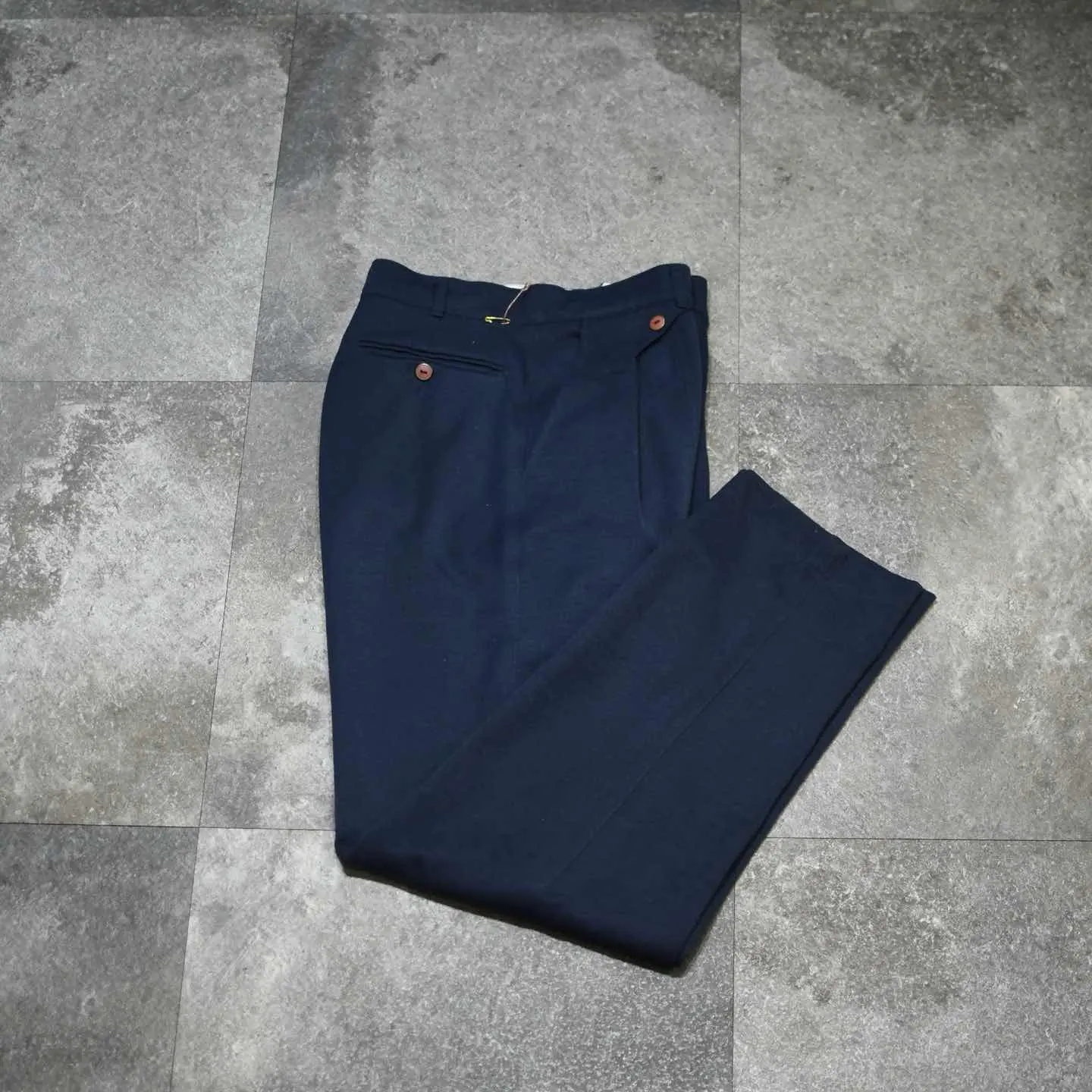 SIZE:40 ウエスト78cm 総丈112cm 股下82cm わたり38cm 裾幅22cm fabric/poly・viscose made in france 着用画像 173cm/58kg ウエスト周りの特徴的なディテールと、 センターシーム、しっとりとしたレーヨン混の ツイル生地。 こちらは太さを求めるスラックスではなく、 美しさ、個性を求めるスラックスという 立ち位置で活躍するのではないでしょうか。 ゆったりとしたわたりから裾にかけて テーパードし、足元に溜まるシルエット。 原点に戻ったような、スラックスらしい シルエットで、繊細で上品な発色を兼ね備えた 1本です。 善し悪しが分かりにくく、ディテールに 個体差の少ないカテゴリーだからこそ、 こんなスラックスに惹かれるのではないでしょうか。 ※裾上げ等のレングス直しにつきましては、 購入前に、必ずご連絡お願い致します。 ※撮影状況により、実物と多少色が異なる 場合がございます。 ※古着を取り扱っているため、気づかない汚れや ほつれがある場合がございます。 ※サイズは着用感で選んでおり、 表記サイズは説明欄の最初に記載しております。 old vintage ヴィンテージ used 80's 90's アメリカ古着 ユーロ古着 POLO RALPH LAUREN Eddie Bauer OLD GAP LANDS' END ランズエンド LLBean エルエルビーン オールドギャップ エディーバウアー ラルフローレン ブルックスブラザーズ Brooks Brothers テーパード などがお好きな方 #vintage #old #used #90s #80s #古着 #ヴィンテージ #oldgap #オールドギャップ #LANDSEND #ランズエンド #ラルフローレン #POLORALPHLAUREN #ブルックスブラザーズ #BrooksBrothers #スラックス #タックパンツ