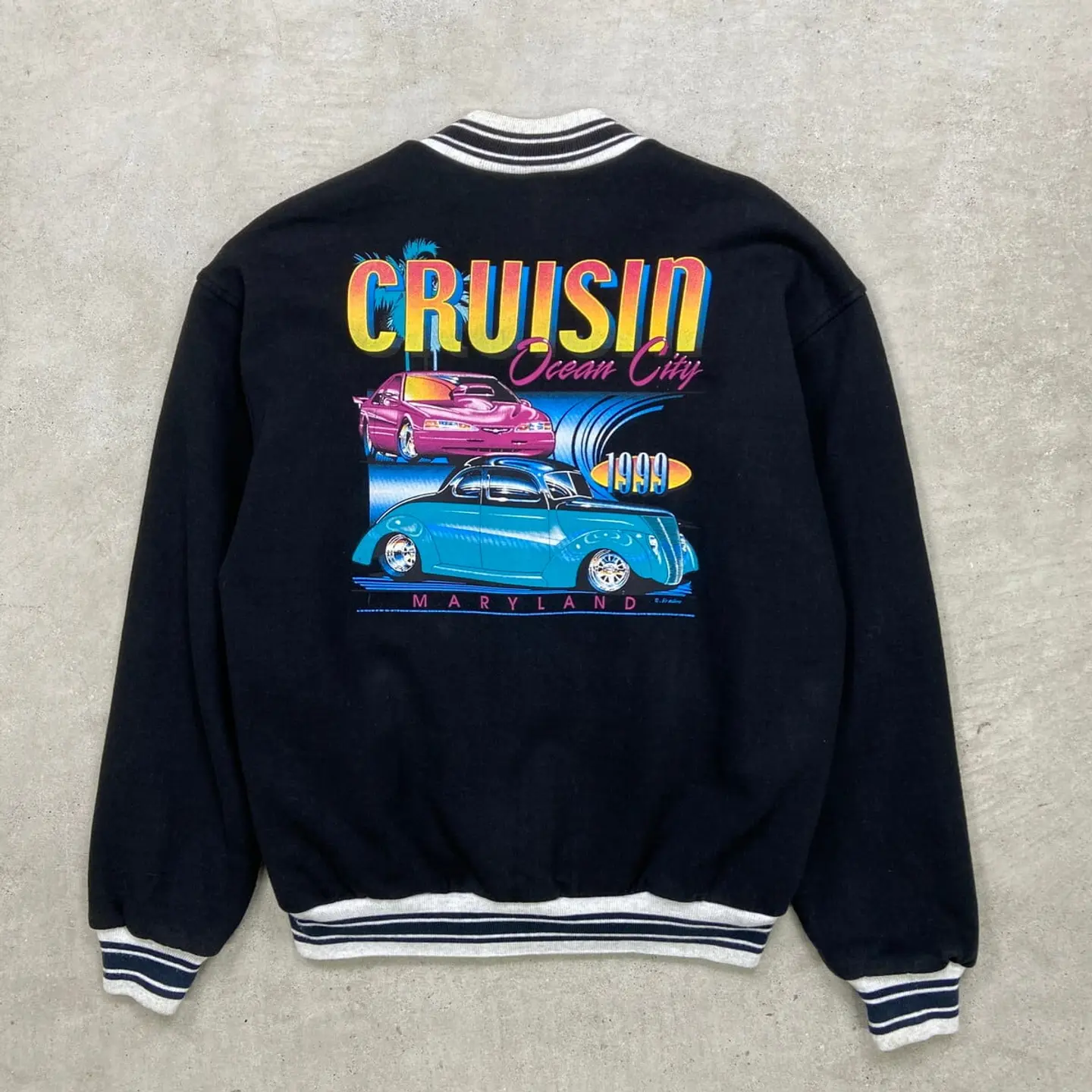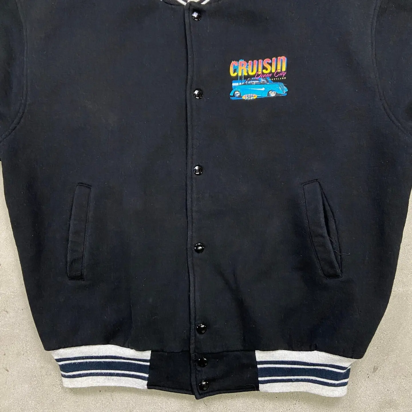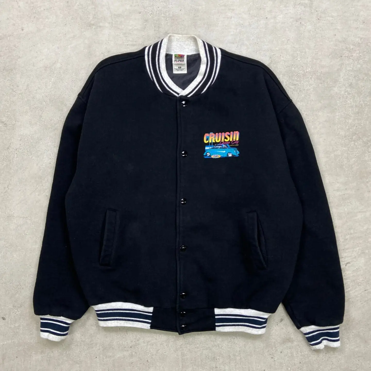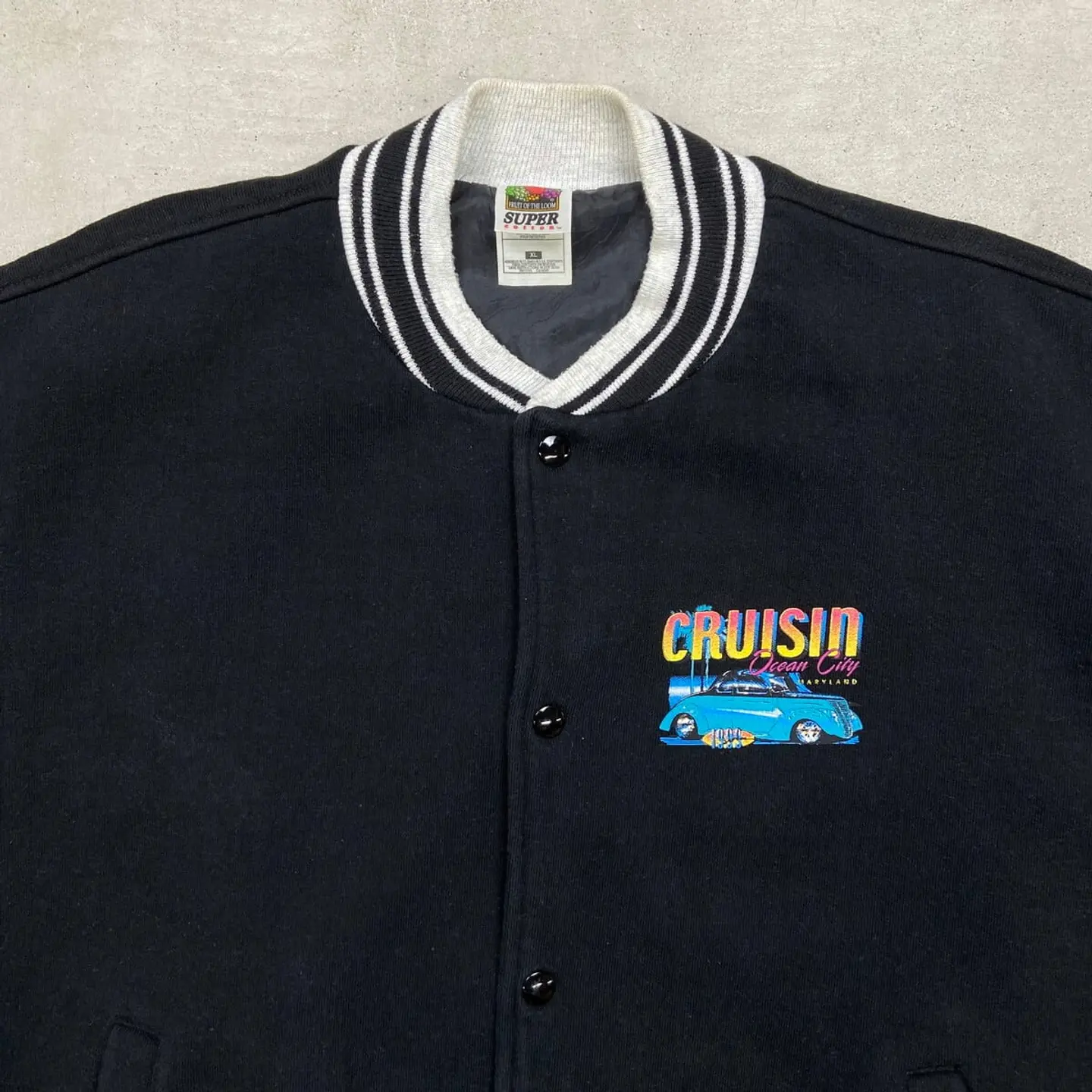 ■90年代 CRUISIN Ocean City コットンスタジャン メンズXL 古着 90s VINTAGE ヴィンテージ アメカジ リブボーダー 車 クラシックカー MARYLAND 杢グレー 黒色【P2603】【ブルゾン・ジャケット】/ブラック 【ブランド】FRUIT OF THE LOOM 【サイズ】表記 XL ※計測値をご確認ください。 着丈…68.5 身幅…68 肩幅…60.5 袖丈…65 【生産国】コロンビア製 【素材】コットン88%、ポリエステル12% 裏地 ナイロン100% 【状態】多少の毛羽立ちがあり、使用感はありますが 目立ったダメージや汚れはなく、まだまだ愛用していただけます。 画像にてご確認ください。 【j260319112】 ※古着は洗濯、検品などのケアを行っております。(新品・デッドストックは洗濯していません。) ※モニターの発色により実物と異なる場合がございます。予めご了承ください。 ※ 海外直輸入USED品になります。
