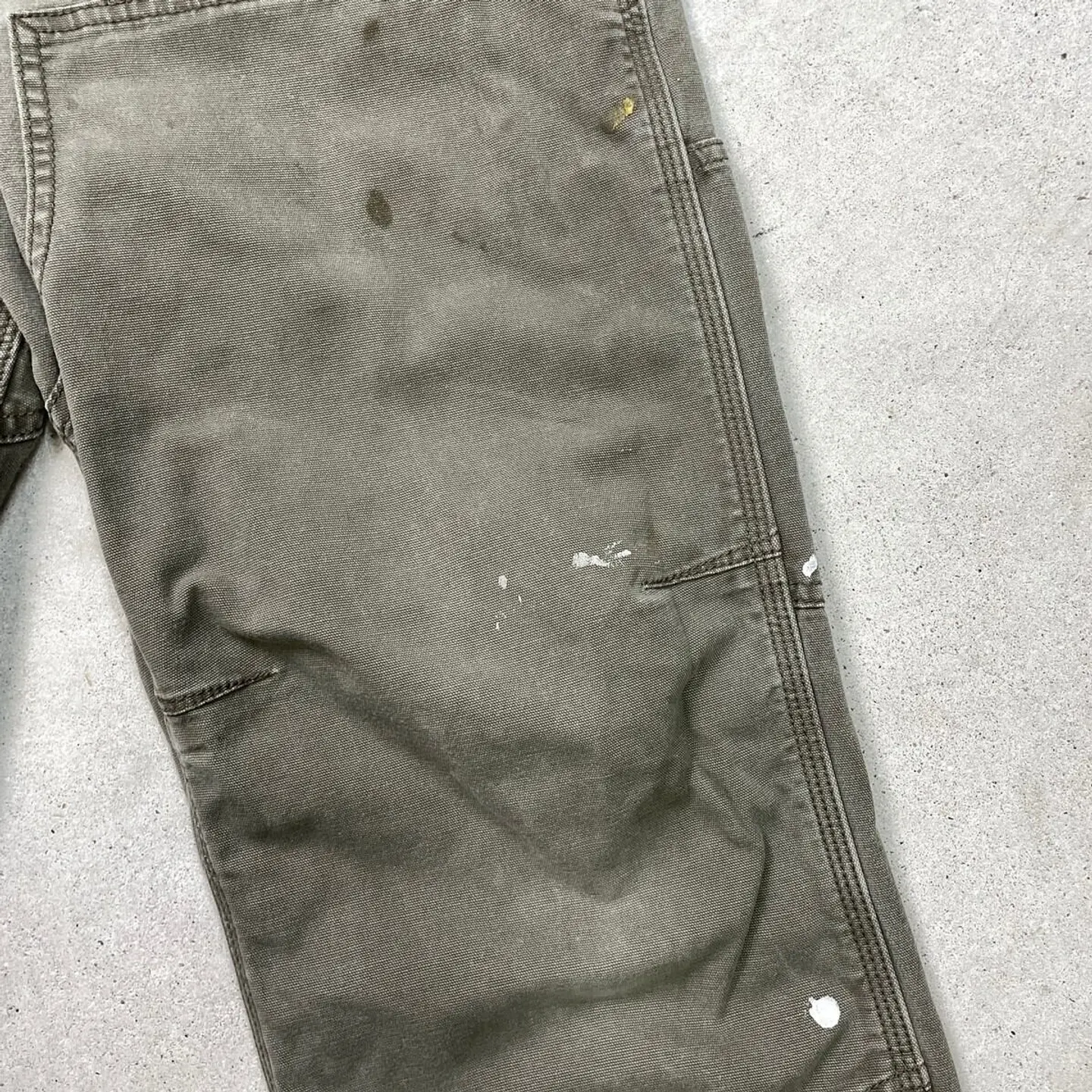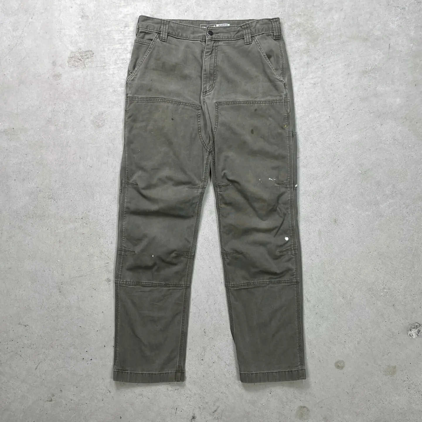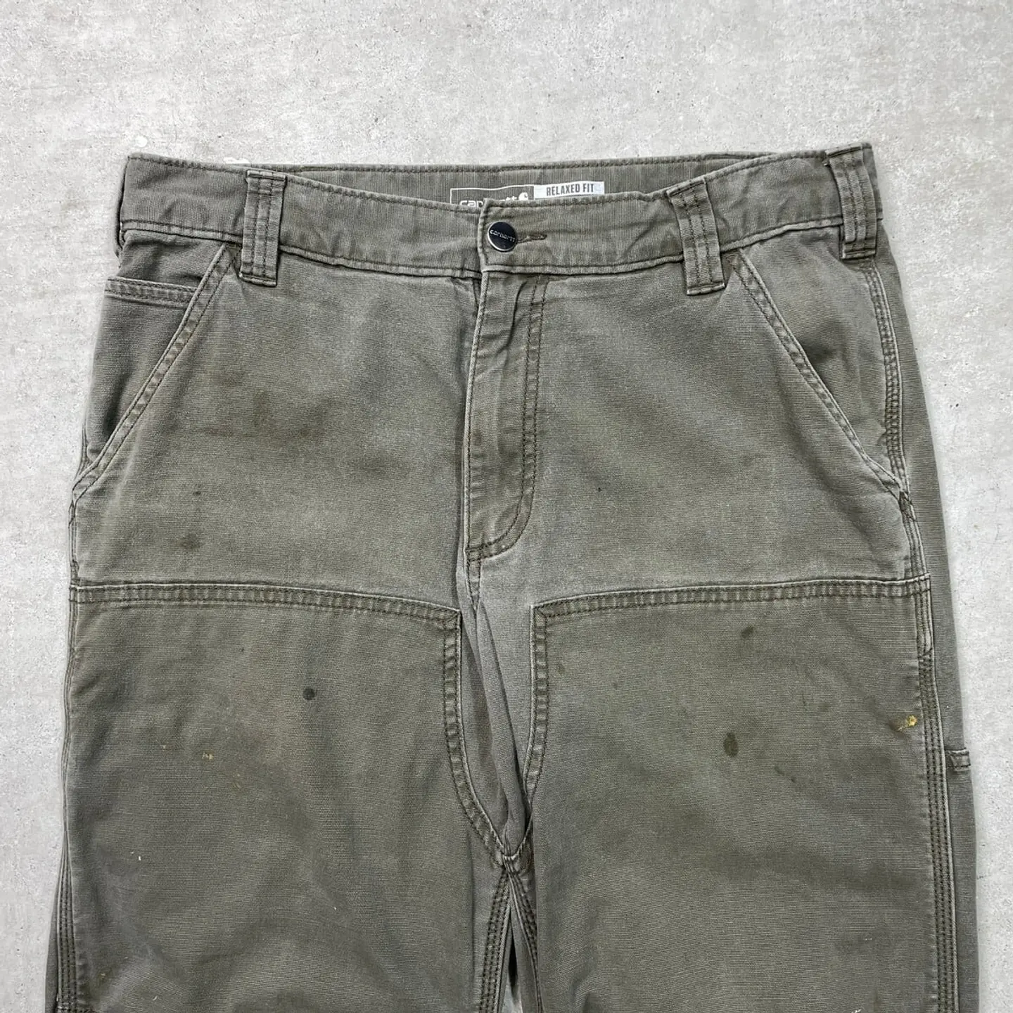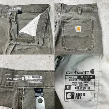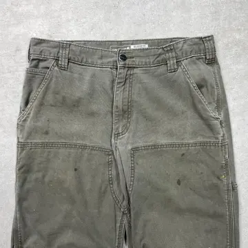 ■Carhartt カーハート ダブルニー ダック ワークパンツ ペンキ飛び メンズW33 古着 アメカジ RELAXED FIT モスグリーン【ワークパンツ】/カーキグリーン ◎生地の薄いダック生地になります。 【ブランド】Carhartt カーハート 【サイズ】表記 33×32(実寸L30) ※計測値をご確認ください。 ウエスト(平置き×2)…83 ワタリ幅…33.5 股上…27.5 股下…77.5 裾幅…20.5 【生産国】バングラデシュ製 【素材】コットン98%、スパンデックス2% 【状態】全体的に使用感による色あせがございます。 数か所にペンキ飛びや薄汚れがあります。 股付近に貫通はしていませんが、ダメージがあります。 画像にてご確認ください。 【h260110118】 ※古着は洗濯、検品などのケアを行っております。(新品・デッドストックは洗濯していません。) ※モニターの発色により実物と異なる場合がございます。予めご了承ください。 ※ 海外直輸入USED品になります。