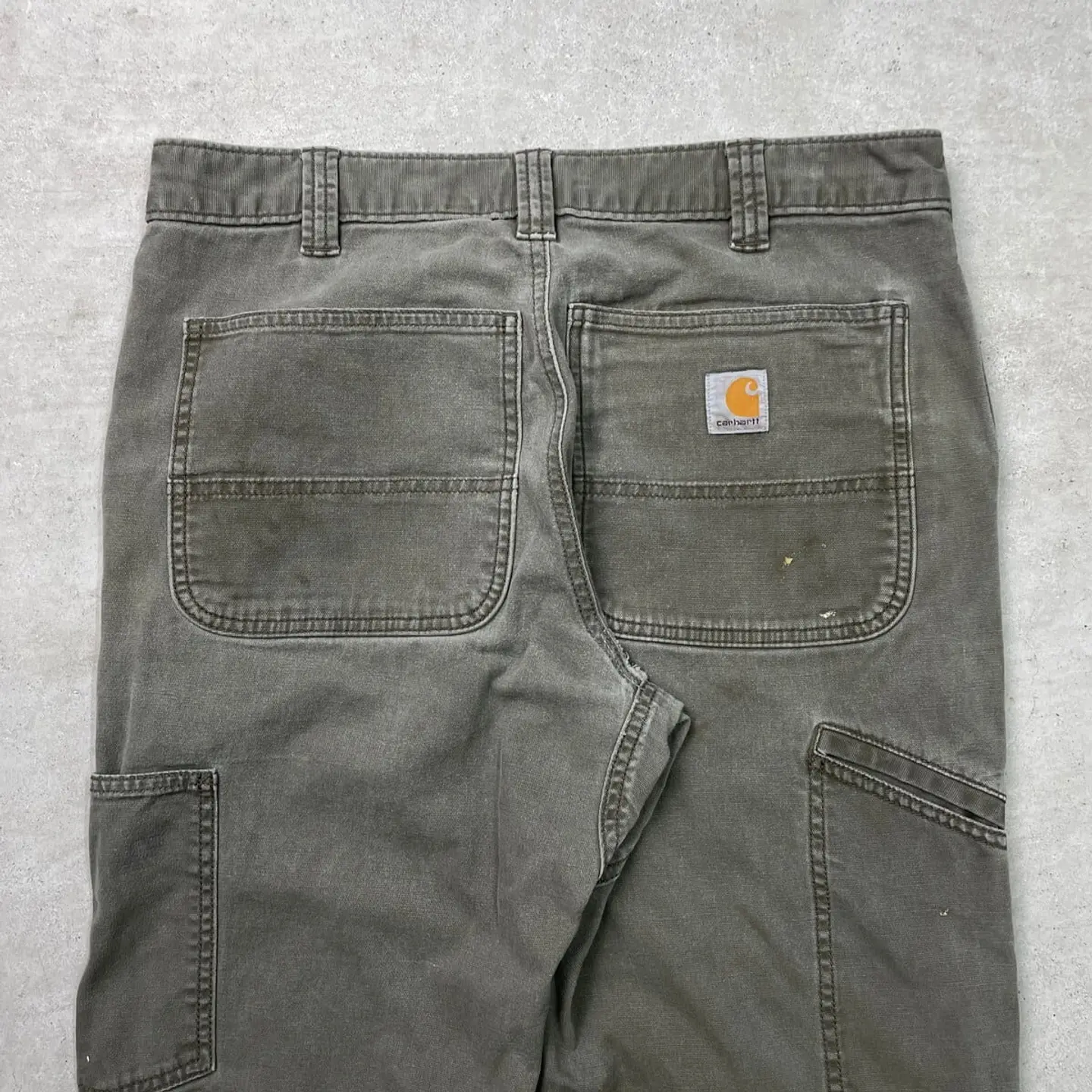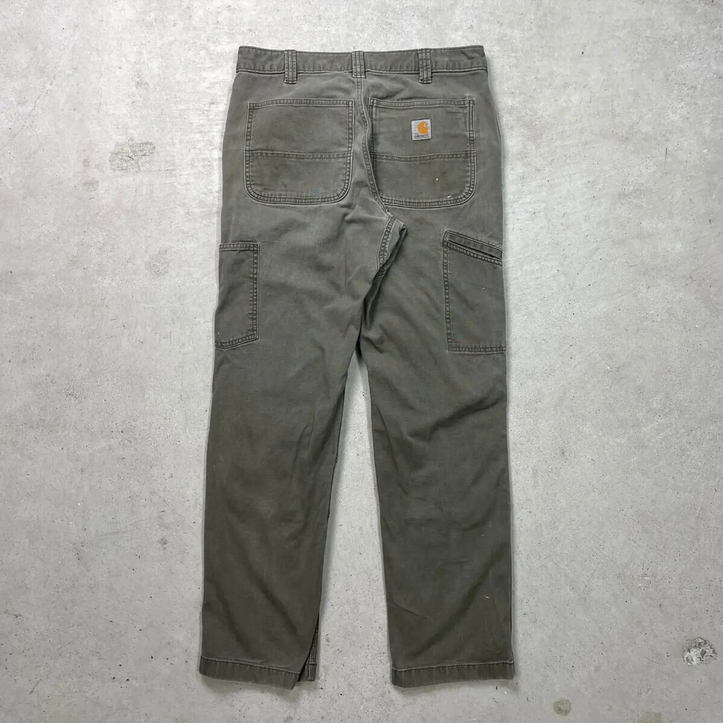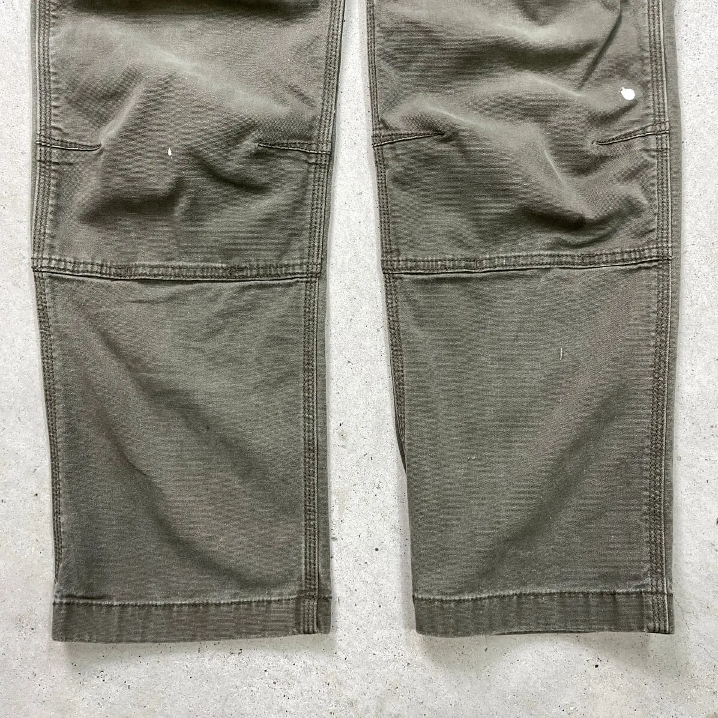 ■Carhartt カーハート ダブルニー ダック ワークパンツ ペンキ飛び メンズW33 古着 アメカジ RELAXED FIT モスグリーン【ワークパンツ】/カーキグリーン ◎生地の薄いダック生地になります。 【ブランド】Carhartt カーハート 【サイズ】表記 33×32(実寸L30) ※計測値をご確認ください。 ウエスト(平置き×2)…83 ワタリ幅…33.5 股上…27.5 股下…77.5 裾幅…20.5 【生産国】バングラデシュ製 【素材】コットン98%、スパンデックス2% 【状態】全体的に使用感による色あせがございます。 数か所にペンキ飛びや薄汚れがあります。 股付近に貫通はしていませんが、ダメージがあります。 画像にてご確認ください。 【h260110118】 ※古着は洗濯、検品などのケアを行っております。(新品・デッドストックは洗濯していません。) ※モニターの発色により実物と異なる場合がございます。予めご了承ください。 ※ 海外直輸入USED品になります。