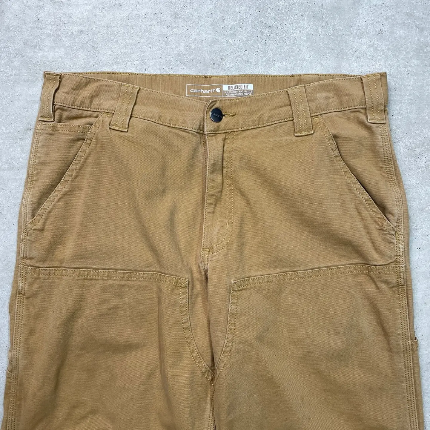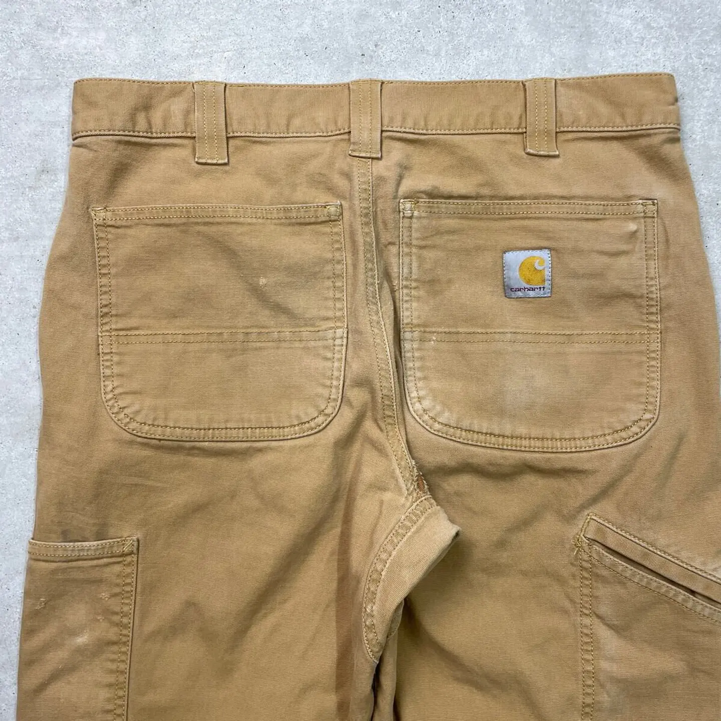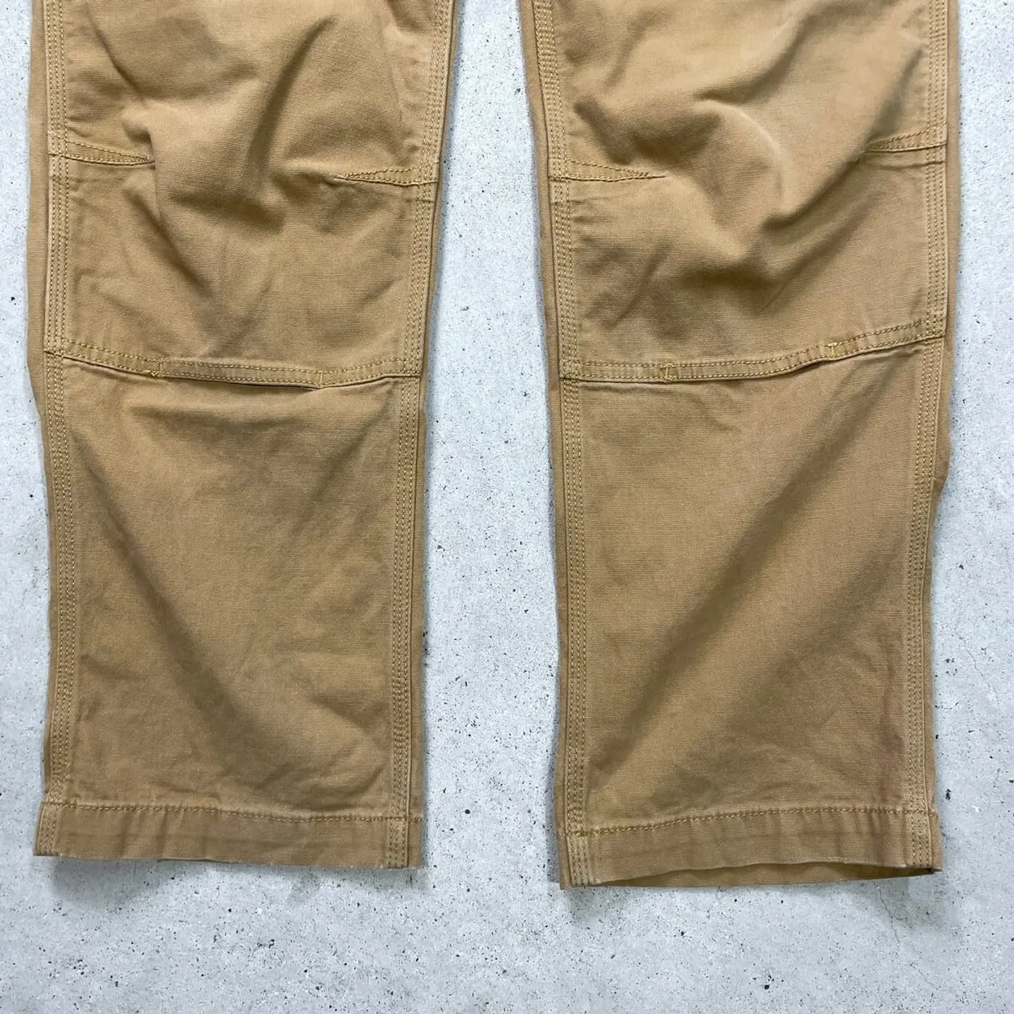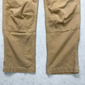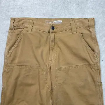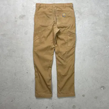 ■Carhartt カーハート ダブルニー ダック ワークパンツ メンズW33相当 古着 アメカジ RELAXED FIT キャメルブラウン【ワークパンツ】/ブラウン ◎生地の薄いダック地になります。 【ブランド】Carhartt カーハート 【サイズ】表記 32×34(実寸W33 L32) ※計測値をご確認ください。 ウエスト(平置き×2)…84 ワタリ幅…33 股上…28 股下…81 裾幅…19.5 【生産国】パキスタン製 【素材】コットン98%、スパンデックス2% 【状態】バックサイドに数か所ほつれがございます。 お尻付近にリペア跡があります。 目立った汚れはありません。 画像にてご確認ください。 【h260110114】 ※古着は洗濯、検品などのケアを行っております。(新品・デッドストックは洗濯していません。) ※モニターの発色により実物と異なる場合がございます。予めご了承ください。 ※ 海外直輸入USED品になります。