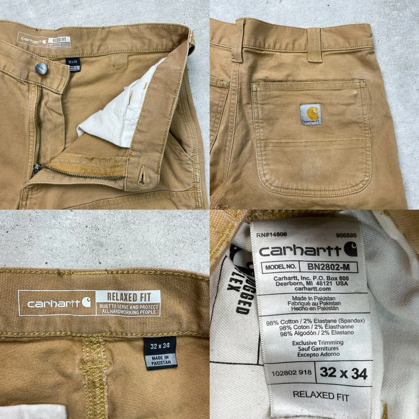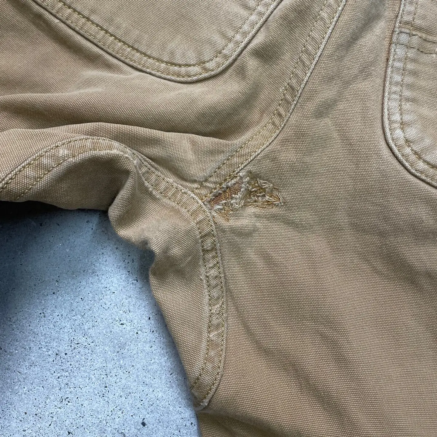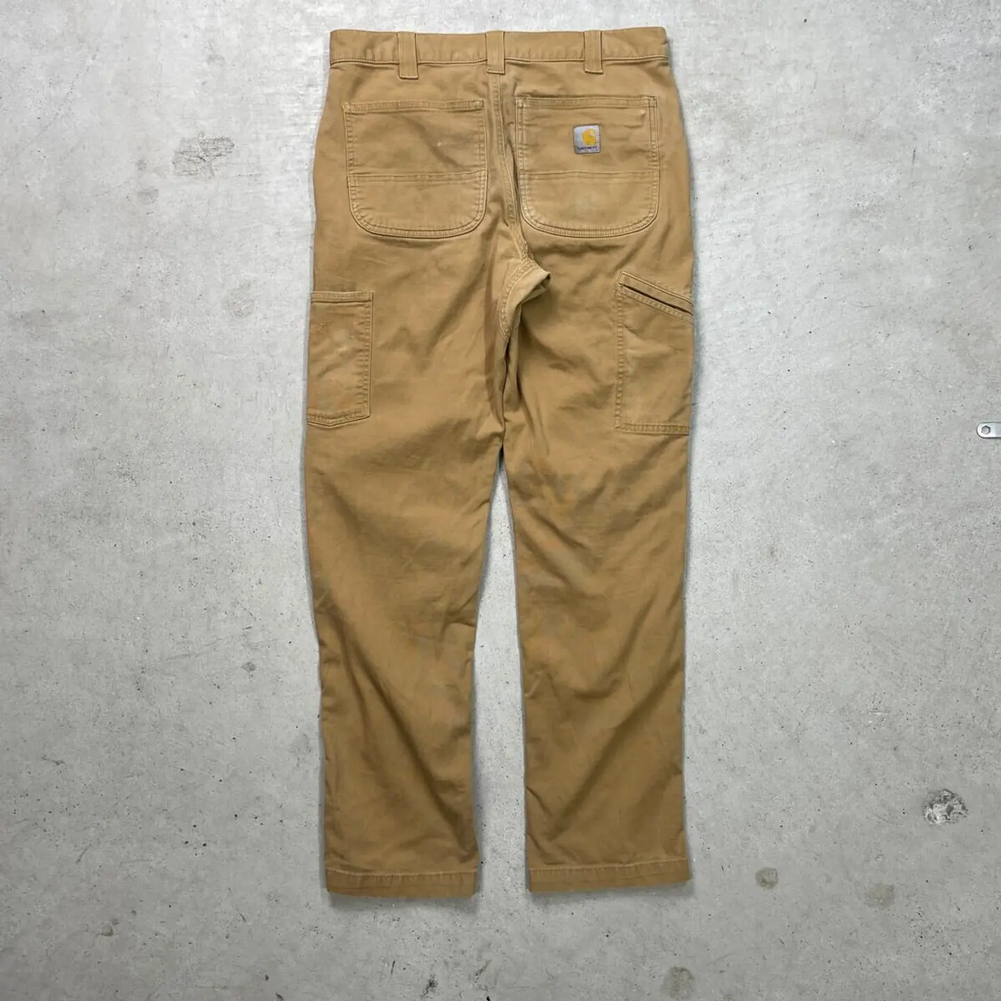 ■Carhartt カーハート ダブルニー ダック ワークパンツ メンズW33相当 古着 アメカジ RELAXED FIT キャメルブラウン【ワークパンツ】/ブラウン ◎生地の薄いダック地になります。 【ブランド】Carhartt カーハート 【サイズ】表記 32×34(実寸W33 L32) ※計測値をご確認ください。 ウエスト(平置き×2)…84 ワタリ幅…33 股上…28 股下…81 裾幅…19.5 【生産国】パキスタン製 【素材】コットン98%、スパンデックス2% 【状態】バックサイドに数か所ほつれがございます。 お尻付近にリペア跡があります。 目立った汚れはありません。 画像にてご確認ください。 【h260110114】 ※古着は洗濯、検品などのケアを行っております。(新品・デッドストックは洗濯していません。) ※モニターの発色により実物と異なる場合がございます。予めご了承ください。 ※ 海外直輸入USED品になります。