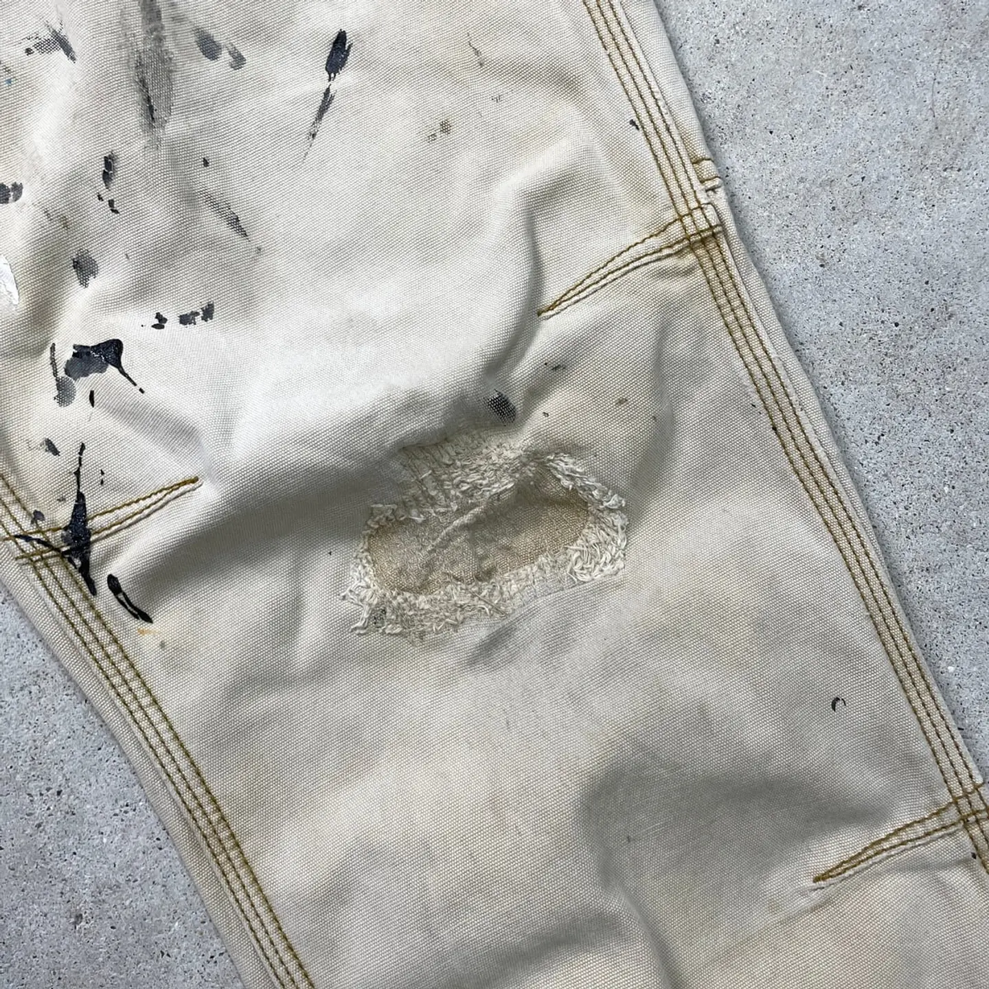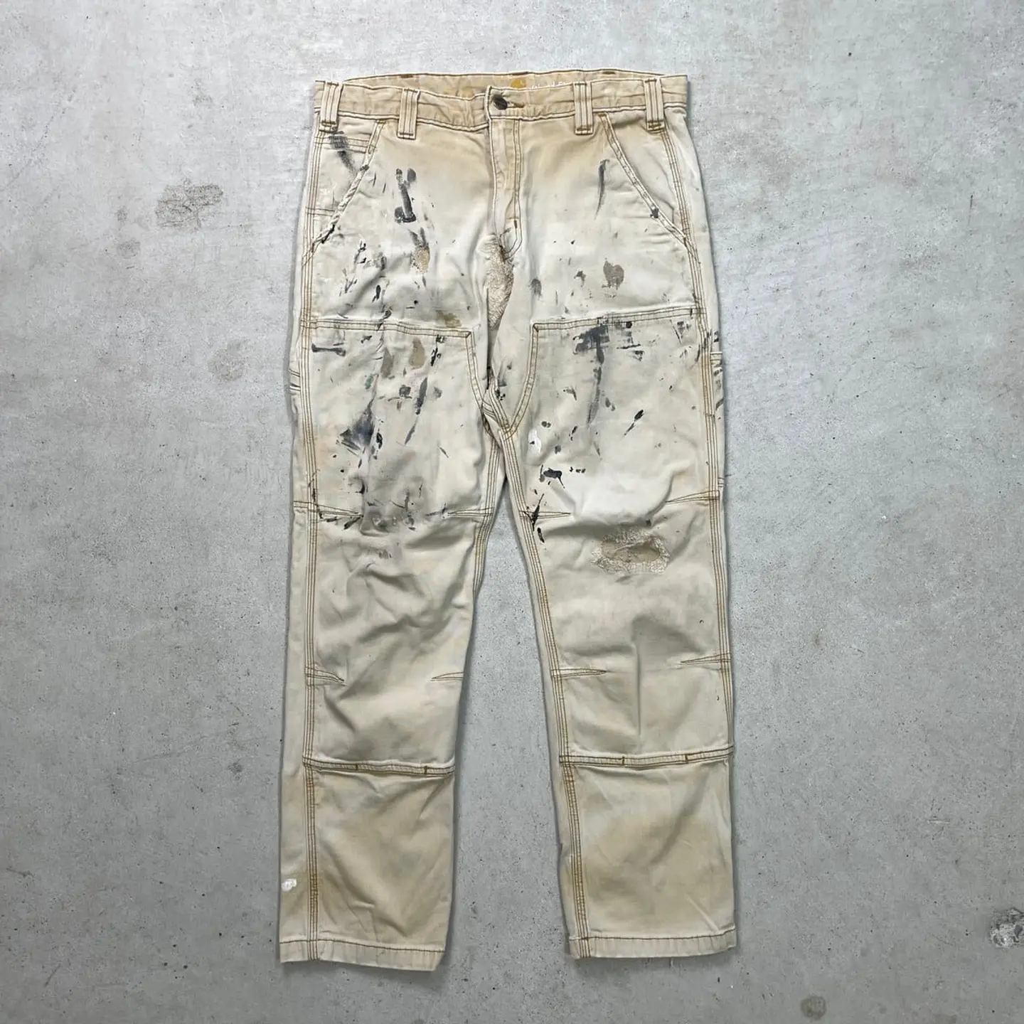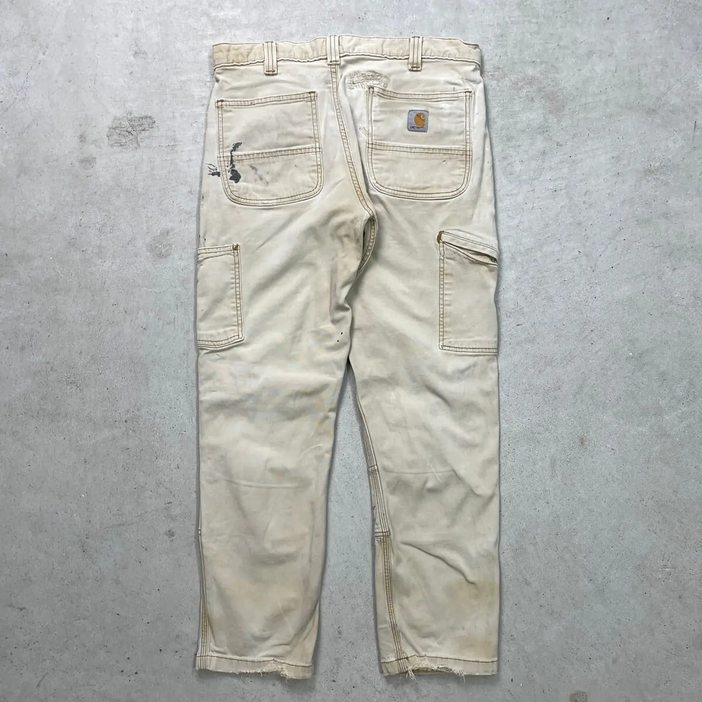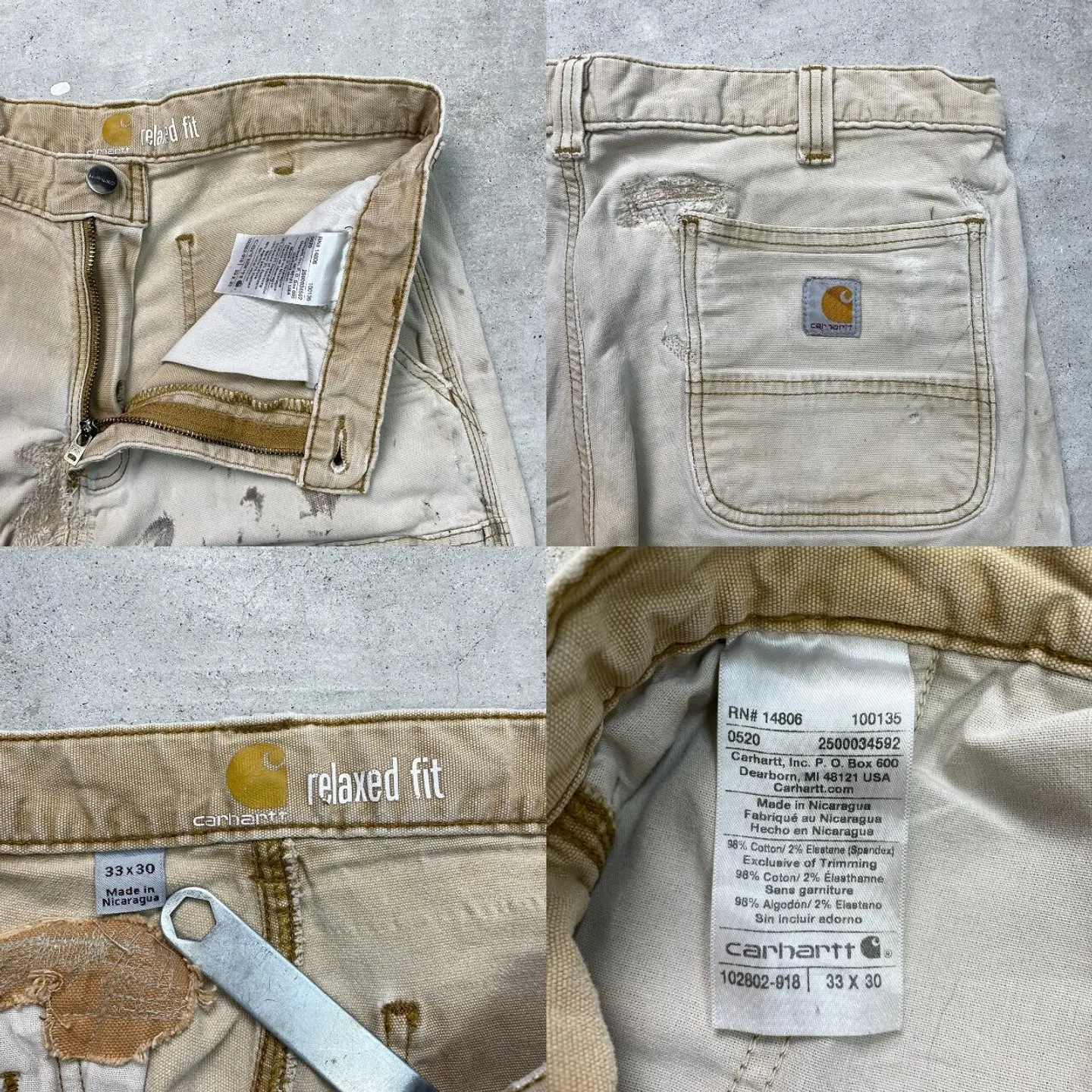 ■Carhartt カーハート ダブルニー ダック ワークパンツ ペンキ飛び メンズW33 古着 アメカジ RELAXED FIT フェードベージュ【ワークパンツ】/ベージュ ◎生地の薄いダック地になります。 【ブランド】Carhartt カーハート 【サイズ】表記 33×30(実寸L29) ※計測値をご確認ください。 ウエスト(平置き×2)…84 ワタリ幅…32 股上…27.5 股下…73.5 裾幅…19 【生産国】ニカラグア製 【素材】コットン98%、スパンデックス2% 【状態】全体的にペンキ飛び等の汚れがございます。 所々に使用感によるほつれや股付近や膝にリペア跡があります。 画像にてご確認ください。 【h260110113】 ※古着は洗濯、検品などのケアを行っております。(新品・デッドストックは洗濯していません。) ※モニターの発色により実物と異なる場合がございます。予めご了承ください。 ※ 海外直輸入USED品になります。