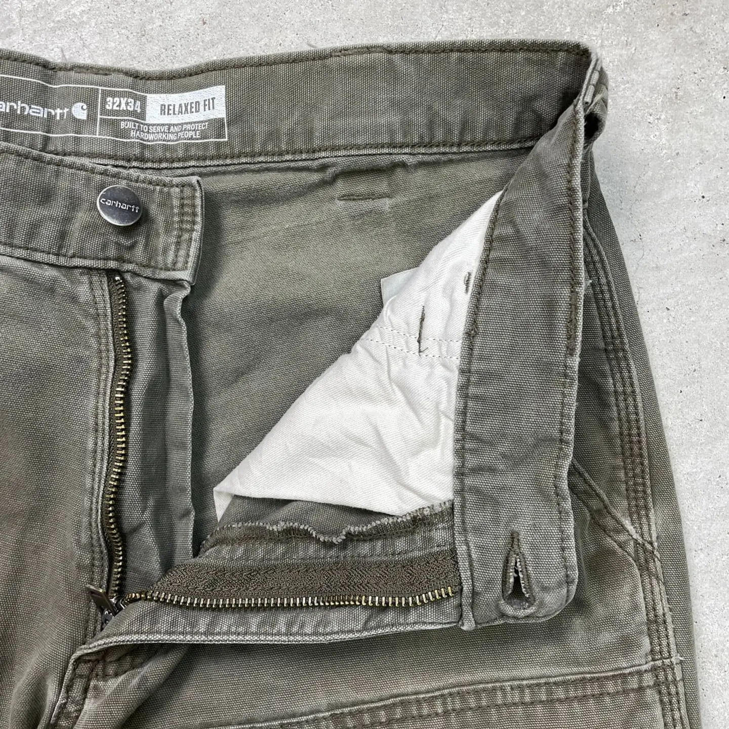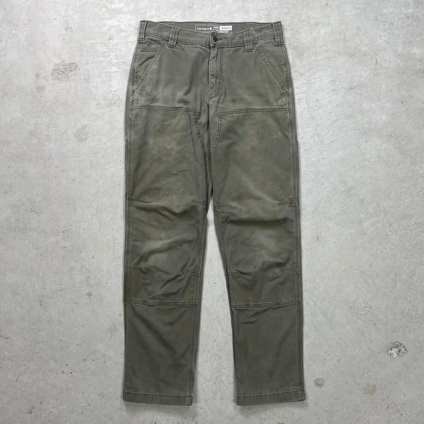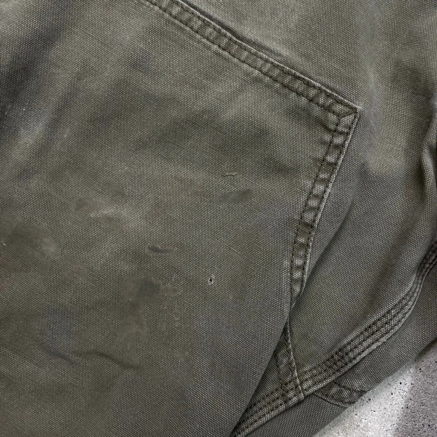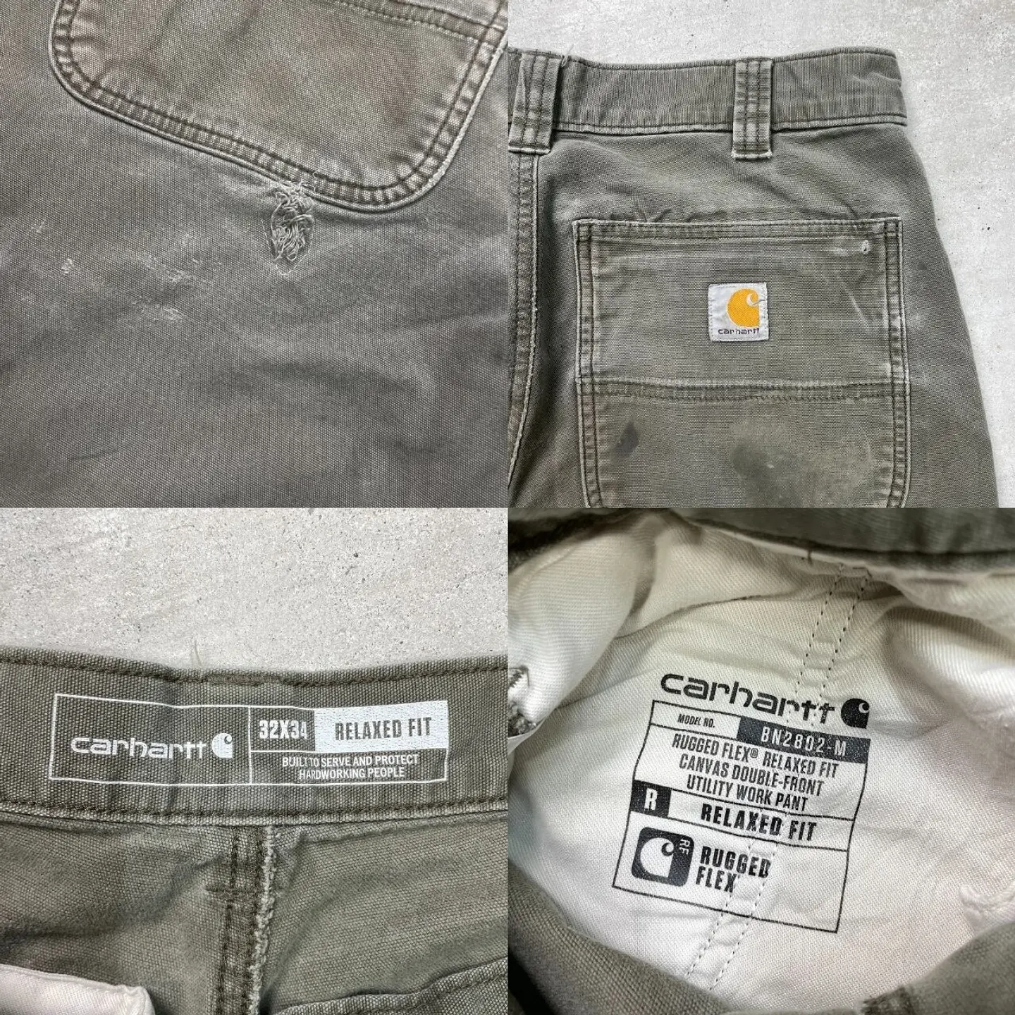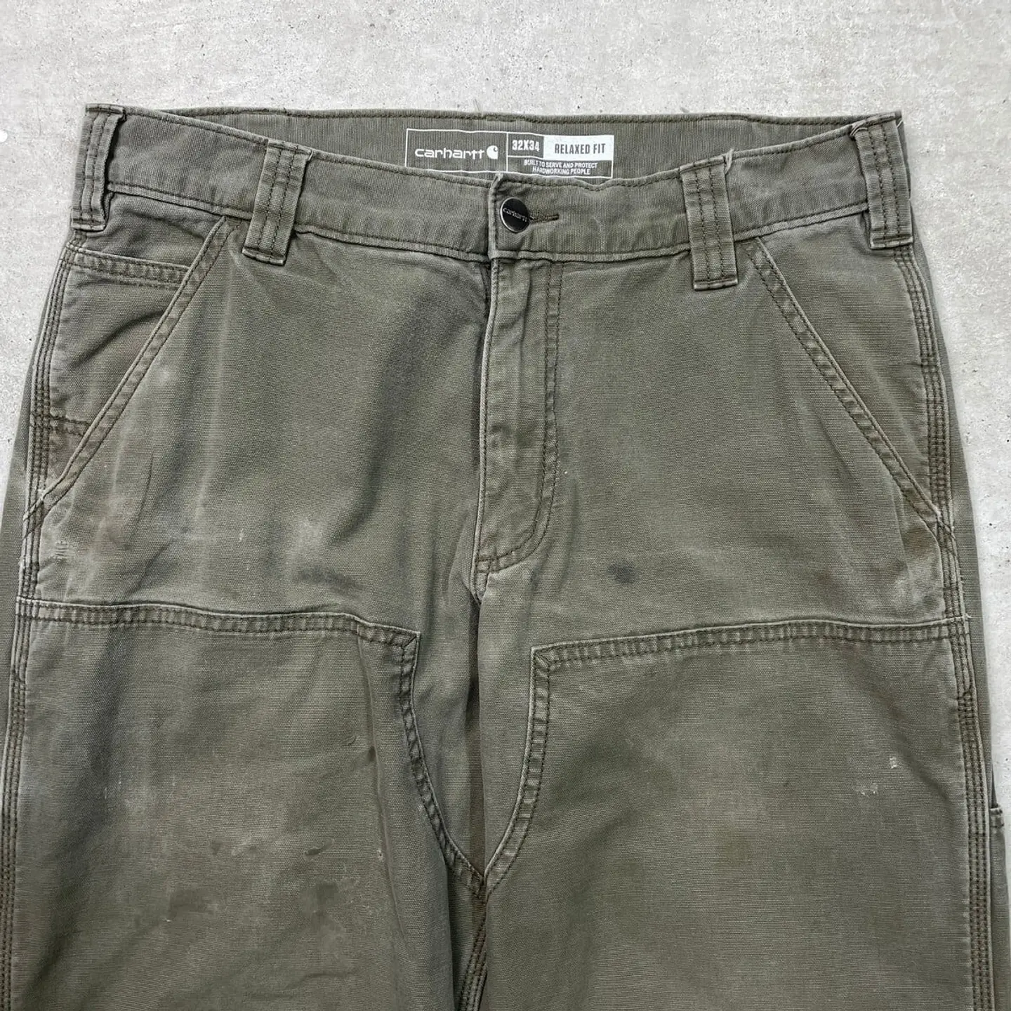 ■Carhartt カーハート ダブルニー ダック ワークパンツ メンズW31相当 古着 アメカジ RELAXED FIT フェードカーキグリーン【ワークパンツ】/カーキグリーン ◎生地の薄いダック地になります。 【ブランド】Carhartt カーハート 【サイズ】表記 32×34(実寸W31 L31) ※計測値をご確認ください。 ウエスト(平置き×2)…80 ワタリ幅…34.5 股上…27.5 股下…80.5 裾幅…20.5 【生産国】バングラデシュ製 【素材】コットン98%、スパンデックス2% 【状態】全体的に色あせやワーク感のある薄汚れがございます。 お尻ポケット付近に貫通はしていませんが、ダメージがあります。 画像にてご確認ください。 【h260110110】 ※古着は洗濯、検品などのケアを行っております。(新品・デッドストックは洗濯していません。) ※モニターの発色により実物と異なる場合がございます。予めご了承ください。 ※ 海外直輸入USED品になります。