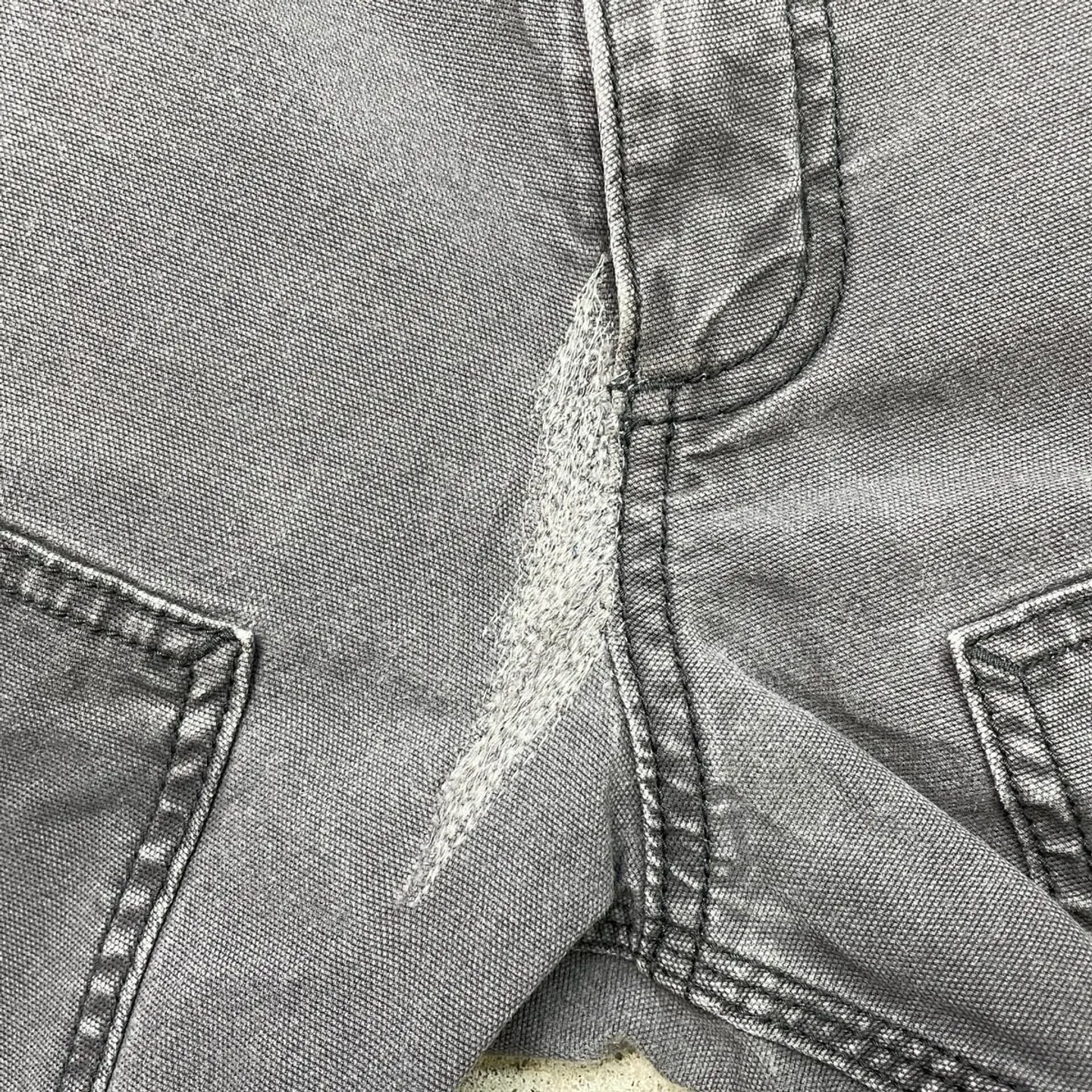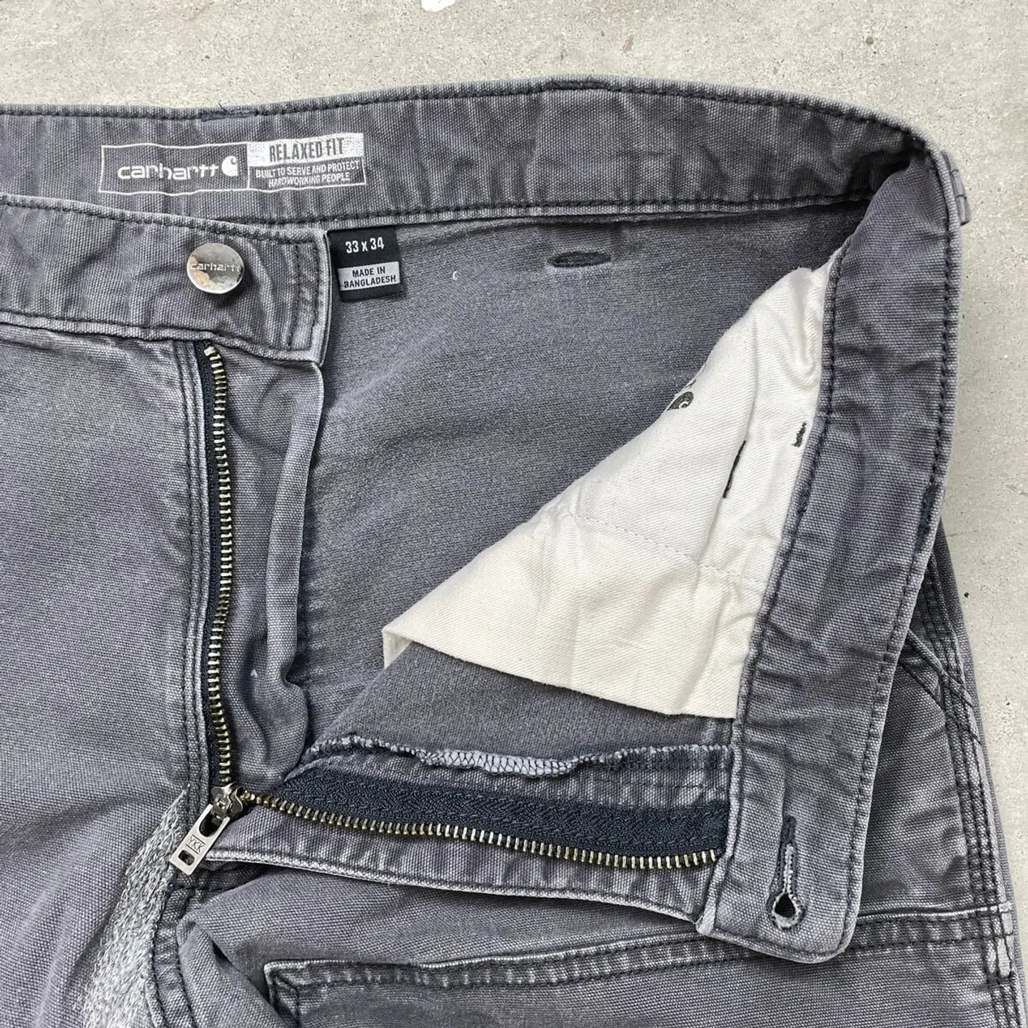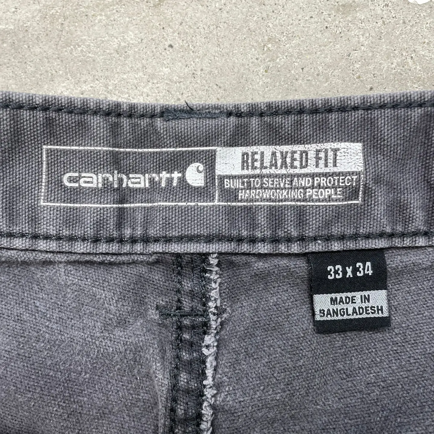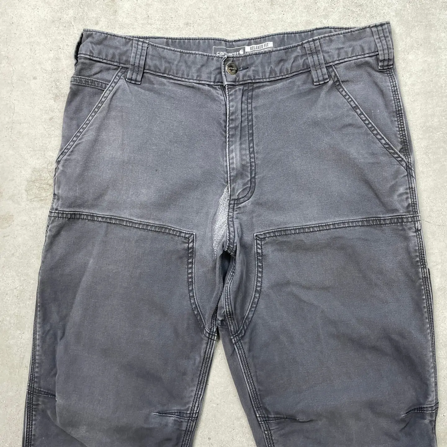■Carhartt カーハート ダブルニー ダック ペインターパンツ メンズW32相当 古着 アメカジ フェードグレー 墨黒【ワークパンツ】/グレー ◎生地の薄いダック地になります。 【ブランド】Carhartt カーハート 【サイズ】表記 33×34(実寸W32相当) ※計測値をご確認ください。 ウエスト(平置き×2)…82 ワタリ幅…30 股上…27.5 股下…80.5 裾幅…19 【生産国】バングラデシュ製 【素材】コットン98% エラスタン2% 【状態】股部分にリペア跡、両ひざ付近に汚れ等リアルなワークウェアならではな使用感のある雰囲気の良いコンディションです。 画像にてご確認ください。 【h260110010】 ※古着は洗濯、検品などのケアを行っております。(新品・デッドストックは洗濯していません。) ※モニターの発色により実物と異なる場合がございます。予めご了承ください。 ※ 海外直輸入USED品になります。