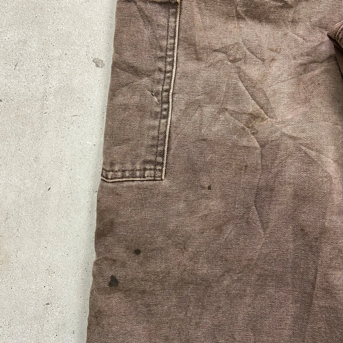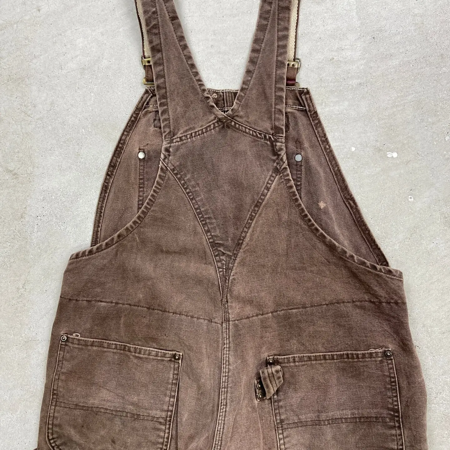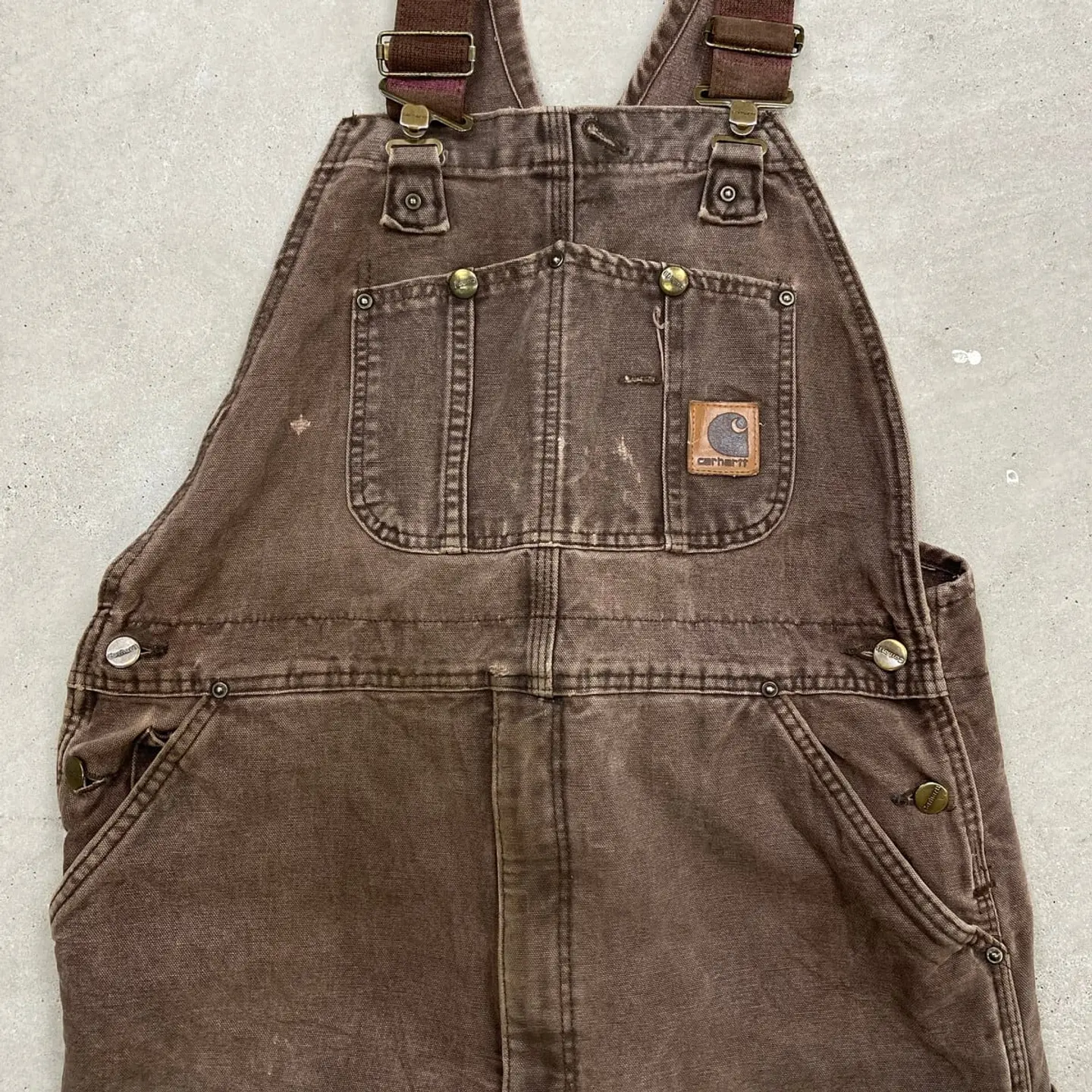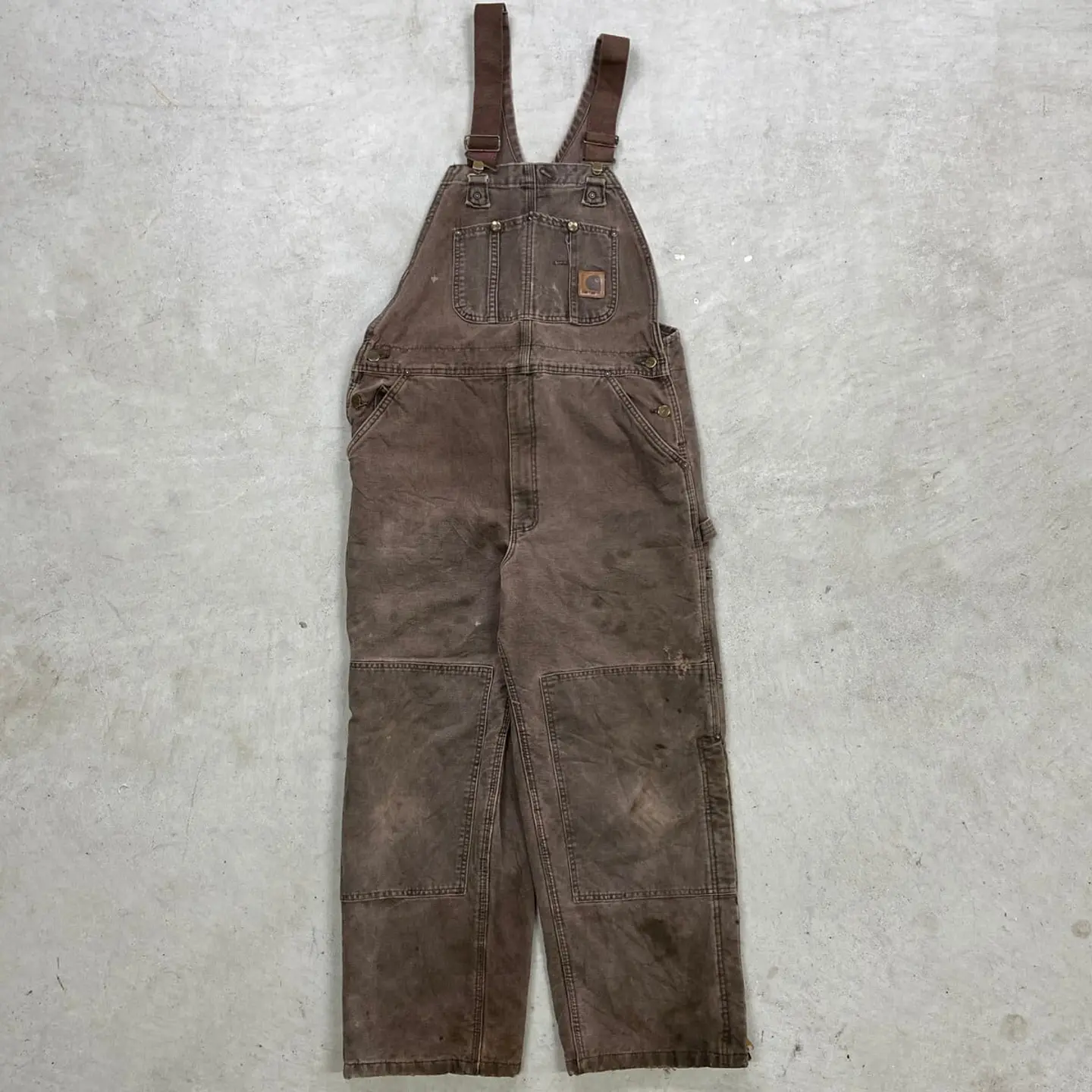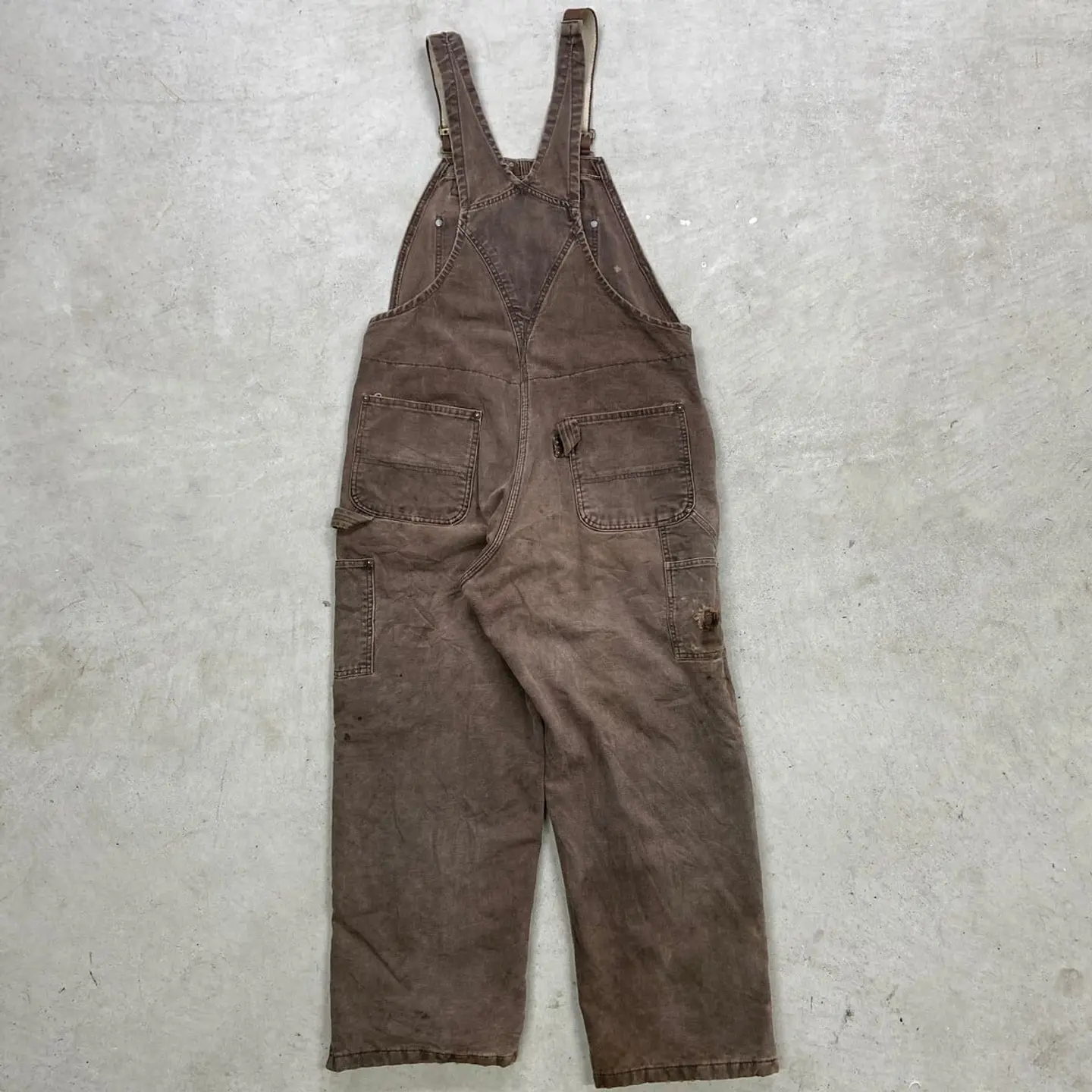 ■Carhartt カーハート ダック地 ダブルニー オーバーオール メンズW37相当 古着 VINTAGE ヴィンテージ キルティングライナー ボタンフライ フェードブラウン こげ茶色【オーバーオール】/ブラウン 【ブランド】Carhartt カーハート 【サイズ】表記不明(計測値 W37 L25) ※計測値をご確認ください。 総丈(肩から裾)…147(写真の状態の長さです。調節も可能になっています。) ウエスト…(平置き計測?2)…94 ワタリ幅…39 股下…62.5 裾幅…26.5 【生産国】不明 【素材】不明(おそらくコットン) 【状態】内タグが欠損しております。 全体的に色あせ、汚れ、若干のダメージがあり、 ワーク感あふれる一着です。 画像にてご確認ください。 【c260316101】 ※古着は洗濯、検品などのケアを行っております。(新品・デッドストックは洗濯していません。) ※モニターの発色により実物と異なる場合がございます。予めご了承ください。 ※ 海外直輸入USED品になります。