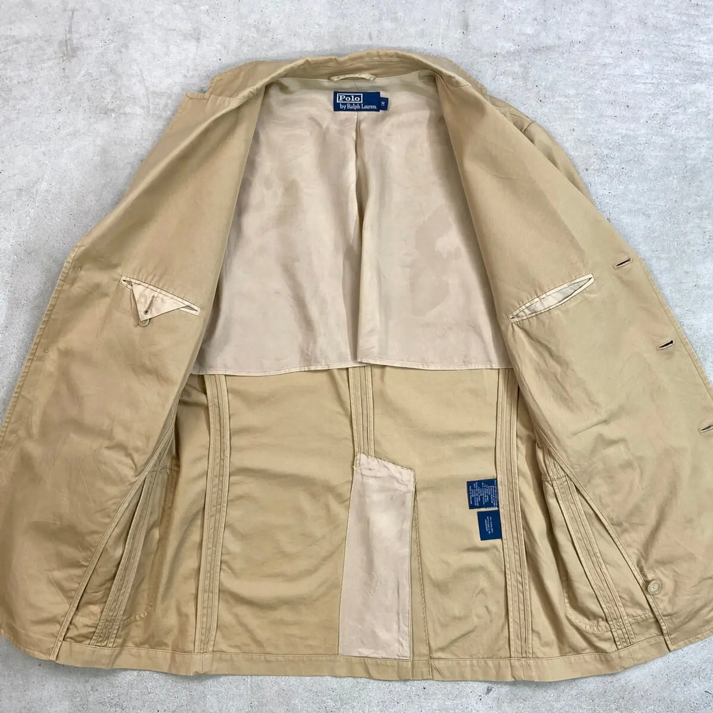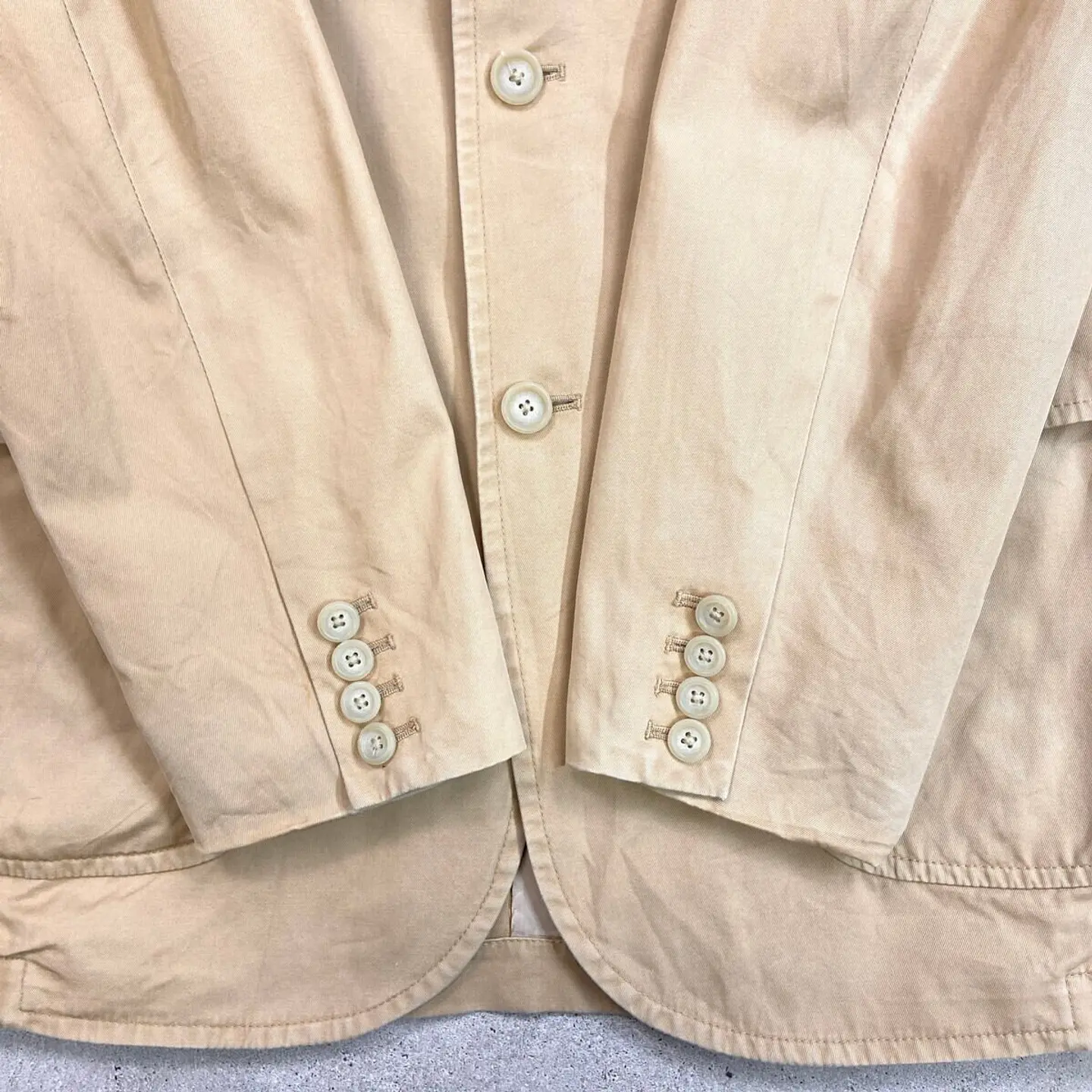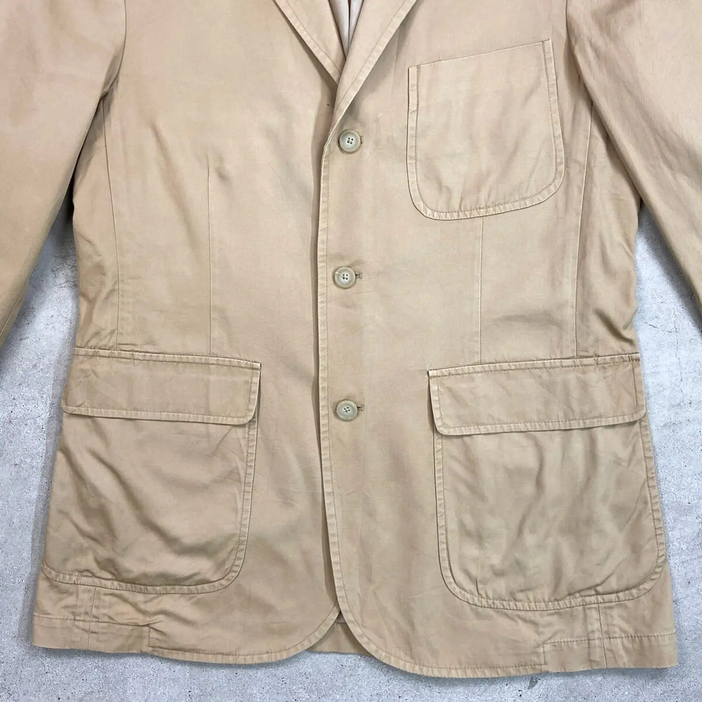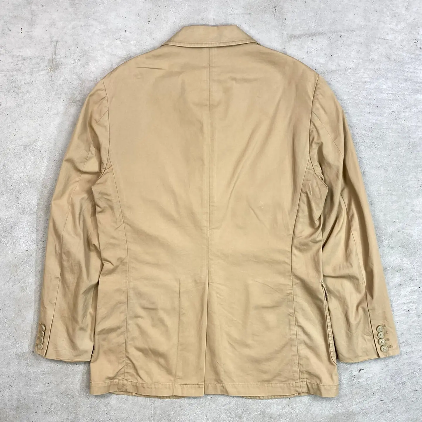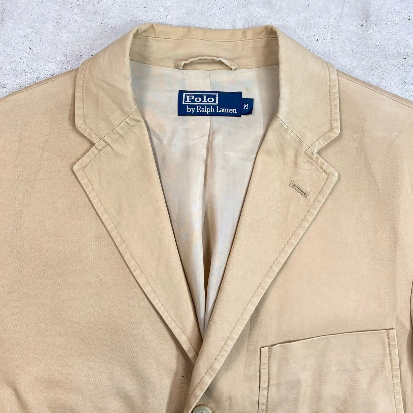 ■90年代 Polo by Ralph Lauren ポロバイラルフローレン コットンテーラードジャケット メンズM 古着 90s VINTAGE ヴィンテージ 3B サンドベージュ【テーラードジャケット】/ベージュ 【ブランド】 Polo by Ralph Lauren ポロバイラルフローレン 【サイズ】表記 M ※計測値をご確認ください。 着丈…78 身幅…54.5 肩幅…46.5 袖丈...65 【生産国】タイ製 【素材】コットン100% 裏地 ビスコース100% 【状態】フロントボタン付近に一部汚れがございます。 その他目立ったダメージはありません。 画像にてご確認ください。 【c260313101】 ※古着は洗濯、検品などのケアを行っております。(新品・デッドストックは洗濯していません。) ※モニターの発色により実物と異なる場合がございます。予めご了承ください。 ※ 海外直輸入USED品になります。