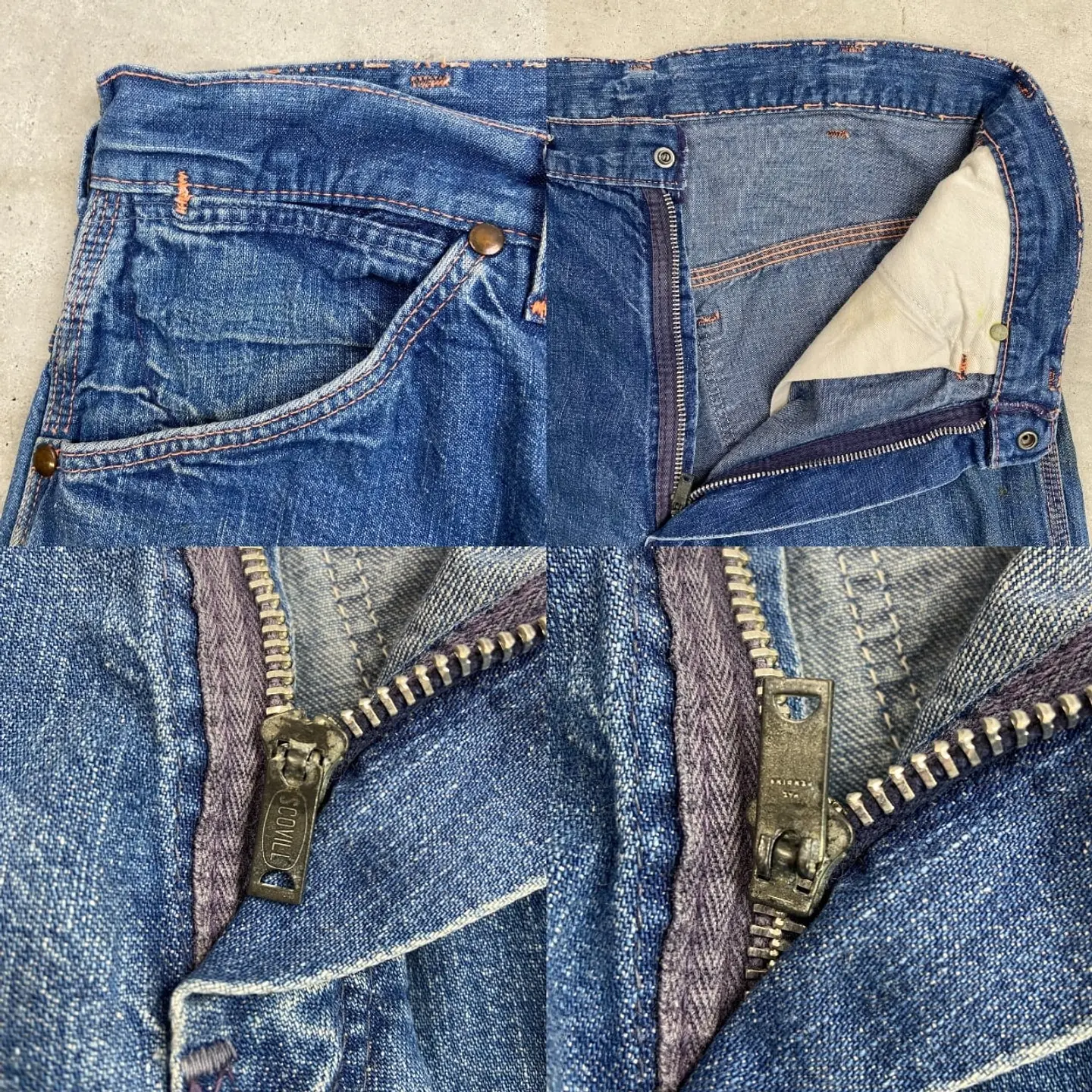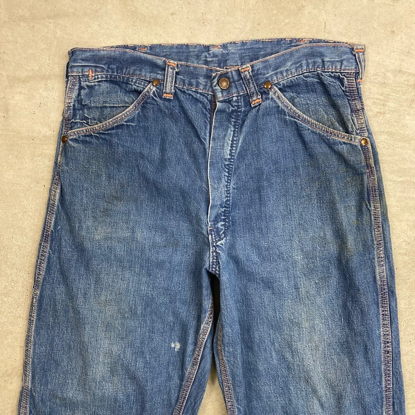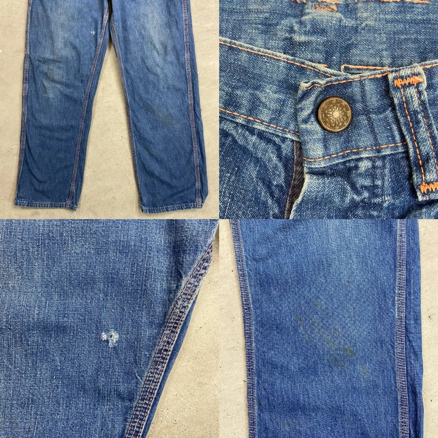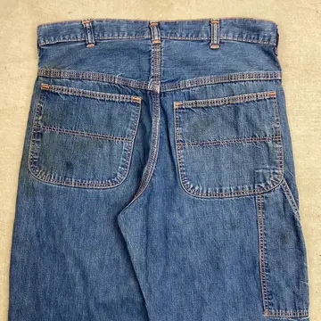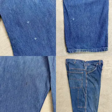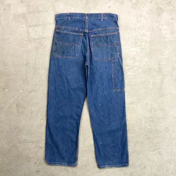 ■60年代 ストアブランド デニムペインターパンツ メンズW31相当 古着 60s ヴィンテージ VINTAGE アメカジ カムロックSCOVILLジッパー むき出しリベット 青色【デニムパンツ】/ブルー ◎こちらはストア系ブランドのデニムペインターパンツになります。 当時の百貨店で販売されていたこともありこだわりを感じるディティールに、 デニムペインター特有のライトオンスの薄手の生地感となってなります。 【ブランド】不明 【サイズ】表記不明(実寸約W31 L28) ウエスト(平置き計測?2)…80 ワタリ幅...32 股上…31 股下…70.5 裾幅…21 【生産国】USA製 【素材】コットン100% 【状態】全体的に使用感による多少の色あせがございます。 フロントもも付近、バックサイド下部にダメージがあります。 また、フロント上部やバックポケットに薄汚れがあります。 画像にてご確認ください。 【c260228131】 ※古着は洗濯、検品などのケアを行っております。(新品・デッドストックは洗濯していません。)