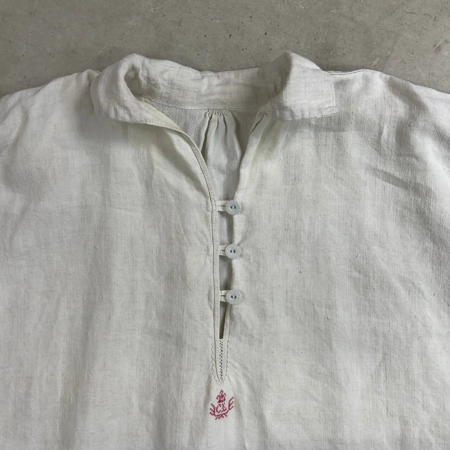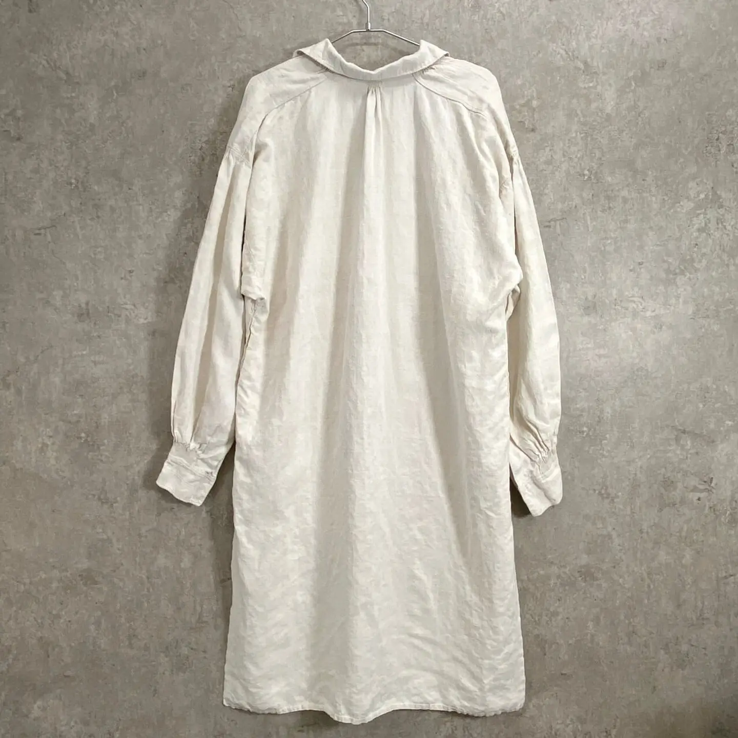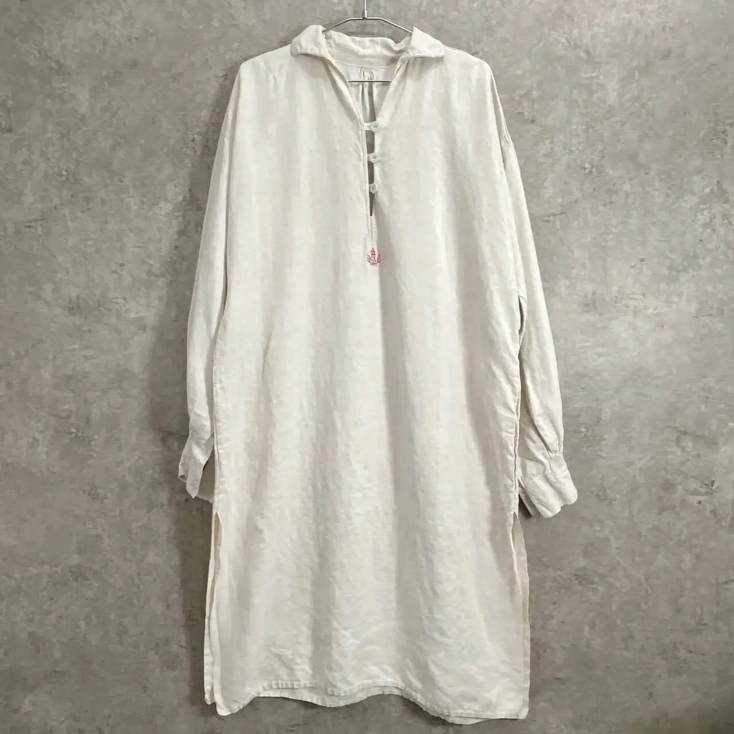 ■1900年代初頭 アンティーク 王冠赤刺繍 シャトーリネンワンピース スモック レディースXL相当 古着 VINTAGE ヴィンテージ フランスアンティーク イニシャル刺繍 白色【ブラウス】/ホワイト 19世紀末から20世紀初頭にかけて、フランスのシャトー(城・邸宅)で大切に受け継がれてきた、極めて希少なアンティークリネンのスモックです。 当時の上流階級や貴族が、寝衣(ナイトドレス)や室内着として誂えた「シャトーリネン」の最高峰と呼べる一着です。肩周りと袖口には、熟練の手仕事による細密なギャザーが施されており、当時の丁寧なものづくりが伺えます。胸元には、このリネンが名家の所有物であったことを示す「王冠」のモノグラムが、伝統的な赤い糸で一針ずつ丁寧に手刺繍されています。 【サイズ】(着用感レディースXL~) ゆっらりとした大きな作りになります。 ※計測値をご確認ください。 着丈…113 肩幅…62 身幅…66 袖丈…60 【生産国】フランスまたはフランス圏内(推定) 【素材】リネンのような風合いの生地 【状態】アンティーク特有の経年変化はございますが。100年以上前の商品ですが、目立ったダメージや汚れも少なく状態です。画像でお確かめください。 【c260221151】 ※古着は洗濯、検品などのケアを行っております。(新品・デッドストックは洗濯していません。) ※モニターの発色により実物と異なる場合がございます。予めご了承ください。 ※ 海外直輸入USED品になります。