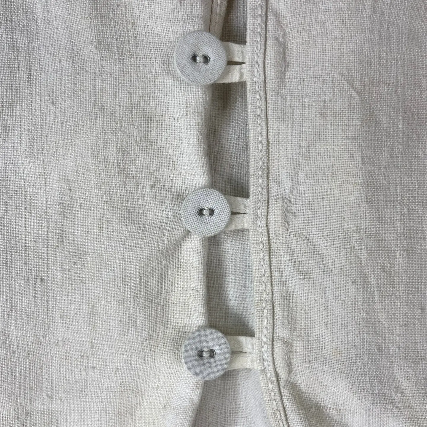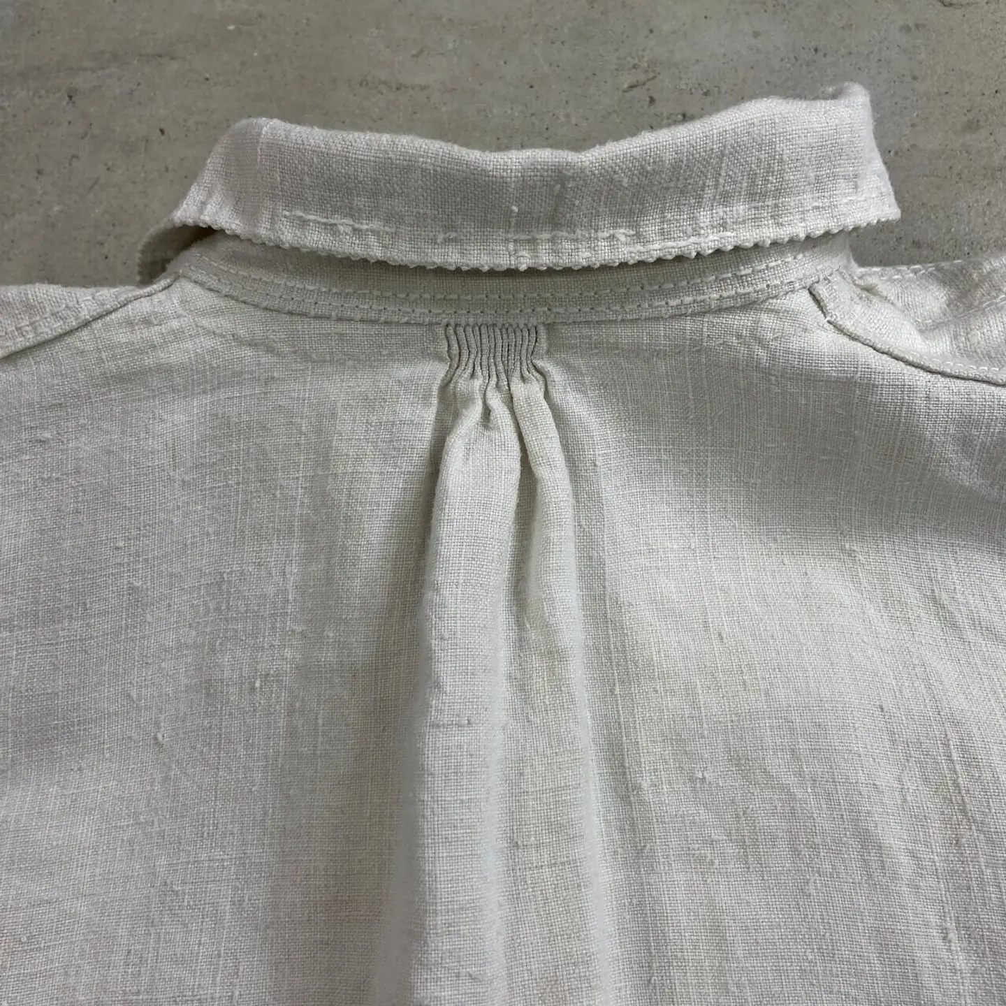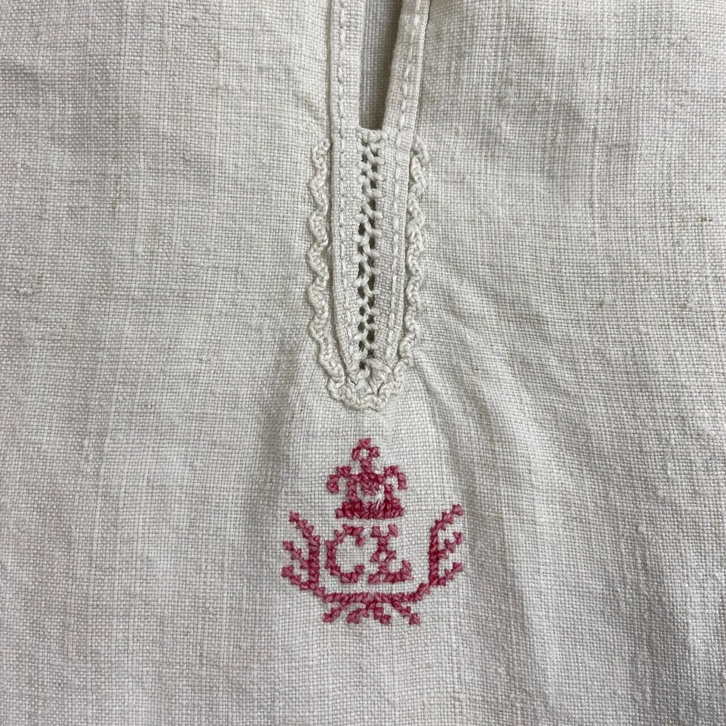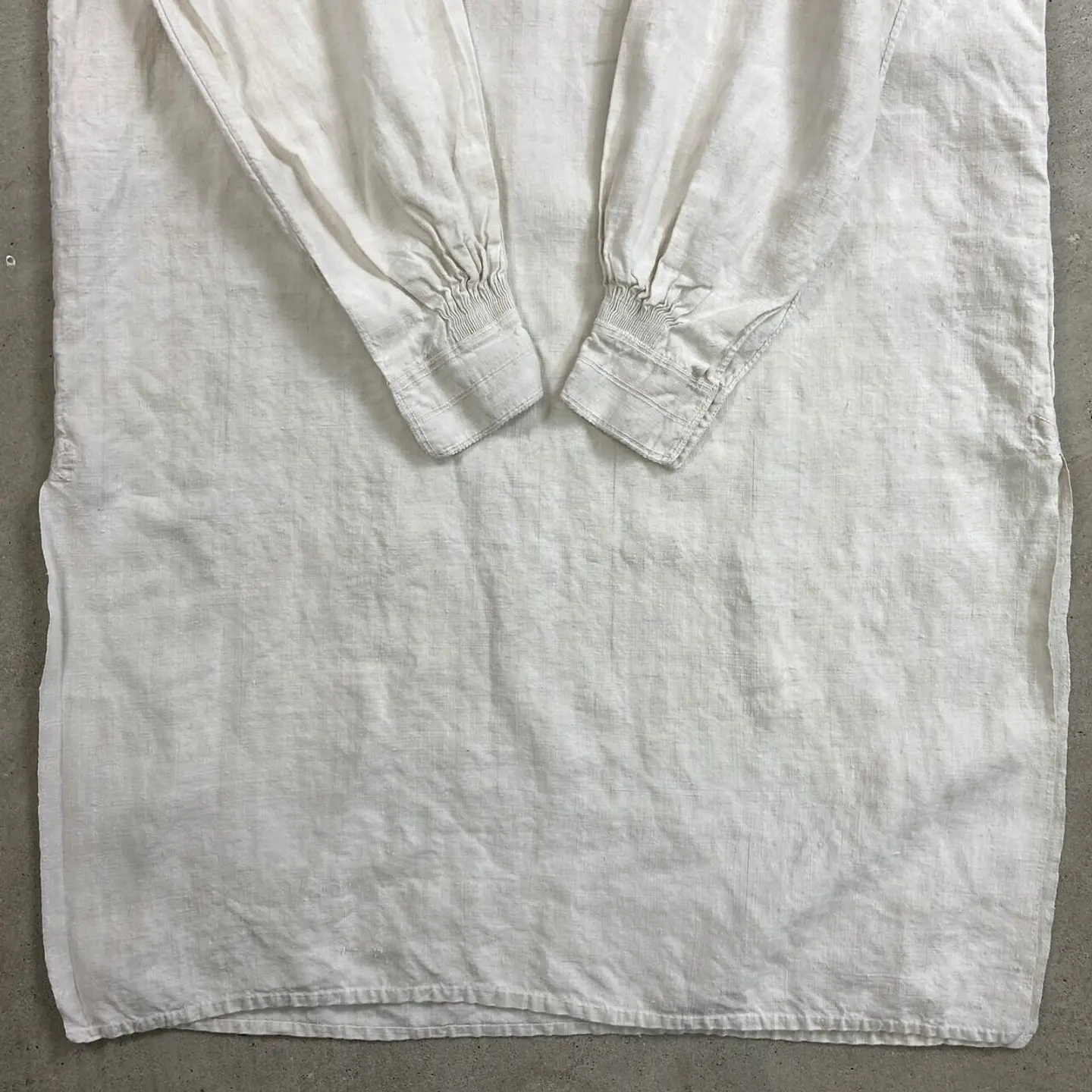 ■1900年代初頭 アンティーク 王冠赤刺繍 シャトーリネンワンピース スモック レディースXL相当 古着 VINTAGE ヴィンテージ フランスアンティーク イニシャル刺繍 白色【ブラウス】/ホワイト 19世紀末から20世紀初頭にかけて、フランスのシャトー(城・邸宅)で大切に受け継がれてきた、極めて希少なアンティークリネンのスモックです。 当時の上流階級や貴族が、寝衣(ナイトドレス)や室内着として誂えた「シャトーリネン」の最高峰と呼べる一着です。肩周りと袖口には、熟練の手仕事による細密なギャザーが施されており、当時の丁寧なものづくりが伺えます。胸元には、このリネンが名家の所有物であったことを示す「王冠」のモノグラムが、伝統的な赤い糸で一針ずつ丁寧に手刺繍されています。 【サイズ】(着用感レディースXL~) ゆっらりとした大きな作りになります。 ※計測値をご確認ください。 着丈…113 肩幅…62 身幅…66 袖丈…60 【生産国】フランスまたはフランス圏内(推定) 【素材】リネンのような風合いの生地 【状態】アンティーク特有の経年変化はございますが。100年以上前の商品ですが、目立ったダメージや汚れも少なく状態です。画像でお確かめください。 【c260221151】 ※古着は洗濯、検品などのケアを行っております。(新品・デッドストックは洗濯していません。) ※モニターの発色により実物と異なる場合がございます。予めご了承ください。 ※ 海外直輸入USED品になります。