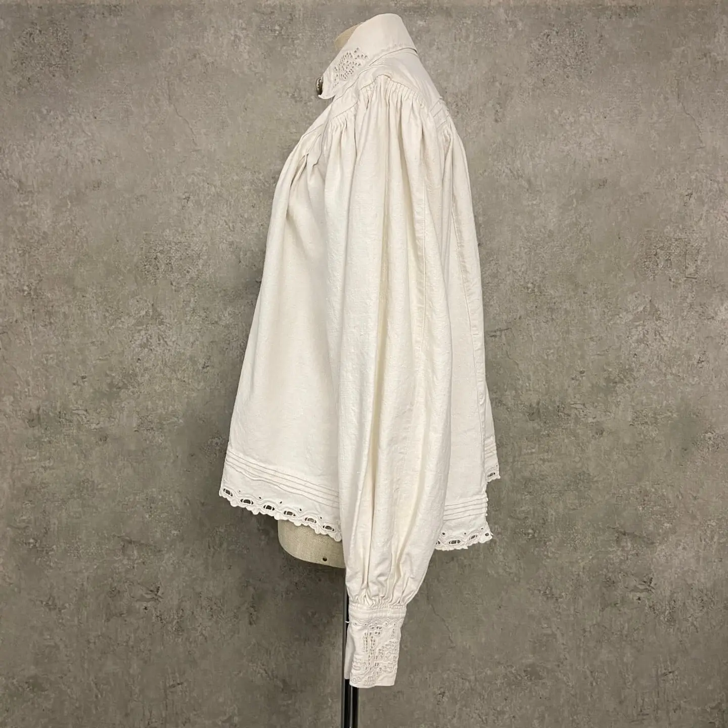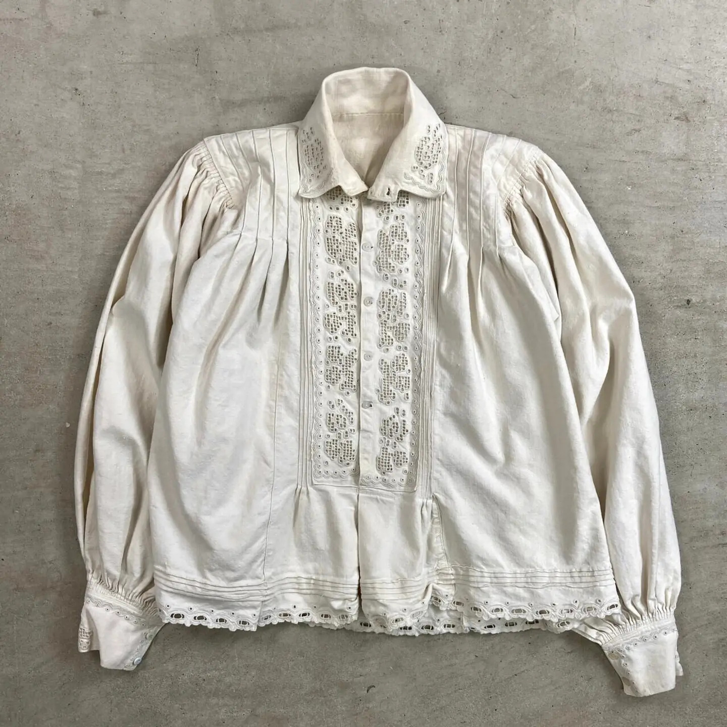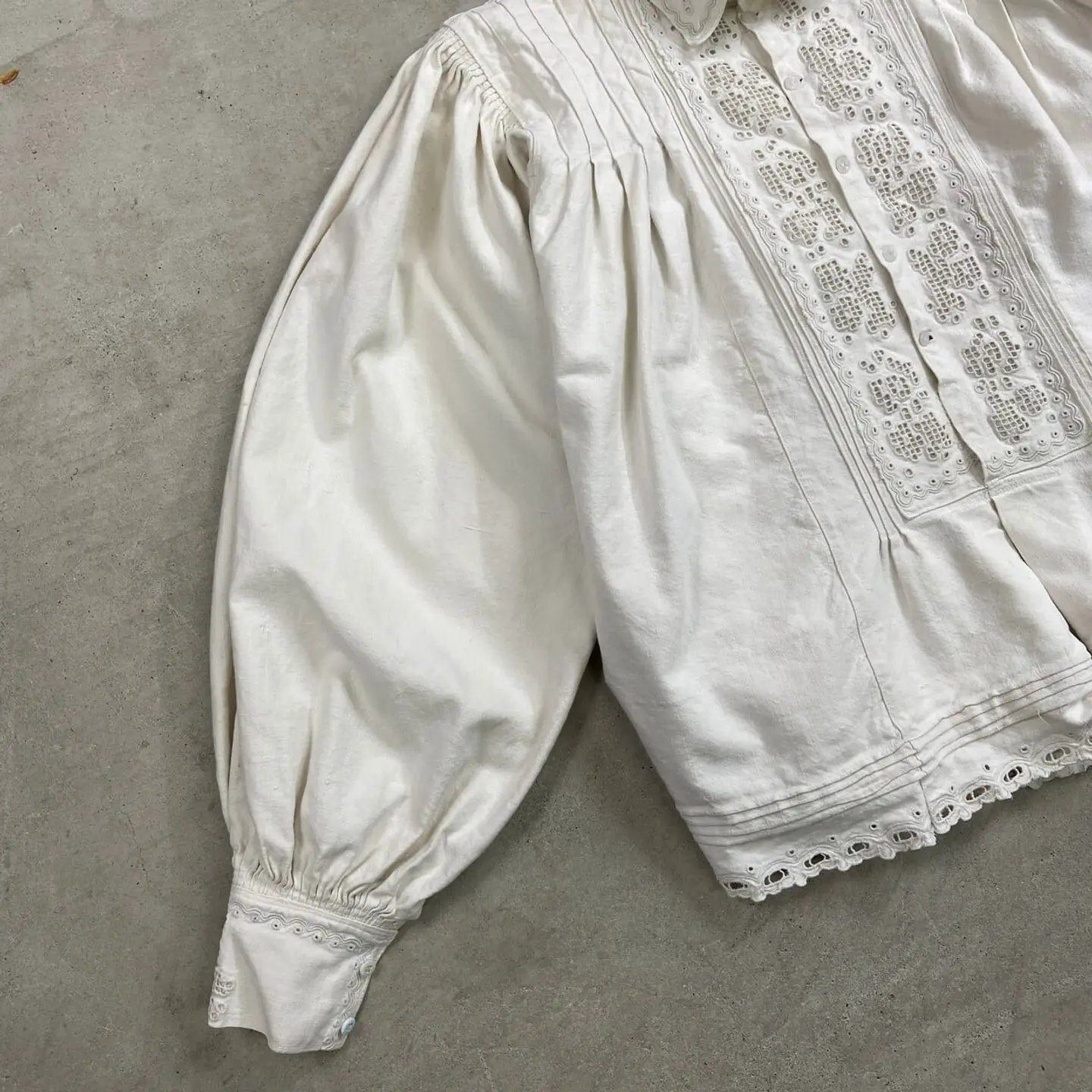 ■1900年代初頭 アンティーク ホワイトワーク刺繍ブラウス 白刺繍ブラウス レディースM相当 古着 VINTAGE ヴィンテージ フランスアンティーク エドワーディアン 白蝶貝ボタン コットンリネン 白色【ブラウス】/ホワイト 〇1900年代初頭から1920年代頃に作られた、極めて希少なアンティーク・ブラウスです。ルーマニア・ビホル(Bihor)地方の伝統的な手刺繍と、当時の西欧(エドワード朝~1920年代)の洗練されたテーラリングが融合した、歴史的価値の高い一着です。 コットンリネンのようなハリのある生地に、繊細なホワイトワークとピンタックが施された美しい一着です。ハリのある質感の中にも柔らかさがあり、アンティークならではの風合いになります。袖には細かなギャザーにより程よいボリュームスリーブ。白蝶貝ボタンも当時の時代を感じるディテールです。伝統的な民族衣装の多くが直線裁断のスモック型であるのに対し、こちらは「セットインスリーブ(肩のライン)」と「前開きのシャツ構造」を採用。身体のラインを美しく見せる西欧的なシルエットにアップデートされています。 脇はパネル切り替えによる立体的な仕立てになっています。 【サイズ】(着用感レディースM~L相当) ※計測値をご確認ください。 着丈…65 肩幅…40 袖丈…69 【生産国】フランスまたはフランス圏内(推定) 【素材】コットンリネンのような風合いの生地 【状態】100年以上前の商品ですが、目立ったダメージや汚れもほとんどなく着用感も感じられない状態です。画像でお確かめください。 【c260221150】 ※古着は洗濯、検品などのケアを行っております。(新品・デッドストックは洗濯していません。) ※モニターの発色により実物と異なる場合がございます。予めご了承ください。 ※ 海外直輸入USED品になります。