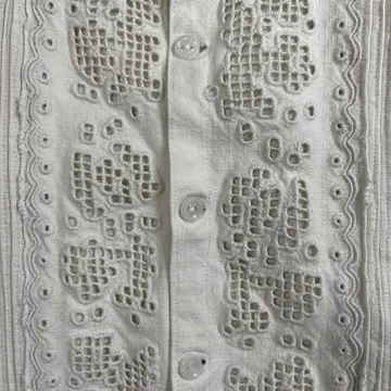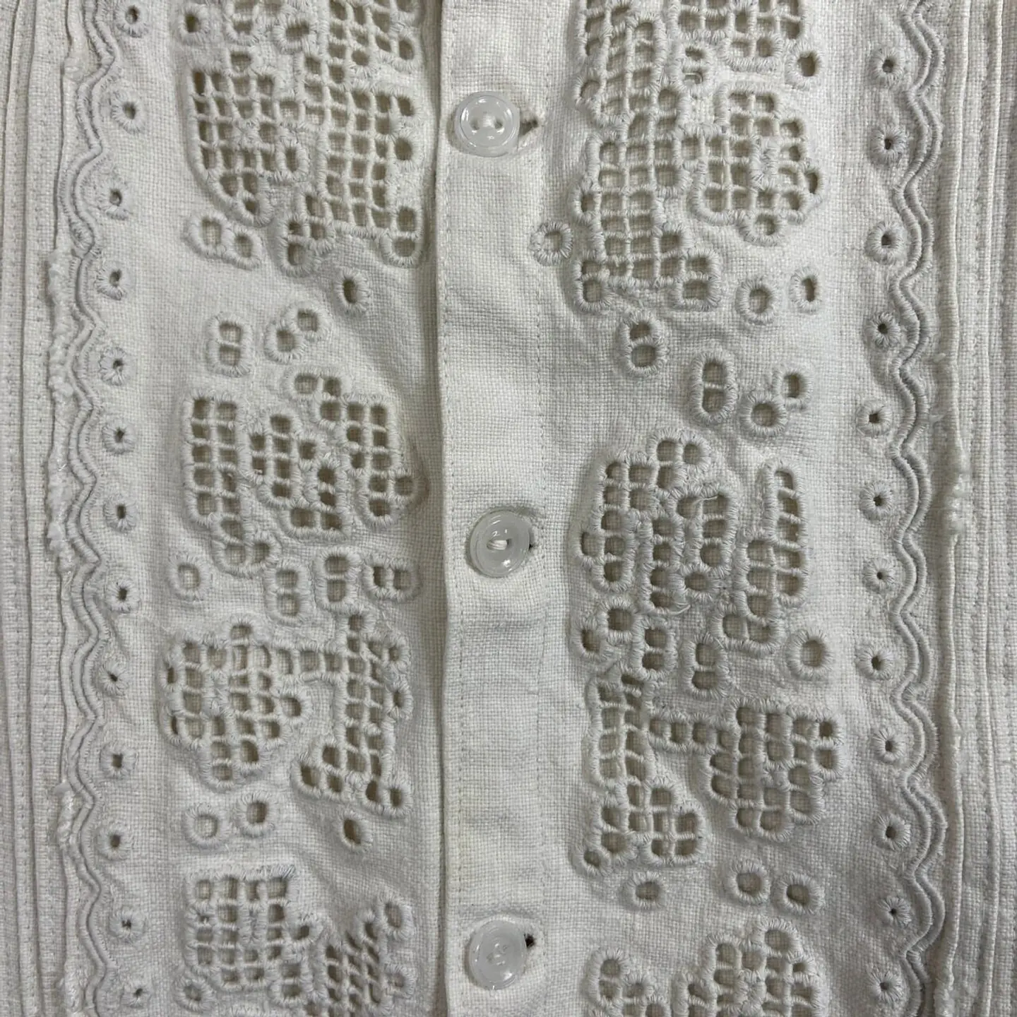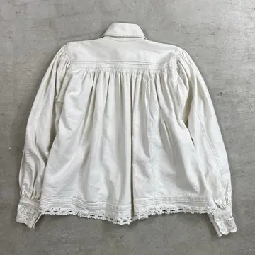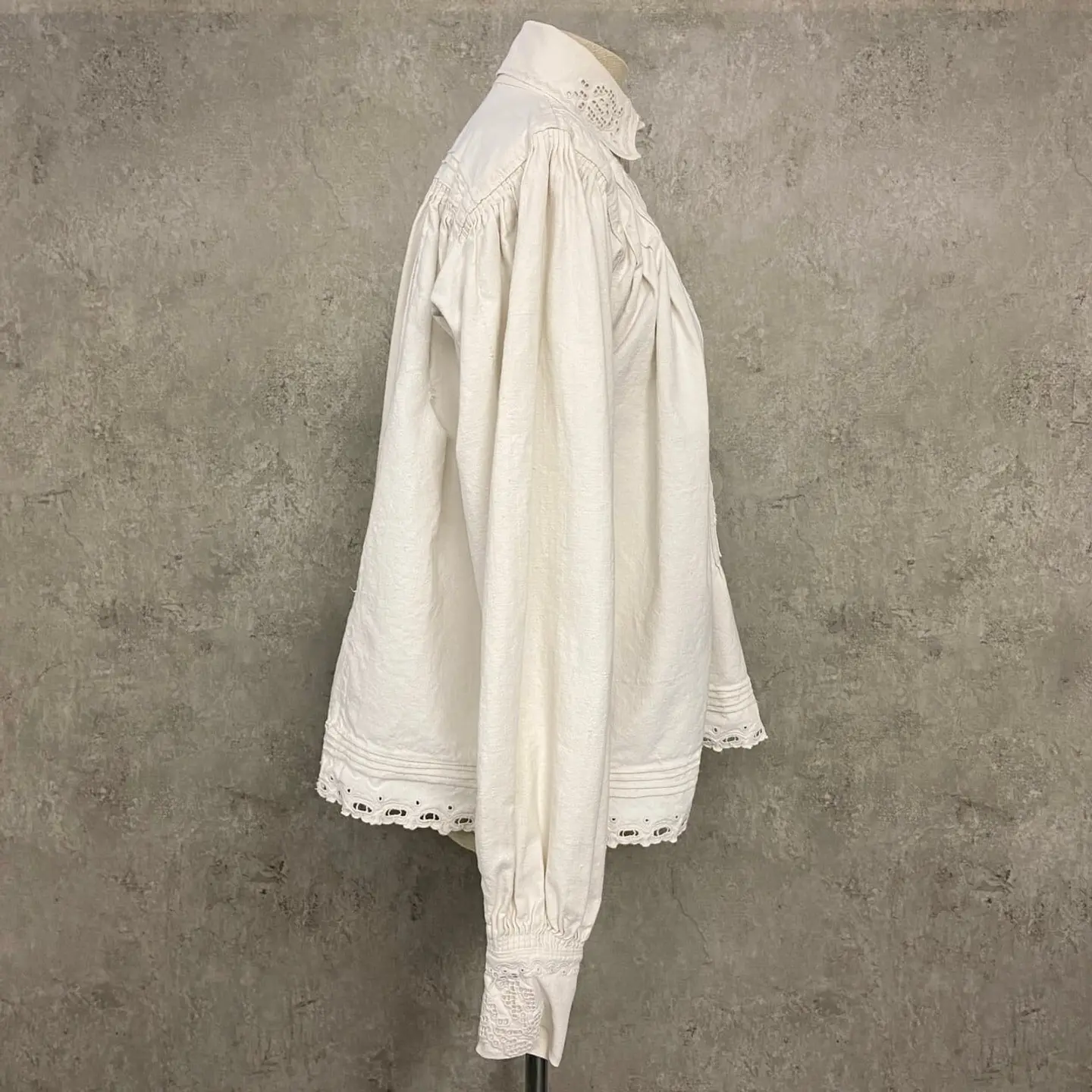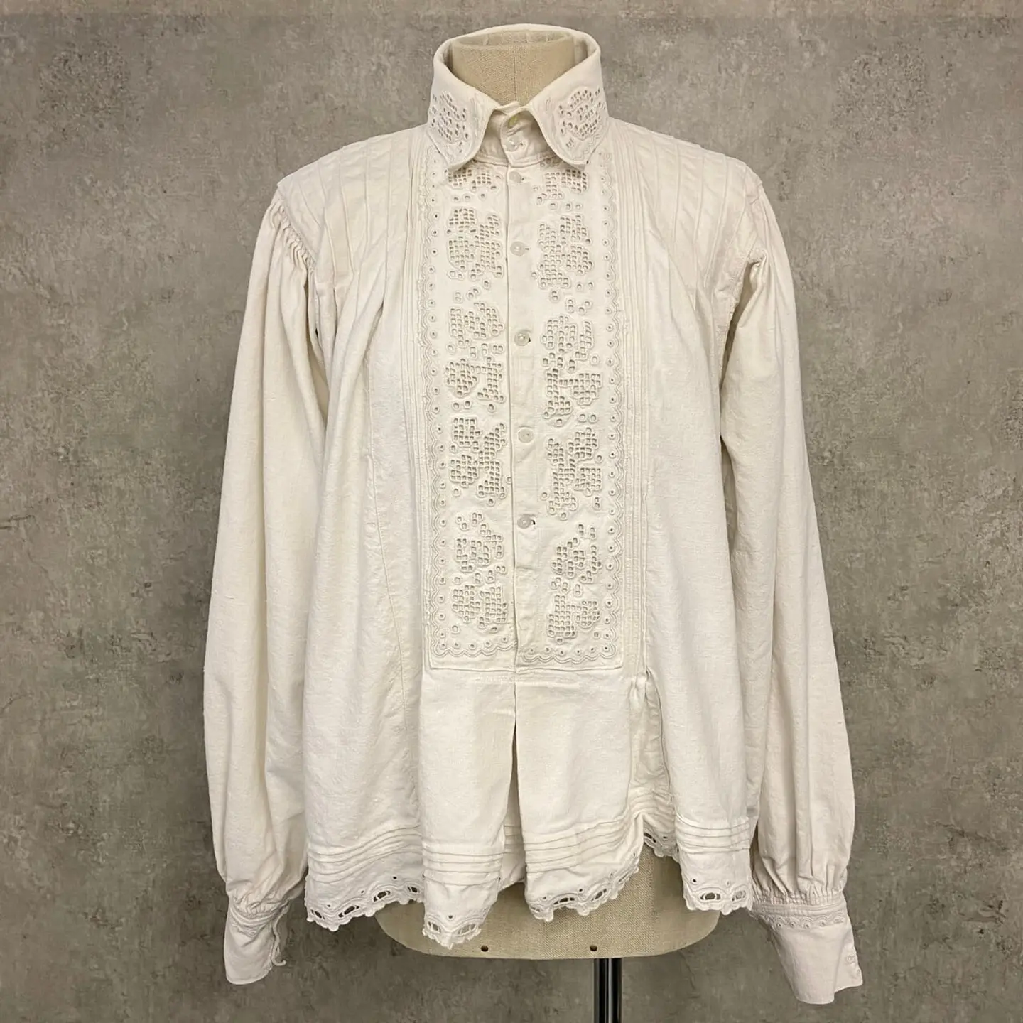 ■1900年代初頭 アンティーク ホワイトワーク刺繍ブラウス 白刺繍ブラウス レディースM相当 古着 VINTAGE ヴィンテージ フランスアンティーク エドワーディアン 白蝶貝ボタン コットンリネン 白色【ブラウス】/ホワイト 〇1900年代初頭から1920年代頃に作られた、極めて希少なアンティーク・ブラウスです。ルーマニア・ビホル(Bihor)地方の伝統的な手刺繍と、当時の西欧(エドワード朝~1920年代)の洗練されたテーラリングが融合した、歴史的価値の高い一着です。 コットンリネンのようなハリのある生地に、繊細なホワイトワークとピンタックが施された美しい一着です。ハリのある質感の中にも柔らかさがあり、アンティークならではの風合いになります。袖には細かなギャザーにより程よいボリュームスリーブ。白蝶貝ボタンも当時の時代を感じるディテールです。伝統的な民族衣装の多くが直線裁断のスモック型であるのに対し、こちらは「セットインスリーブ(肩のライン)」と「前開きのシャツ構造」を採用。身体のラインを美しく見せる西欧的なシルエットにアップデートされています。 脇はパネル切り替えによる立体的な仕立てになっています。 【サイズ】(着用感レディースM~L相当) ※計測値をご確認ください。 着丈…65 肩幅…40 袖丈…69 【生産国】フランスまたはフランス圏内(推定) 【素材】コットンリネンのような風合いの生地 【状態】100年以上前の商品ですが、目立ったダメージや汚れもほとんどなく着用感も感じられない状態です。画像でお確かめください。 【c260221150】 ※古着は洗濯、検品などのケアを行っております。(新品・デッドストックは洗濯していません。) ※モニターの発色により実物と異なる場合がございます。予めご了承ください。 ※ 海外直輸入USED品になります。