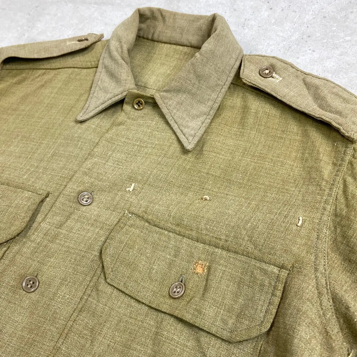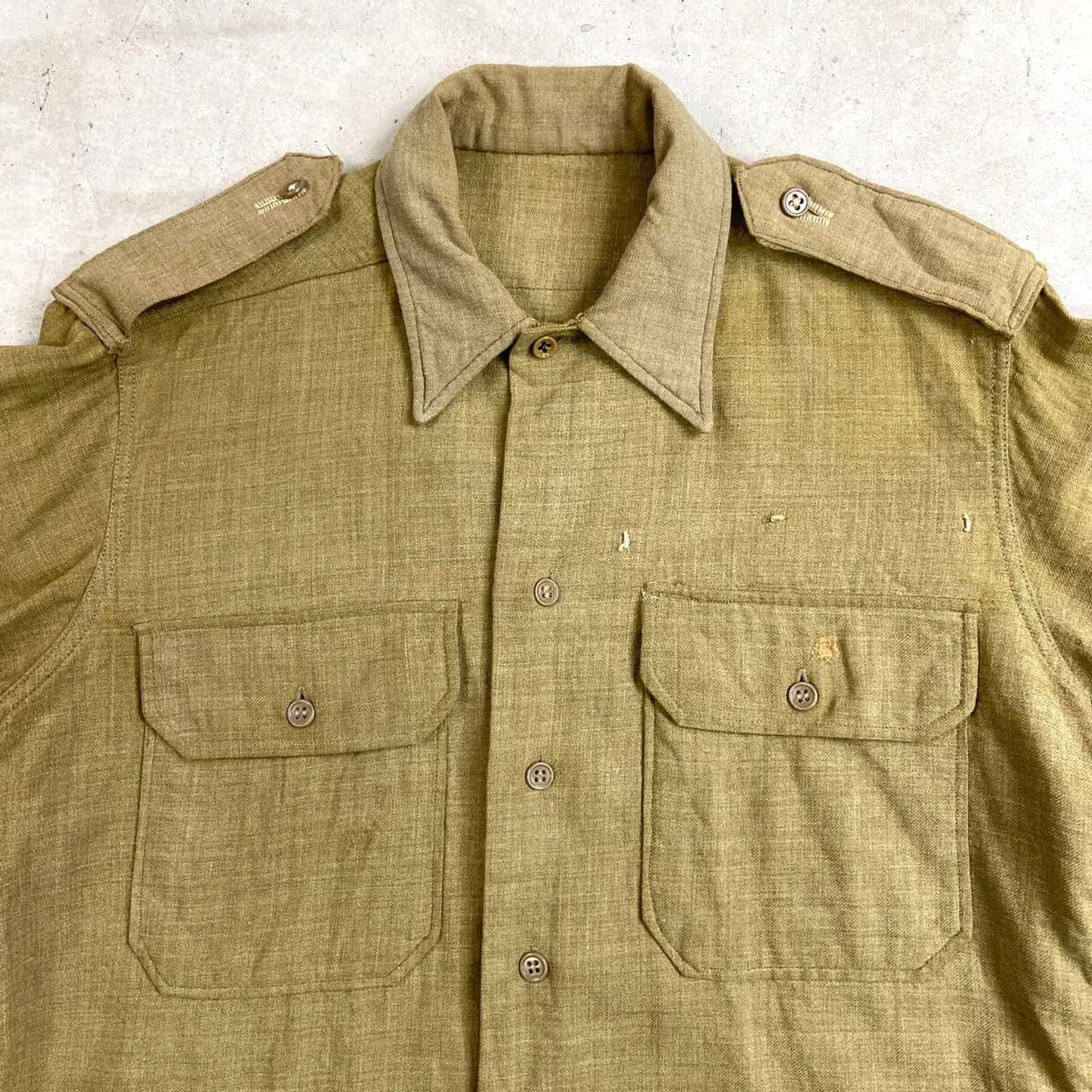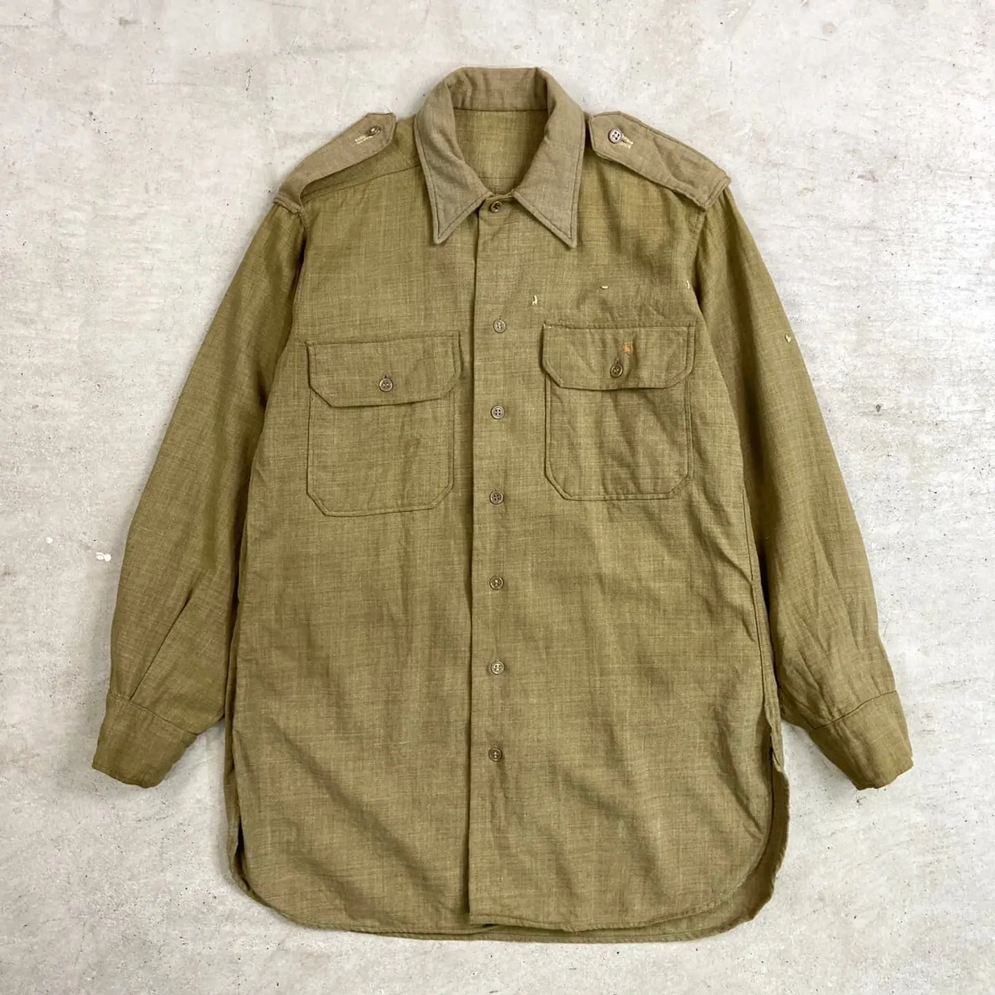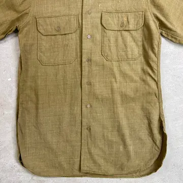 ■40年代 U.S.ARMY 将校用 マスタードシャツ メンズM相当 古着 40s アメカジ ヴィンテージ VINTAGE マチ付き エポレット付き ミリタリーシャツ カーキ【長袖シャツ】/グリーン 【サイズ】表記 15-32(実寸メンズM相当) ※計測値をご確認ください。 着丈…80 身幅…55 肩幅…45 袖丈…57 【状態】全体的に色あせがございます。 フロントに糸が浮き出ております。 裾・脇・バックサイドに一部ダメージがあります。 ポケットや裾にリペア跡があります。 画像にてご確認ください。 【c260214107】 ※古着は洗濯、検品などのケアを行っております。(新品・デッドストックは洗濯していません。) ※モニターの発色により実物と異なる場合がございます。予めご了承ください。 ※ 海外直輸入USED品になります。
