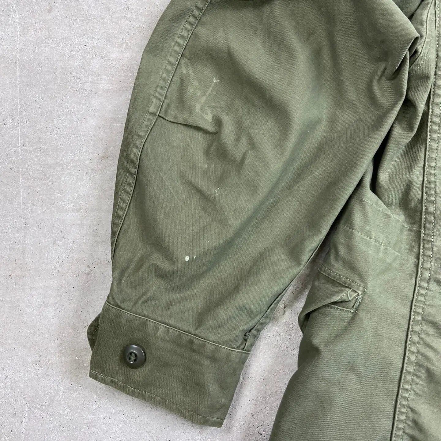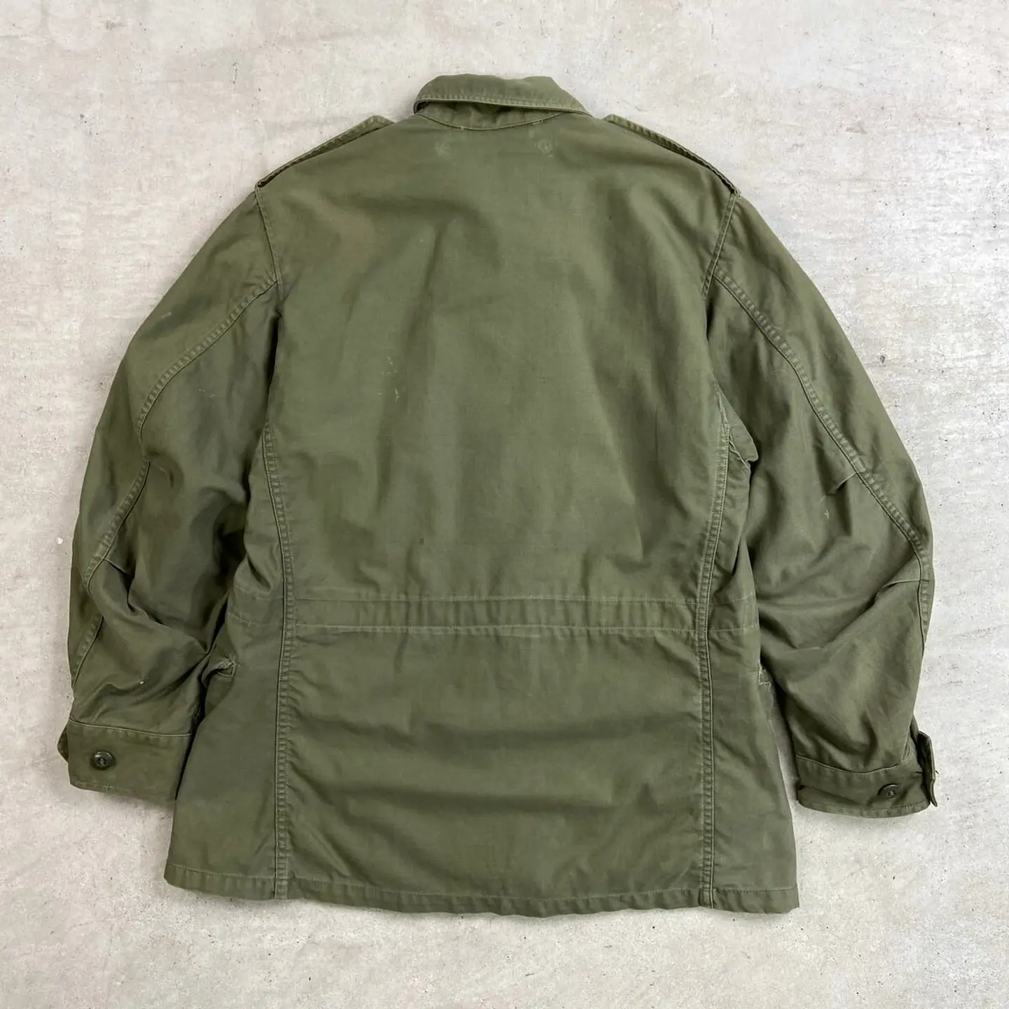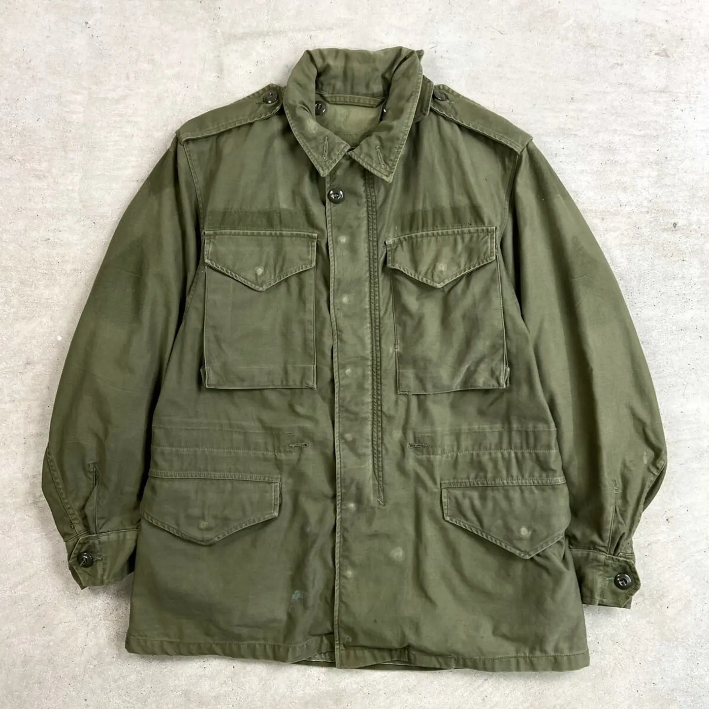 ■50年代 U.S.ARMY 米軍実品 M-51 ミリタリー フィールドジャケット メンズS~M相当 古着 50s M-1951 ヴィンテージ VINTAGE ライナー付き オリーブグリーン【ミリタリージャケット】/カーキグリーン 【サイズ】表記不明(着用感メンズS~M相当) ※計測値をご確認ください。 着丈…74.5 身幅…52.5 肩幅…45 袖丈…55 【生産国】不明 【素材】不明 おそらくコットンかと思われます。 【状態】 腕章痕による色残りがございます。 フロント下部やバックサイドに汚れがあります。 ウエスト・裾ドローコードが欠品しております。 画像にてご確認ください。 【c260214101】 ※古着は洗濯、検品などのケアを行っております。(新品・デッドストックは洗濯していません。)