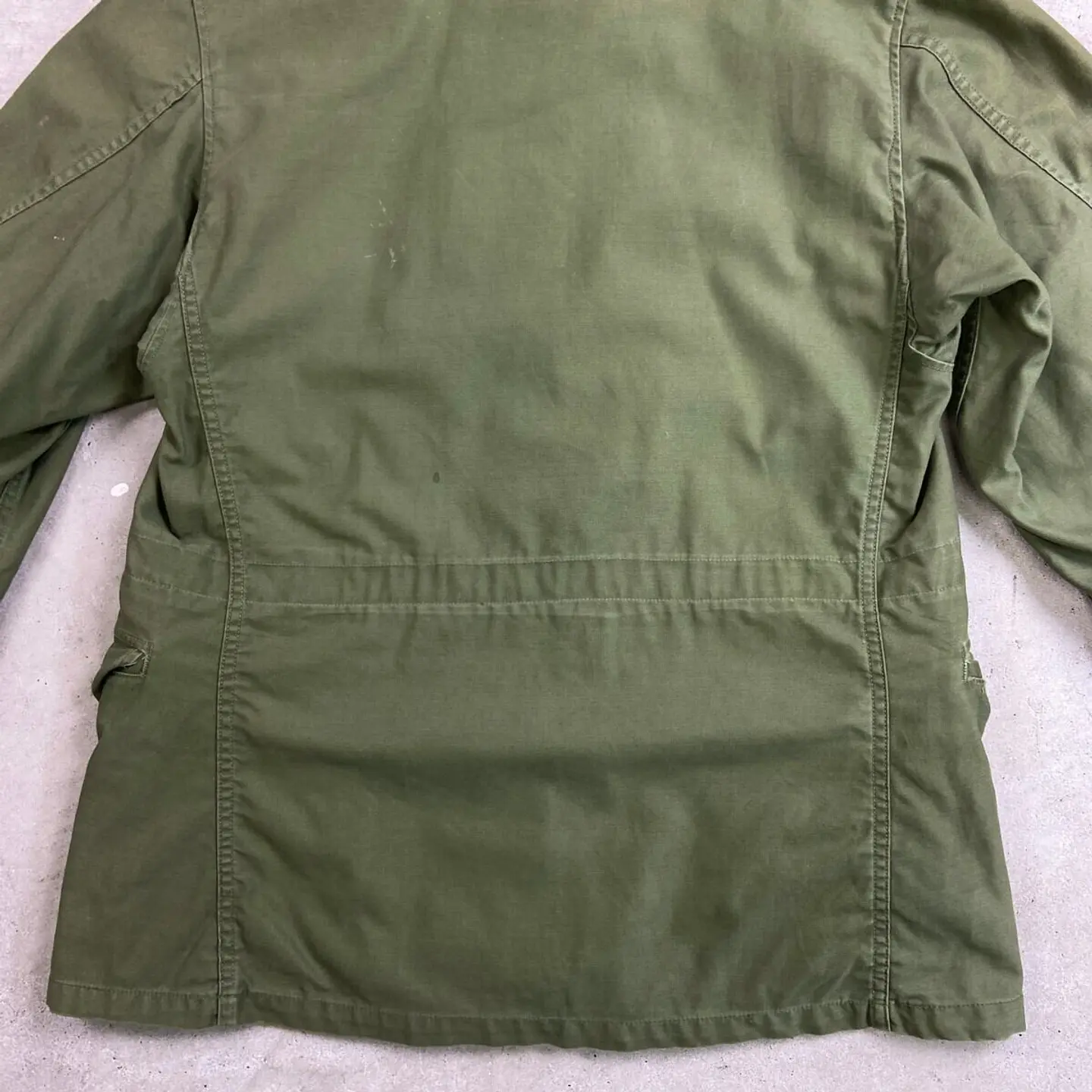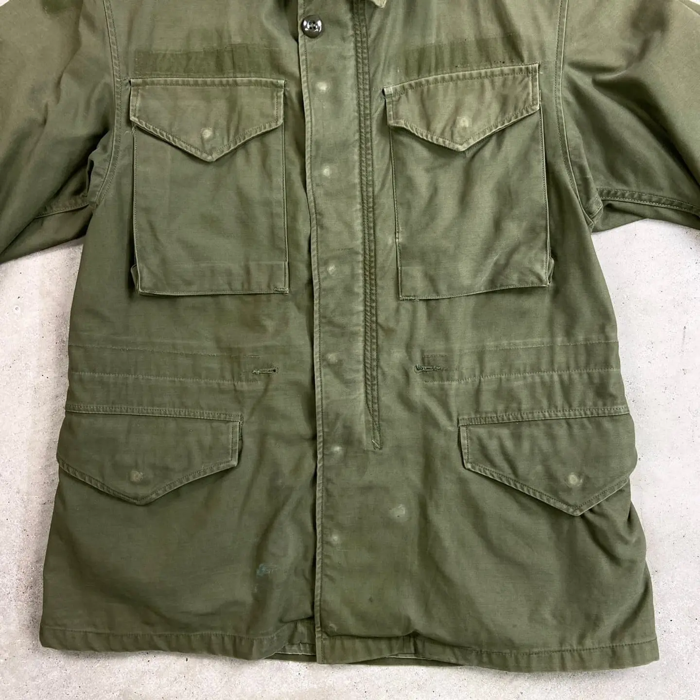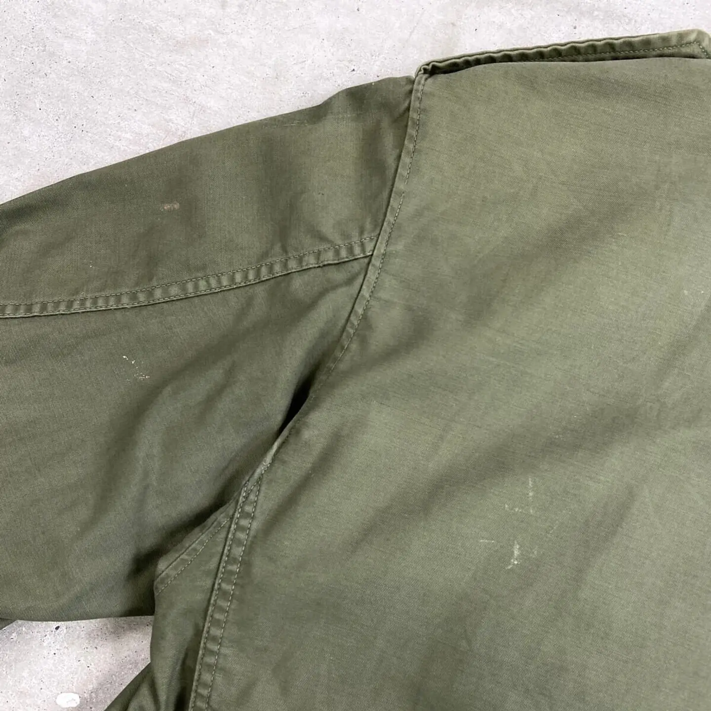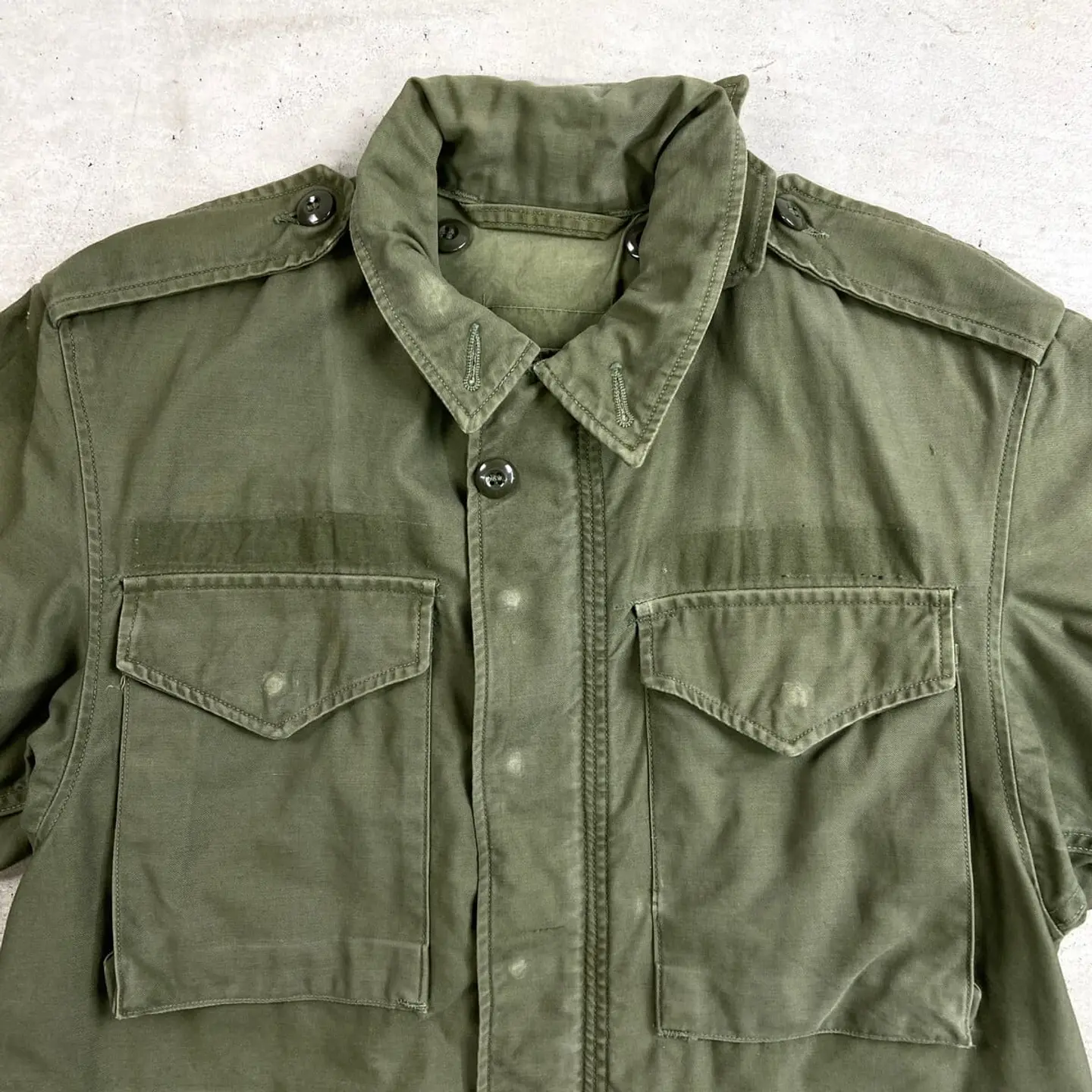 ■50年代 U.S.ARMY 米軍実品 M-51 ミリタリー フィールドジャケット メンズS~M相当 古着 50s M-1951 ヴィンテージ VINTAGE ライナー付き オリーブグリーン【ミリタリージャケット】/カーキグリーン 【サイズ】表記不明(着用感メンズS~M相当) ※計測値をご確認ください。 着丈…74.5 身幅…52.5 肩幅…45 袖丈…55 【生産国】不明 【素材】不明 おそらくコットンかと思われます。 【状態】 腕章痕による色残りがございます。 フロント下部やバックサイドに汚れがあります。 ウエスト・裾ドローコードが欠品しております。 画像にてご確認ください。 【c260214101】 ※古着は洗濯、検品などのケアを行っております。(新品・デッドストックは洗濯していません。)
