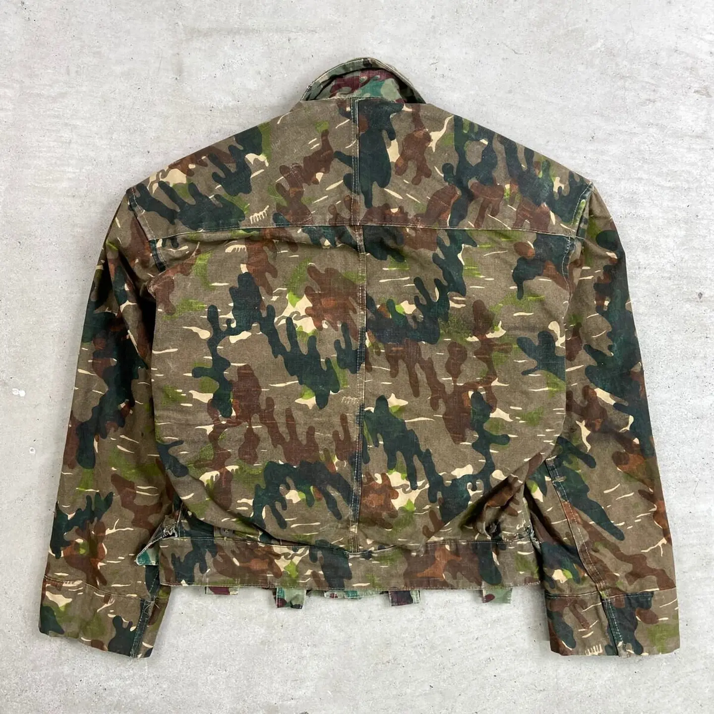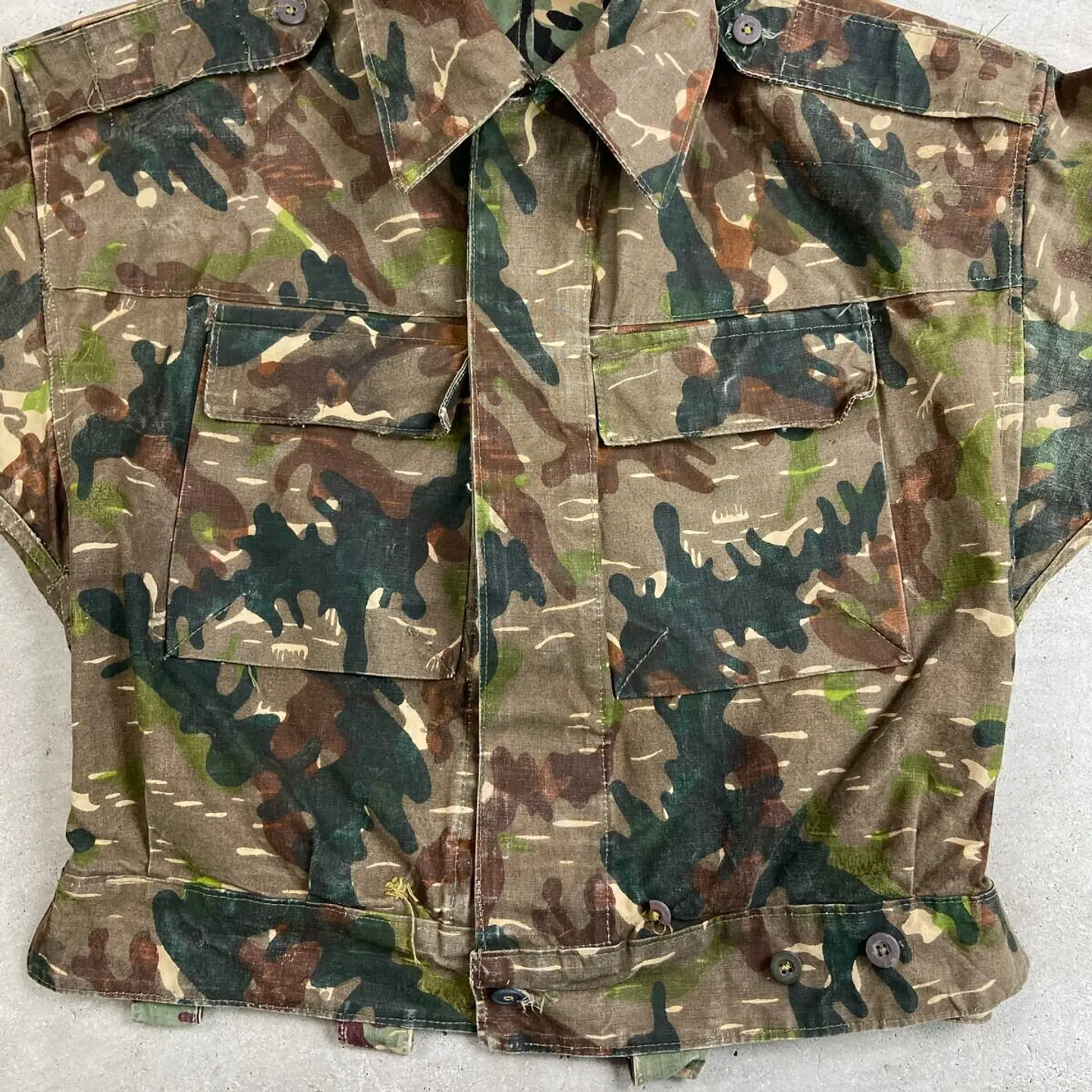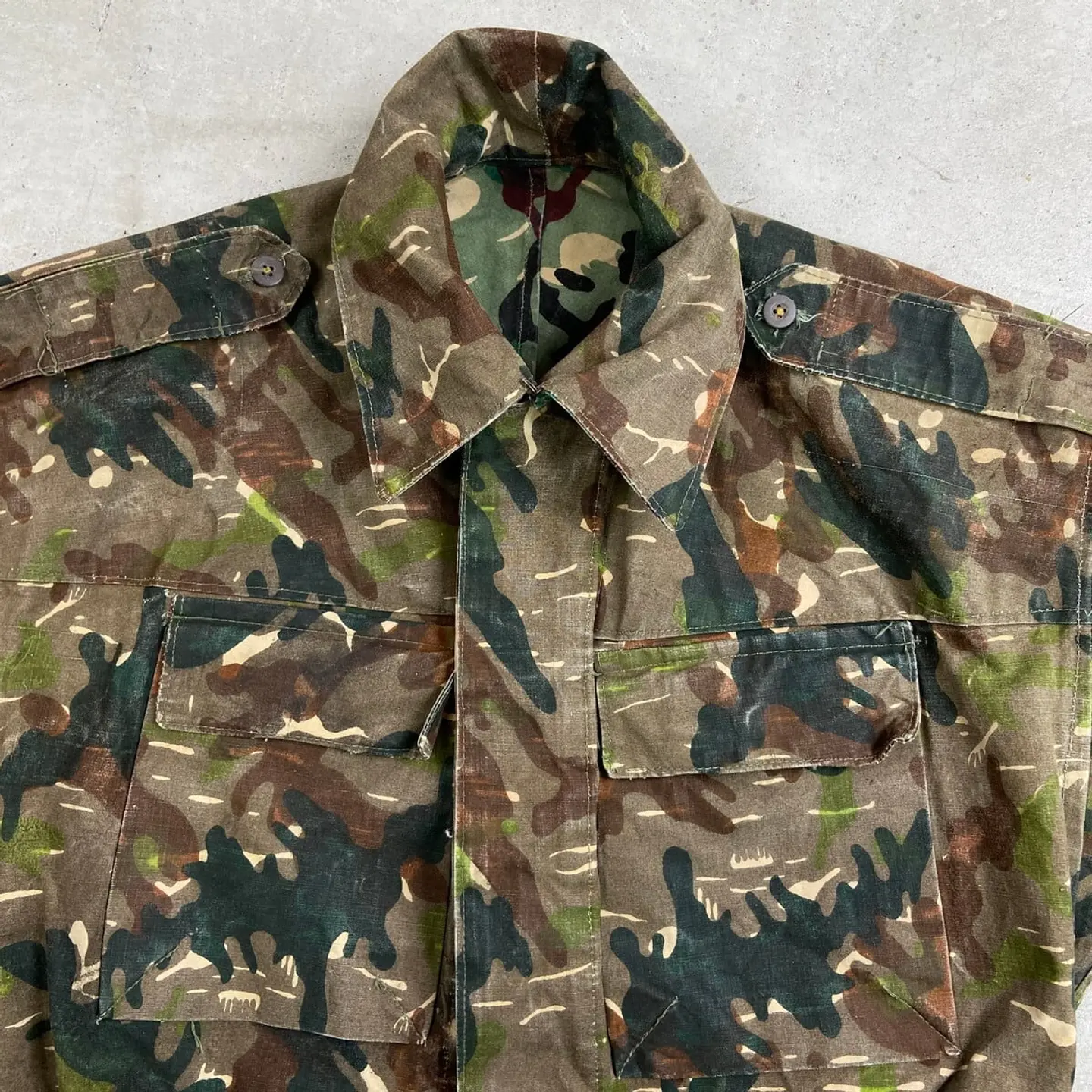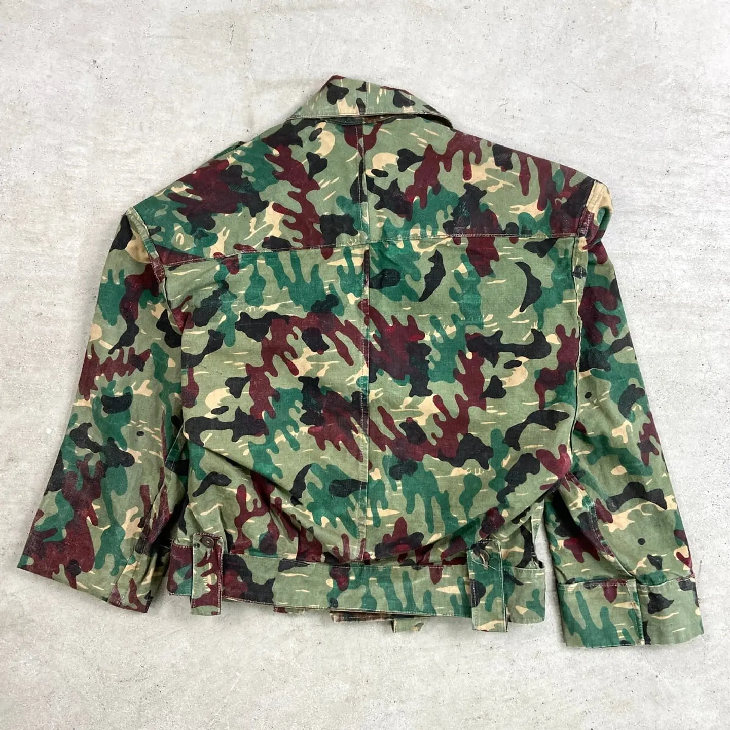 ■50~60年代 スペイン軍 アメーバカモ リバーシブル フィールドジャケット メンズS~M相当 古着 50s 60s ヴィンテージ VINTAGE ユーロミリタリー グリーン カーキグリーン ブラウン 緑 茶色【ミリタリージャケット】/マルチカラー ◎こちらは日本市場ではなかなか流通のない、スペイン軍の激レアジャケットになります。 しかもその中でもかなり希少なリバーシブルタイプになり、パンツもございますのでセットアップにてコレクション可能です。 おそらくスペイン陸軍の特殊作戦中隊 (COE) や空挺部隊 (パラカイディスタ)のエリート隊員のみが着用していたものかと思われます。 スペイン軍にミリタリーアイテムを支給していたE.C.I.VESTUARIO社製のものになります。 市場に出回らないスーパーレアアイテムになりますのでお探しだった方はお早めにどうぞ。 【ブランド】E.C.I.VESTUARIO社製 【サイズ】表記 5(着用感メンズS~M相当) ※計測値をご確認ください。 着丈…55.5 身幅…48.5 肩幅…50 袖丈…49.5 【生産国】不明 【素材】不明 おそらくコットンかと思われます。 【状態】 裾付近のボタン割れ、ブラウンカモの面の第1・2ボタンの欠損(リバーシブルになりますので、グリーンカモの面のボタンにて開閉可能)などはございますが、 その他目立った汚れやダメージ等は無く綺麗な状態でまだまだ長くご愛用していただけます。 画像にてご確認ください。 【c260214024】 ※古着は洗濯、検品などのケアを行っております。(新品・デッドストックは洗濯していません。) ※モニターの発色により実物と異なる場合がございます。予めご了承ください。 ※ 海外直輸入USED品になります。