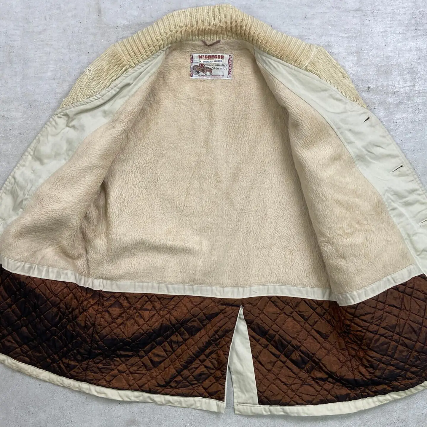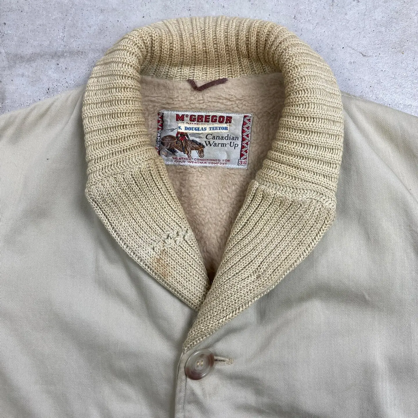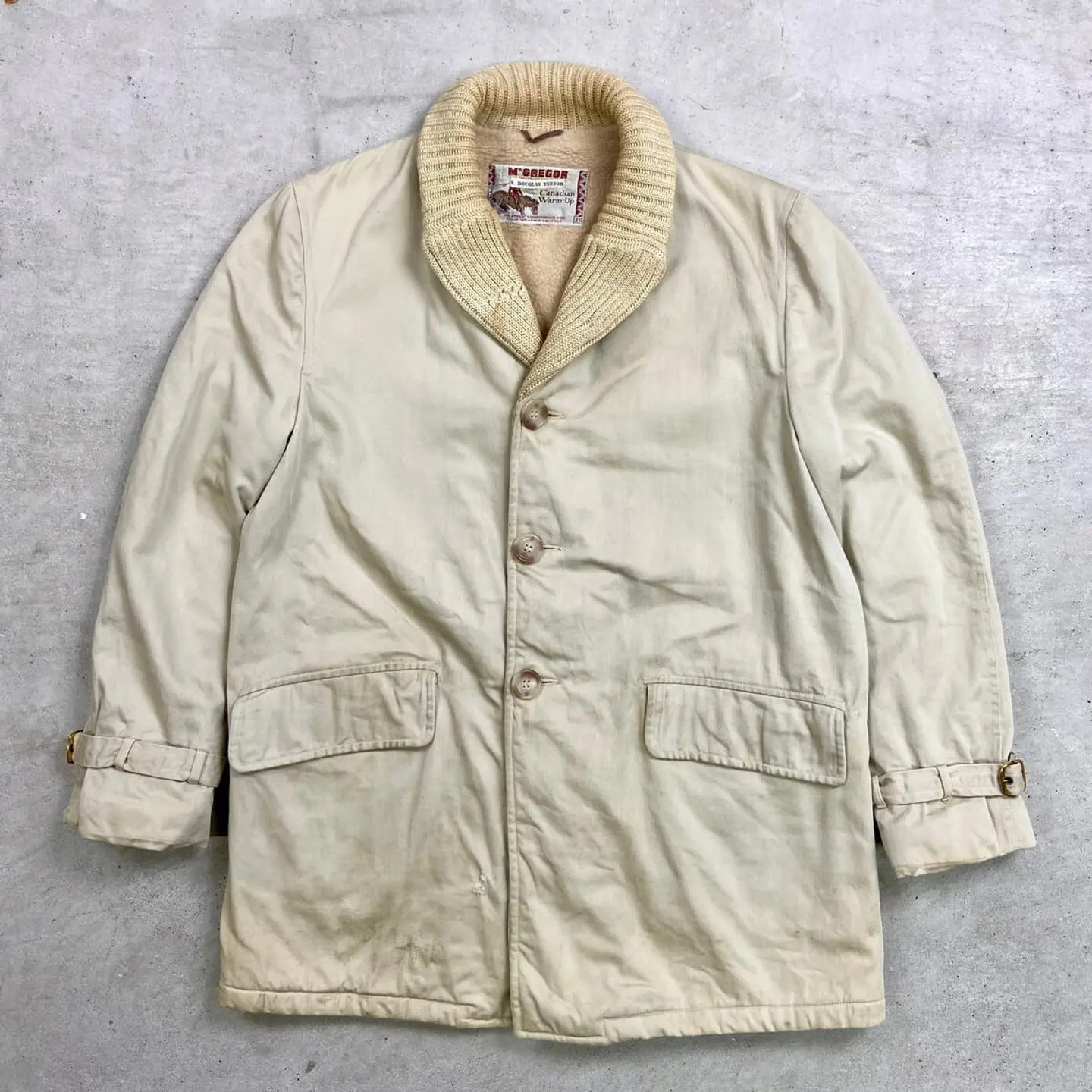 ■60年代 McGREGOR マクレガー Canadian Warm-up ファラオジャケット メンズM~L相当 古着 60s VINTAGE ヴィンテージ ファラオコート【ブルゾン・ジャケット】/ベージュ 【ブランド】McGREGOR マクレガー 【サイズ】表記 38(実寸メンズM~L相当) ※計測値をご確認ください。 着丈…81 身幅…60 肩幅…45.5 袖丈…62.5 【生産国】表記不明 【素材】表記不明(おそらくコットン) 【状態】 汚れ:袖・バックサイド中心付近・裾に薄汚れあり ダメージ:フロントのニット部分・右ポケット下 バックサイド上部にリペア跡痕あり 画像にてご確認ください 【c260207118】 ※古着は洗濯、検品などのケアを行っております。(新品・デッドストックは洗濯していません。) ※モニターの発色により実物と異なる場合がございます。予めご了承ください。 ※ 海外直輸入USED品になります。