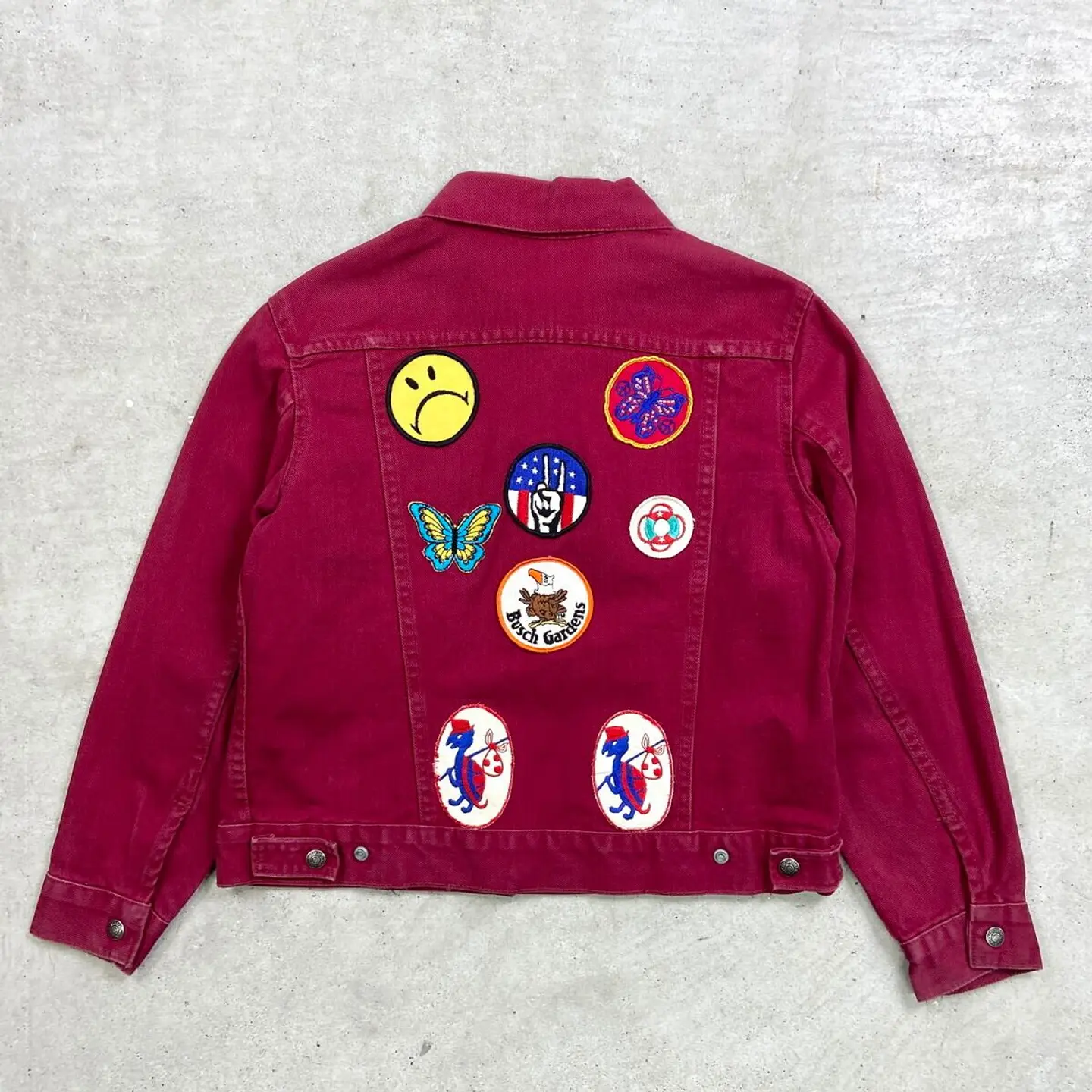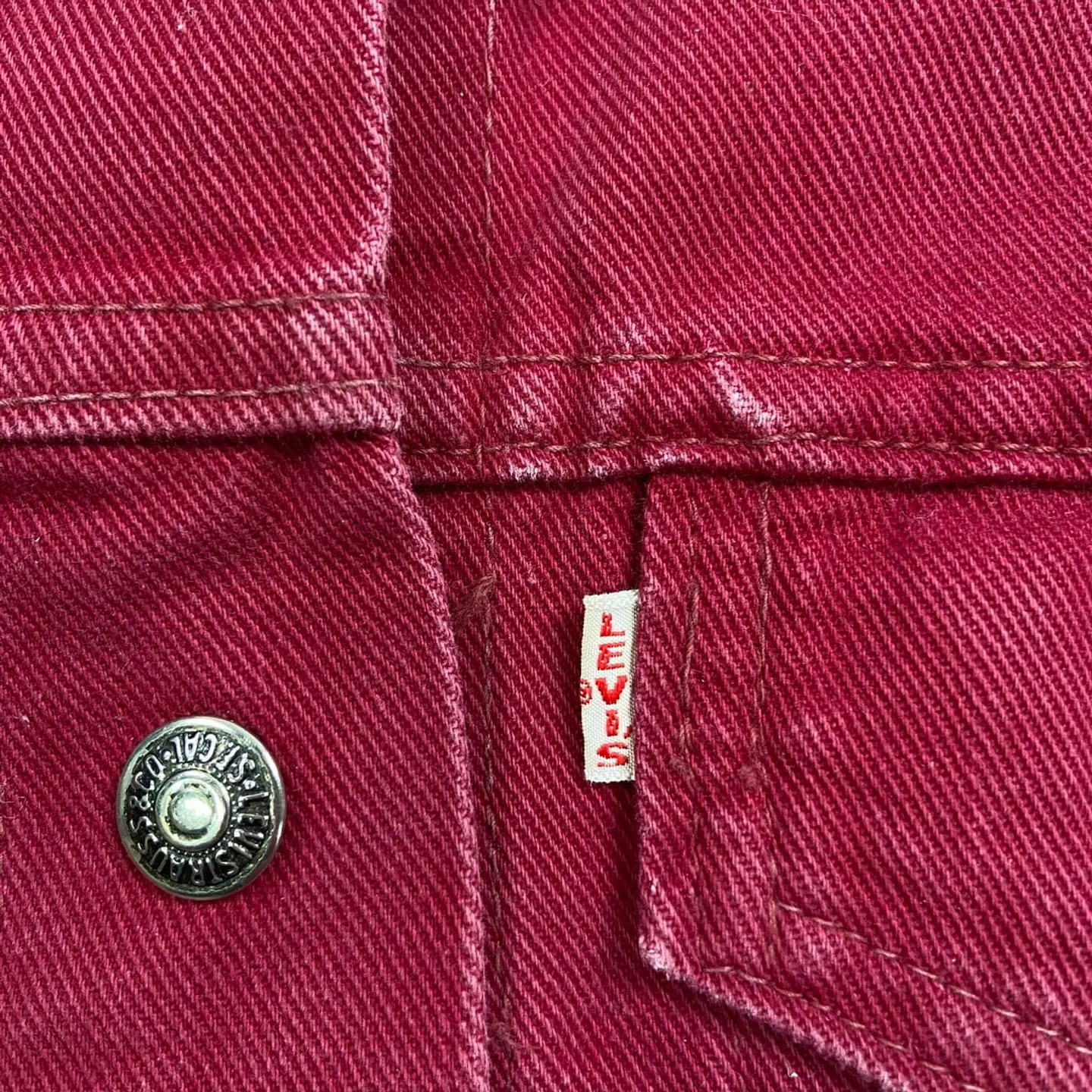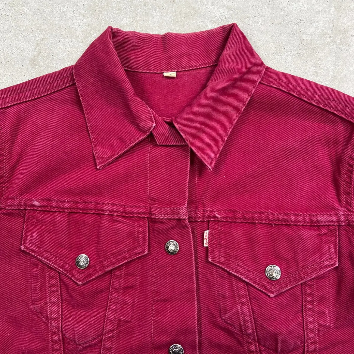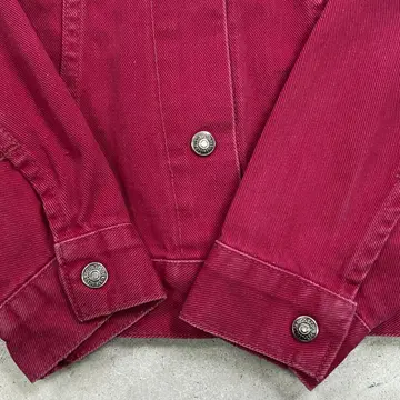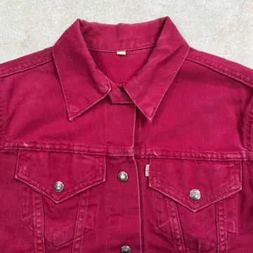 ■60~70年代 BIG E Levi's For Gals リーバイス 白タブ トラッカージャケット レディースXS相当 古着 60s 70s VINTAGE ヴィンテージ アメカジ ワッペンカスタム えんじ色【デニムジャケット】/ワインレッド 【ブランド】Levi's リーバイス 【サイズ】表記 M (実寸レディースXS相当) ※計測値をご確認ください。 着丈…50.5 身幅…49.5 肩幅…41.5 袖丈…53.5 【生産国】不明 【素材】不明(おそらくコットンかと思われます) 【状態】使用感による色あせが所々にございます。 汚れ:バックサイド左肩に薄汚れ(写真7) 画像にてご確認ください。 【c260207110】 ※古着は洗濯、検品などのケアを行っております。(新品・デッドストックは洗濯していません。)