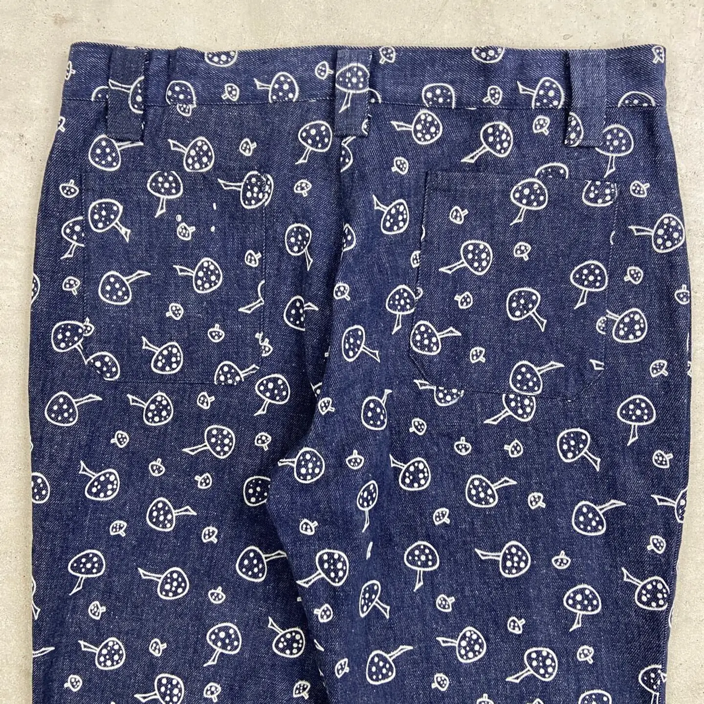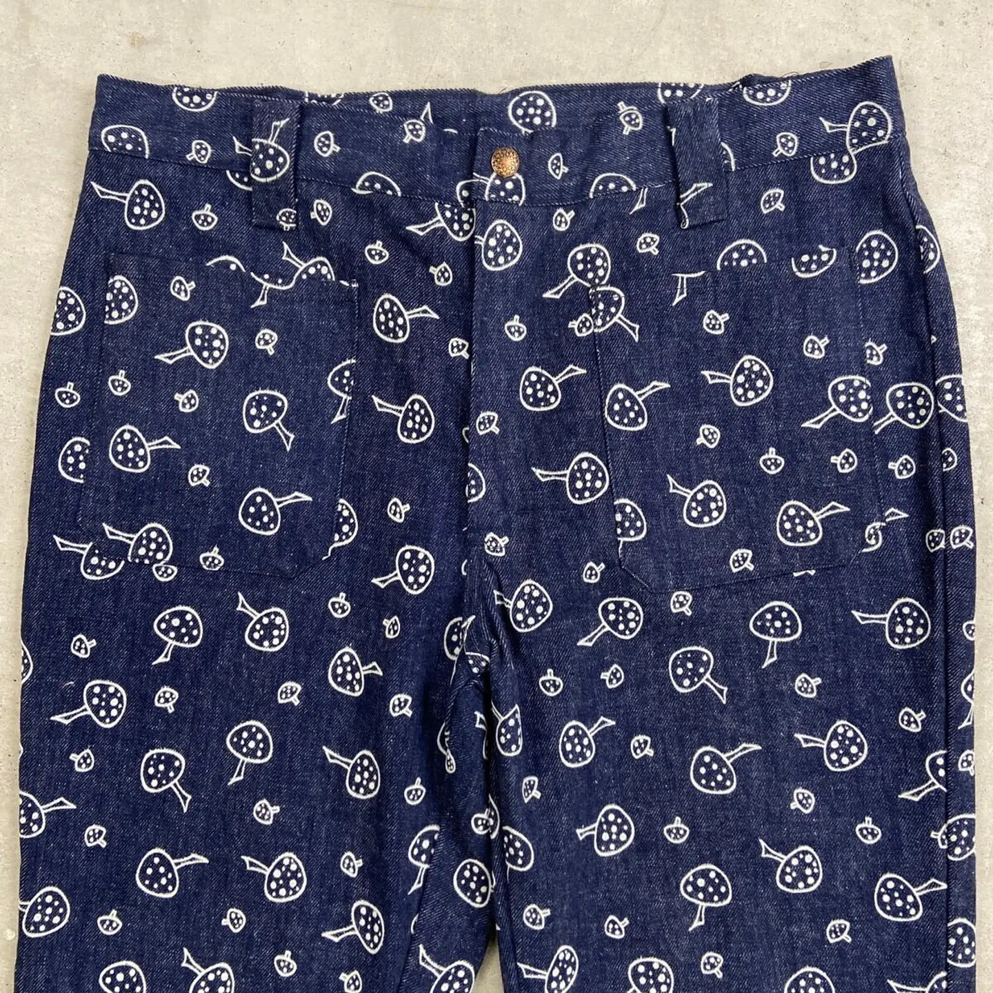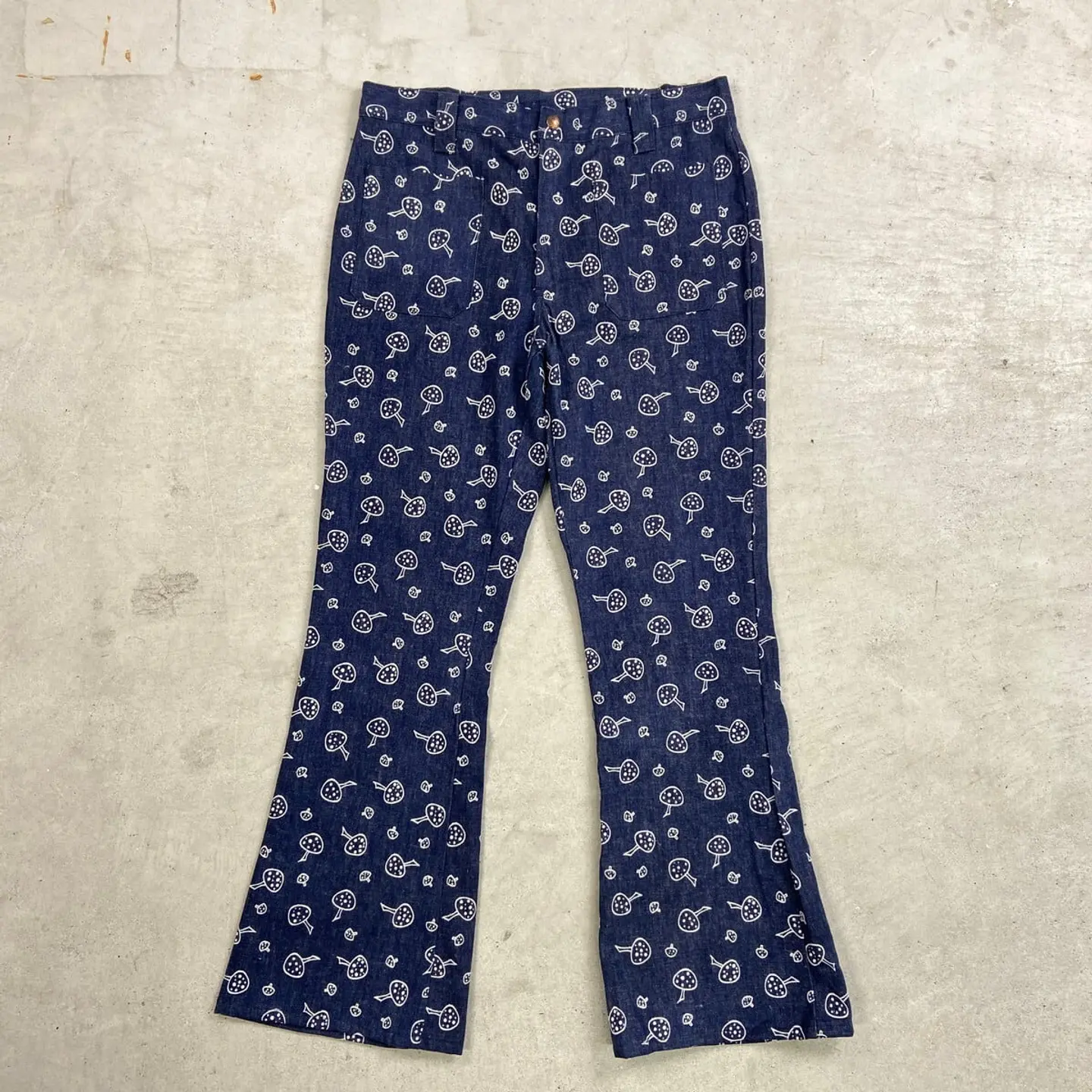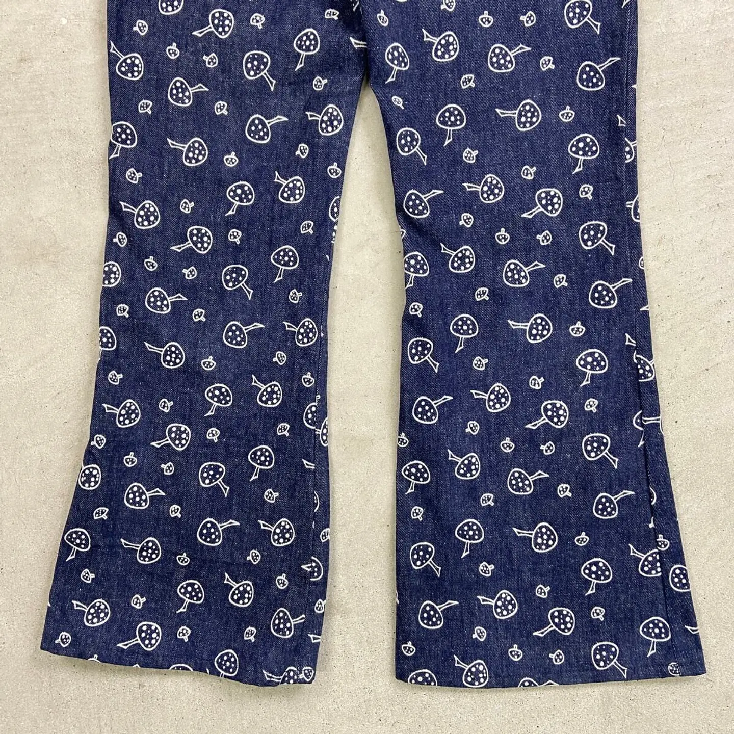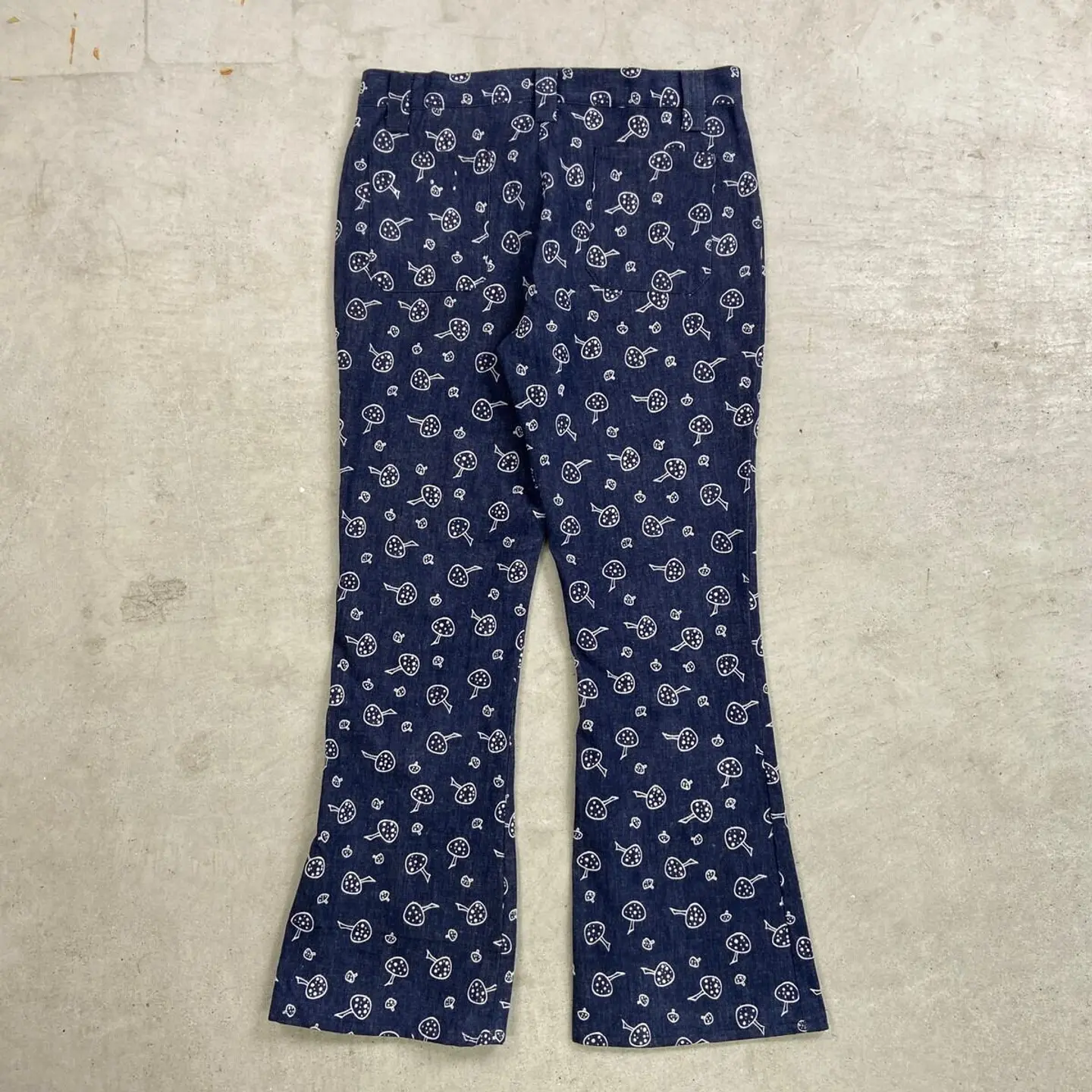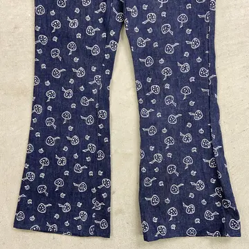 ■70年代 総柄 キノコ柄 デニムフレアパンツ メンズW34相当 古着 70s VINTAGE ヴィンテージ アメカジ ストア系 ジーンズ 濃紺 紺色【デニムパンツ】/ネイビー ◎70年代頃のストア系ブランドの デニムフレアパンツになります。 人気の総柄アイテムでグッドなキノコ柄。 あまり市場に出回らないコレクタブルアイテムになります。 【サイズ】表記 不明(実寸約W34相当) ※計測値をご確認ください。 ウエスト(平置き×2)…86 ワタリ幅…29 股上…29 股下…81 裾幅…27 【生産国】不明 【素材】不明 おそらくコットンかと思われます。 【状態】あまり使用感もなく綺麗な状態です。 画像にてご確認ください。 【c260207015】 ※古着は洗濯、検品などのケアを行っております。(新品・デッドストックは洗濯していません。) ※モニターの発色により実物と異なる場合がございます。予めご了承ください。 ※ 海外直輸入USED品になります。