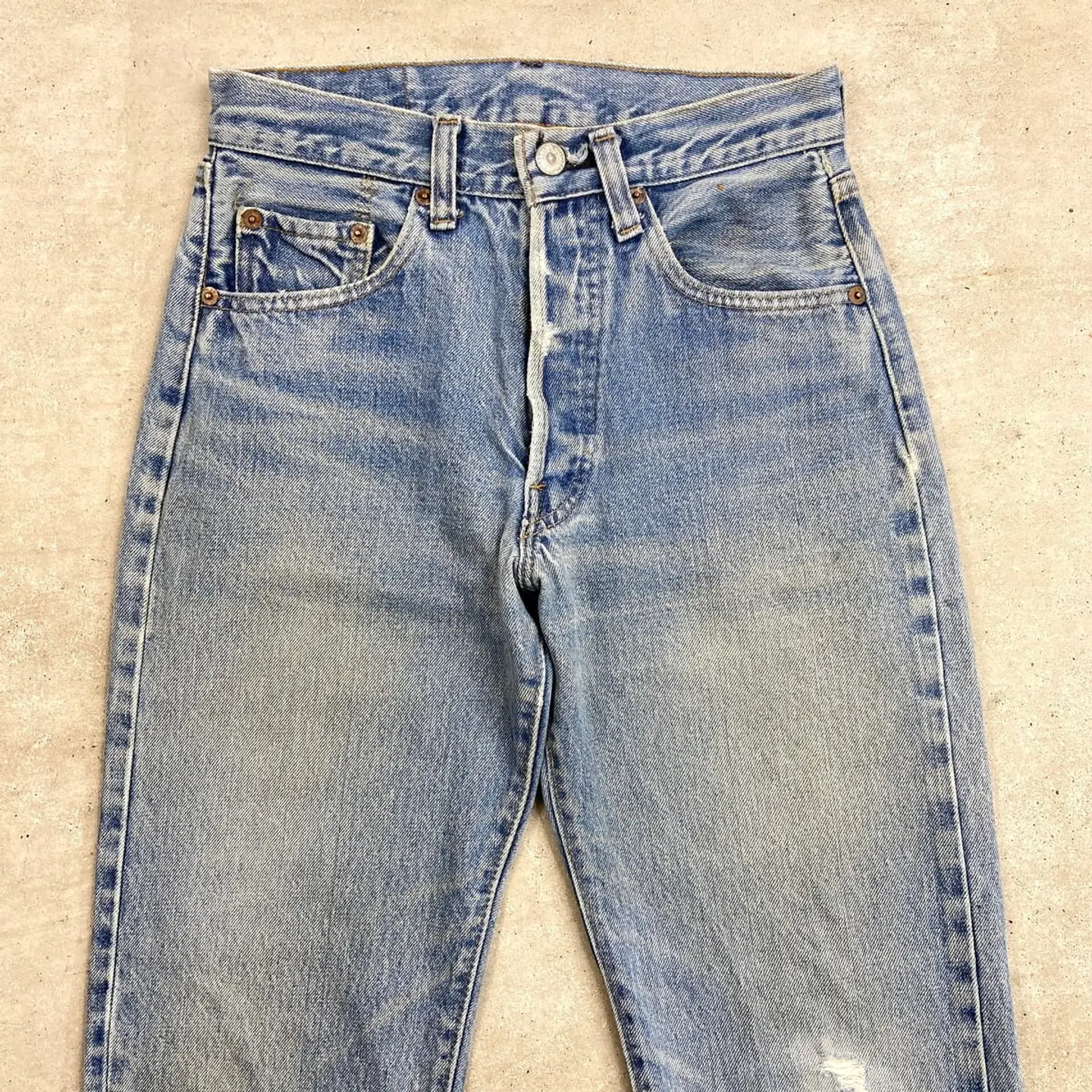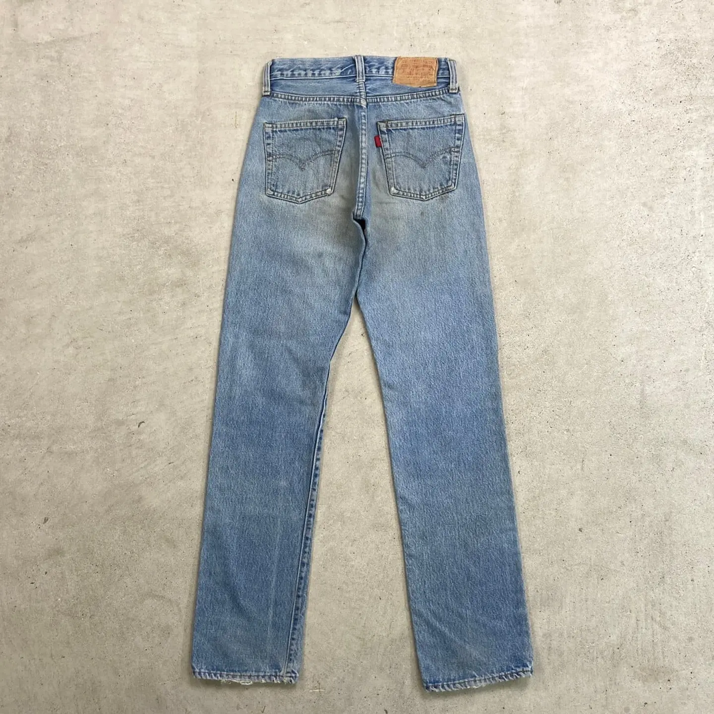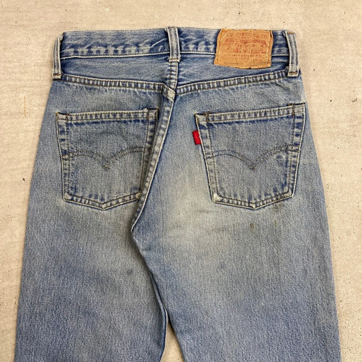 ■80年代 USA製 Levi's リーバイス 501 66後期 赤耳 移行期 ストレートデニムパンツ メンズW25相当 レディース 古着 80s ヴィンテージ VINTAGE アメカジ ジーンズ RED LINE レッドライン ポケット裏チェーンステッチ 黒カンヌキ アタリ ヒゲ 青色【デニムパンツ】/ブルー ◎こちらは1980年製のリーバイス501で、 工場番号が6番、ケアタグの収縮率が10%であることから、66後期から赤耳モデルになる過渡期になった個体です。 【ブランド】Levi's リーバイス ・トップボタン裏刻印 6 【サイズ】表記 W27 L36(実寸約W25 L32) ※裾上げされております ウエスト(平置き計測?2)…64 ワタリ幅...27 股上…26.5 股下…82 裾幅…18 【生産国】USA製 【素材】コットン100% 【状態】全体的に使用感による色あせがあり、薄っすらとヒゲがあります。 フロントひざにダメージや裾擦れがございます。 画像にてご確認ください。 【c260228127】 ※古着は洗濯、検品などのケアを行っております。(新品・デッドストックは洗濯していません。)