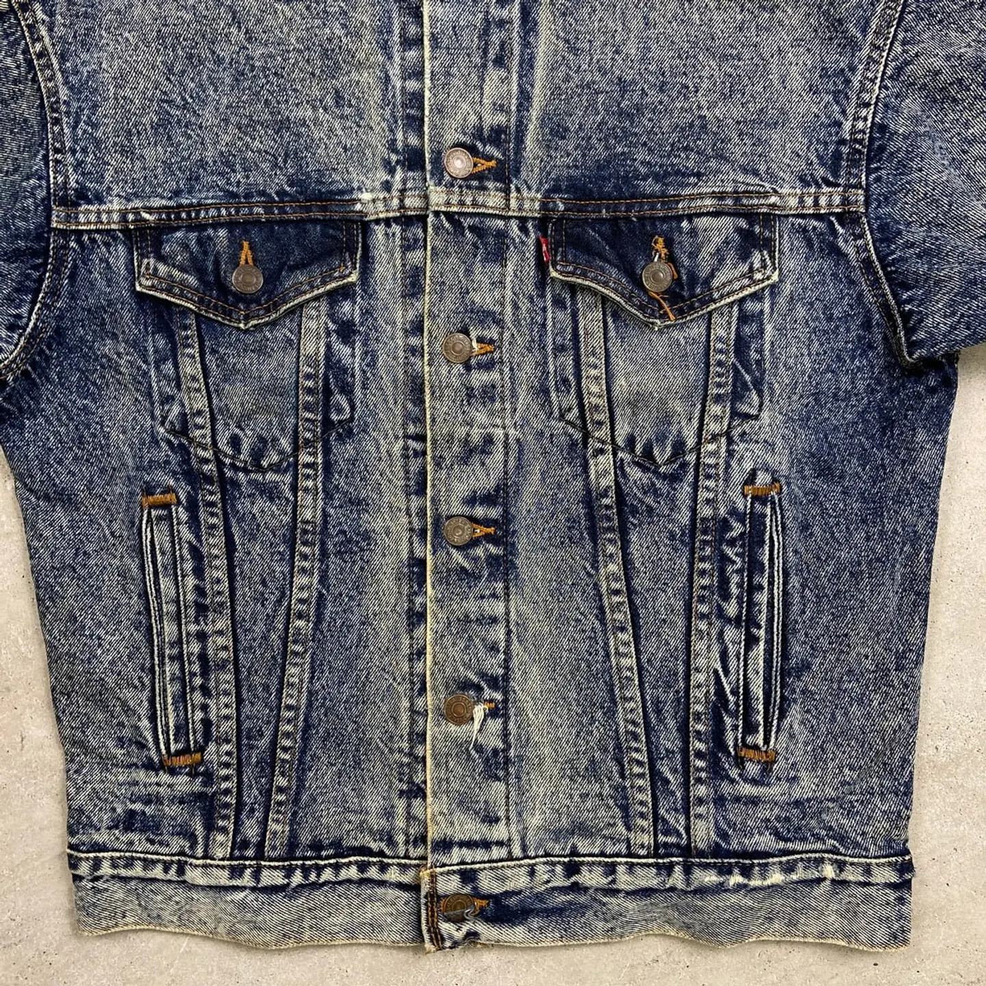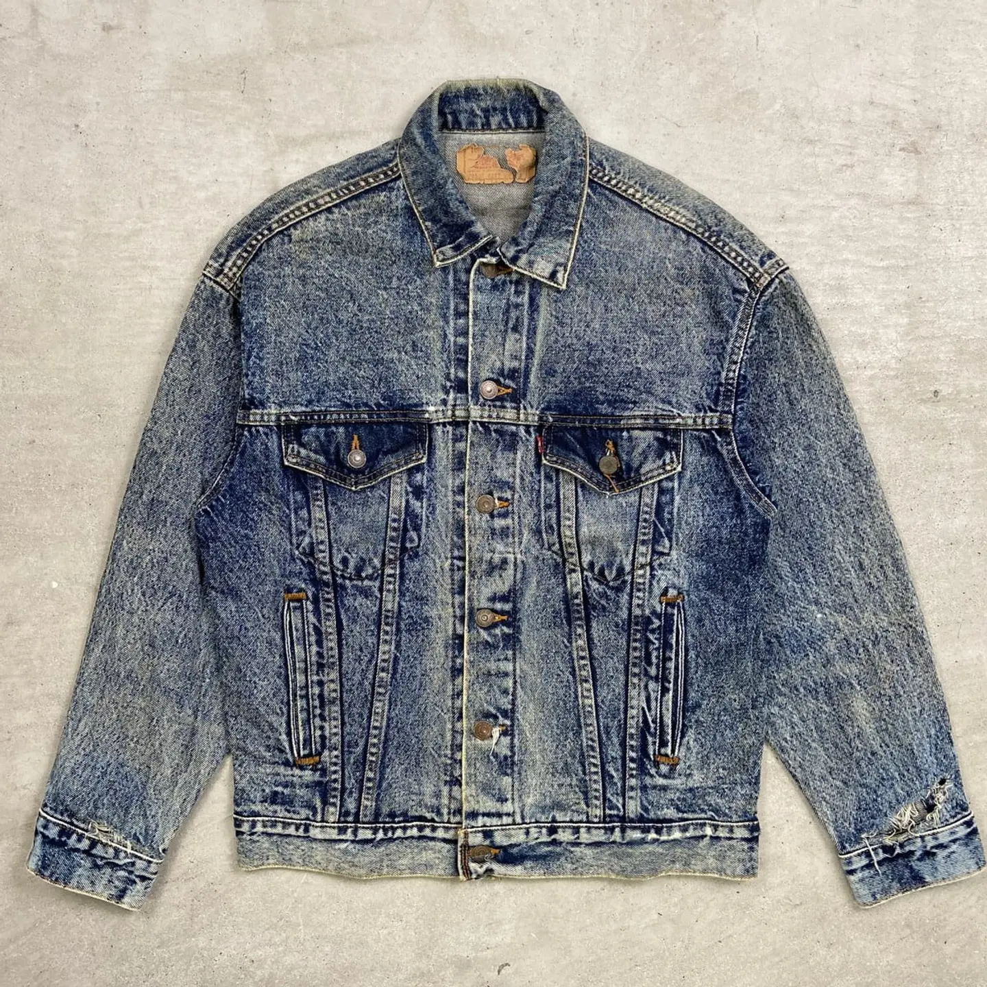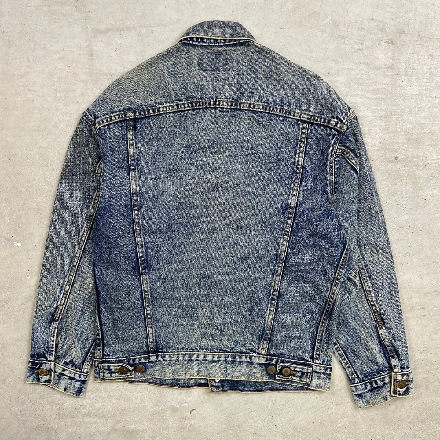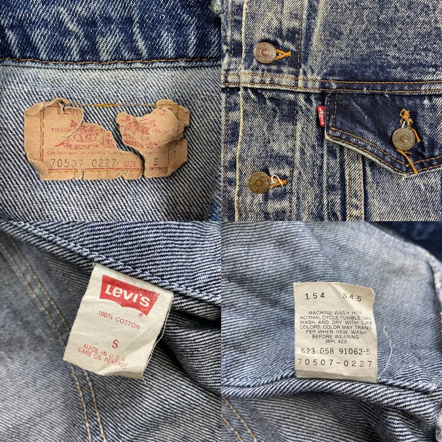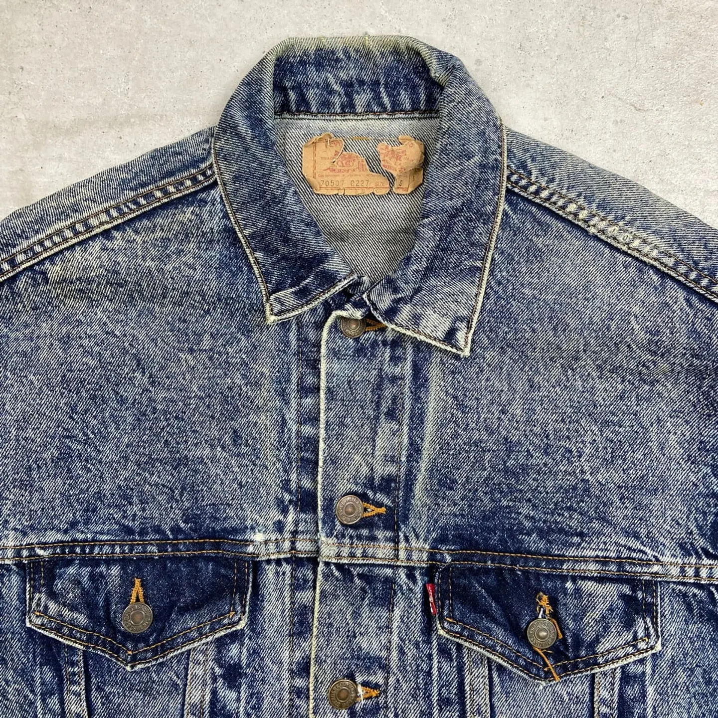 ■80年代 USA製 Levi's リーバイス 70507 0227 ケミカルウォッシュ デニムジャケット メンズM相当 古着 80s ヴィンテージ VINTAGE アメカジ トラッカージャケット 青色【デニムジャケット】/ブルー 【ブランド】Levi's リーバイス 刻印ボタン: 523 【サイズ】表記 S(実寸メンズM相当) ※計測値をご確認ください。 着丈…63 身幅…54 肩幅…53 袖丈…55 【生産国】USA製 【素材】コットン100% 【状態】全体的に使用感による色あせや擦れがございます。 左袖にダメージがあります。 画像にてご確認ください。 【c260228107】 ※古着は洗濯、検品などのケアを行っております。(新品・デッドストックは洗濯していません。) ※モニターの発色により実物と異なる場合がございます。予めご了承ください。 ※ 海外直輸入USED品になります。