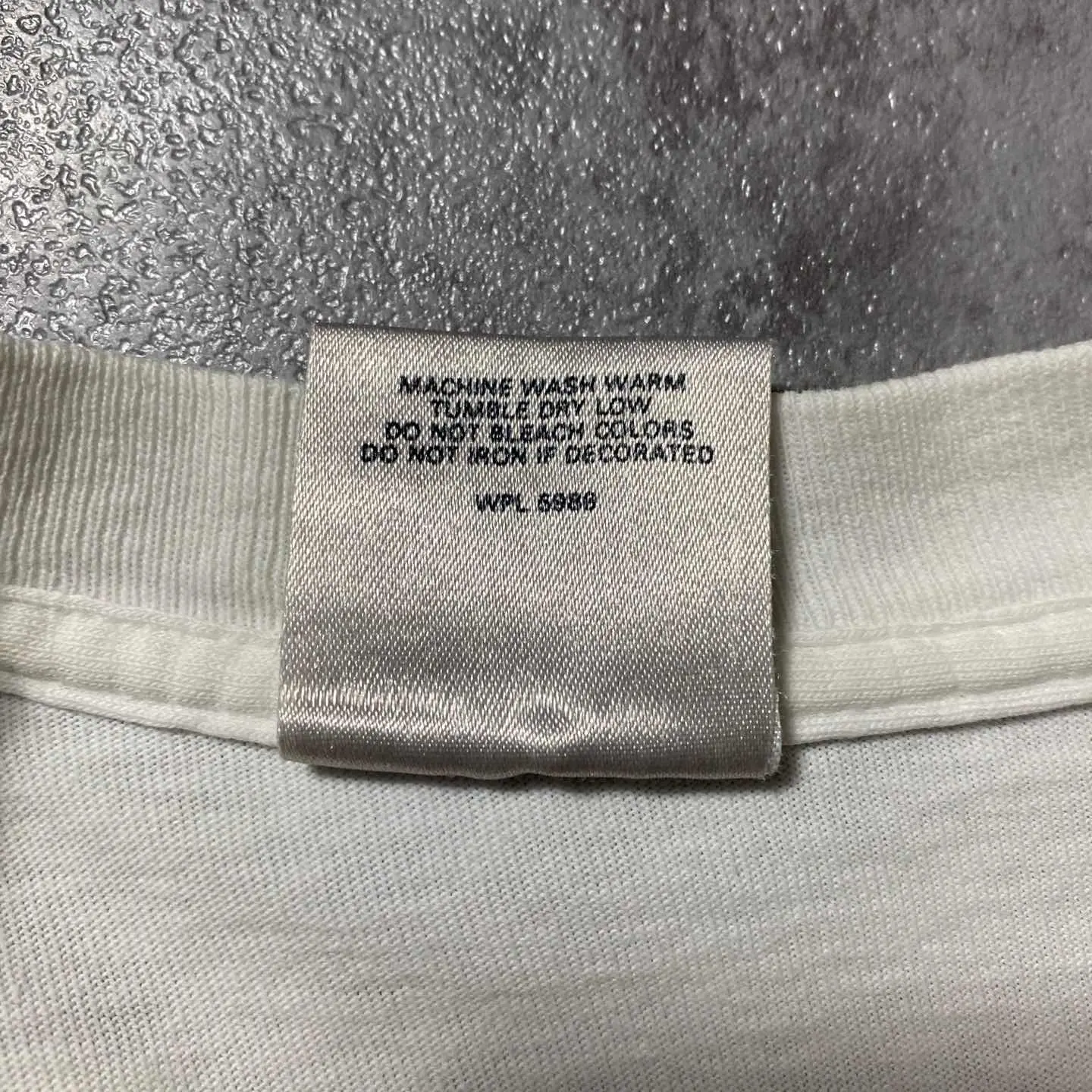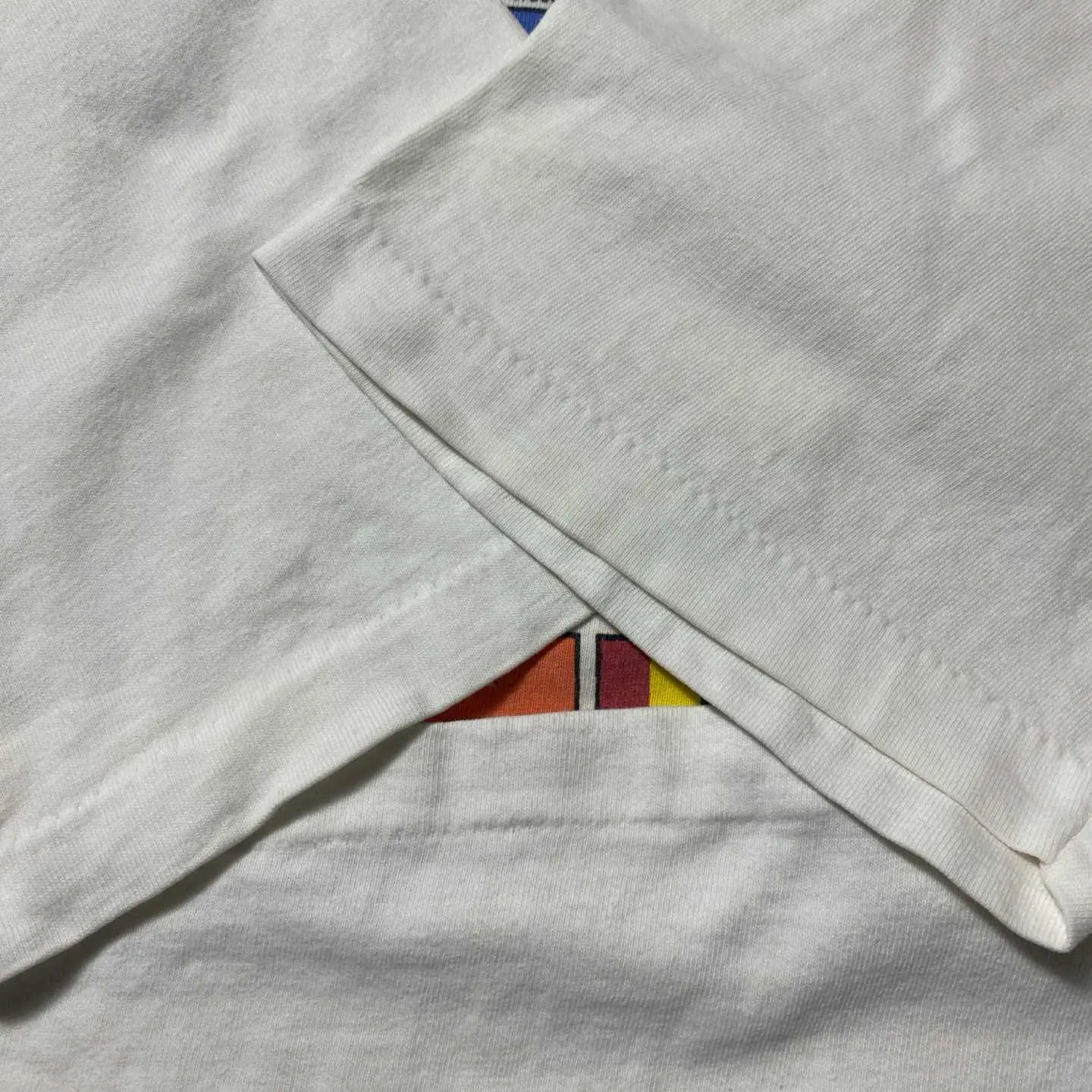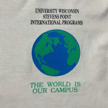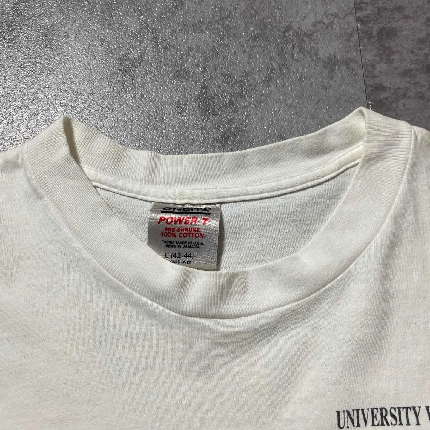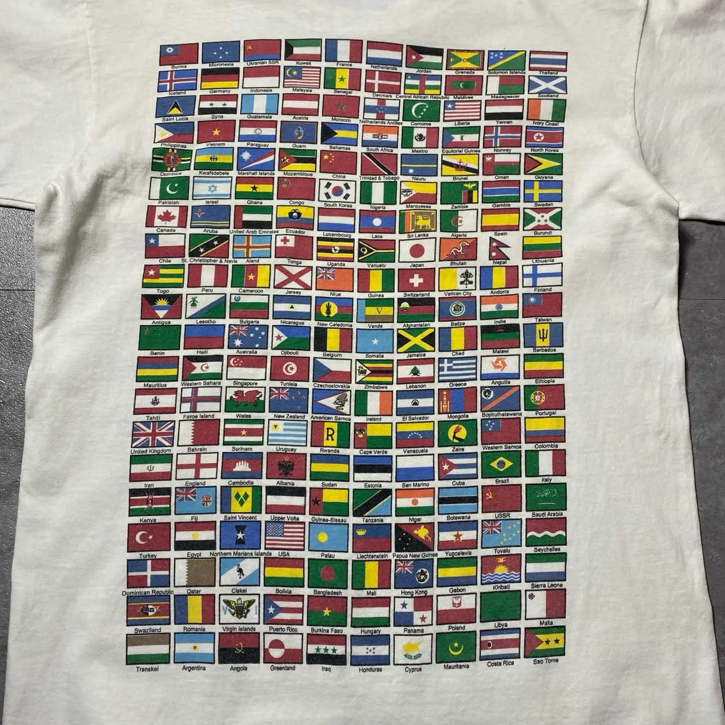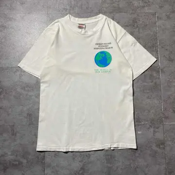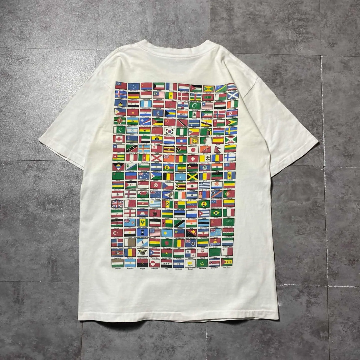 ◯ Explanation ◯ 90年代ONEITAボディを使用した、University of Wisconsin Stevens PointのインターナショナルプログラムTシャツ。 フロントには地球をモチーフにしたシンプルなグラフィックと、「THE WORLD IS OUR CAMPUS」のメッセージが配置され、教育機関らしい知的でクリーンな印象のデザインに仕上がっています。 バックには世界各国の国旗が細かく並べられたインパクトのあるプリントが施されており、フロントとのコントラストも魅力的な一着。90年代らしい“メッセージ性×デザイン性”を兼ね備えたグラフィックTです。 ボディはONEITA POWER-T。コットン100%のしっかりとした生地感に加え、程よくフェードしたナチュラルな生成りカラーがヴィンテージらしい雰囲気を演出しています。 アメリカ製ファブリックを使用した当時のボディで、シングルステッチ仕様。デザイン・ボディともに90年代らしさがしっかり感じられる一着です。 一枚で主役になるバックプリント、かつクリーンなフロントデザインで、スタイリングの幅も広いおすすめアイテムです。 ○Size○ 表記→L ・着丈66 ・身幅50 ・肩幅46 ・袖丈22.5 (cm) ○Color○ ・ホワイト ○Material○ ・100%コットン ○Condition○ ・目立つ傷や汚れなし ○Caution○ 当店で取り扱っている商材は全て『古着』となっております。 そのため、多少の状態難(ほつれ、傷、汚れ、リブの伸び、使用感、擦れ、色あせ、etc)がある場合がございます。 新品同様の完璧なお品物をお求めの方は当店でのお買い物を控えて頂きますよう宜しくお願いします。 また、購入された商品に関しましては、購入日時から起算して『72時間以内に』発送手続きの方を取らせて頂きます。 お急ぎの場合は購入前に当店オンラインストアの方にお問い合わせ頂きますよう宜しくお願いします。 26/596