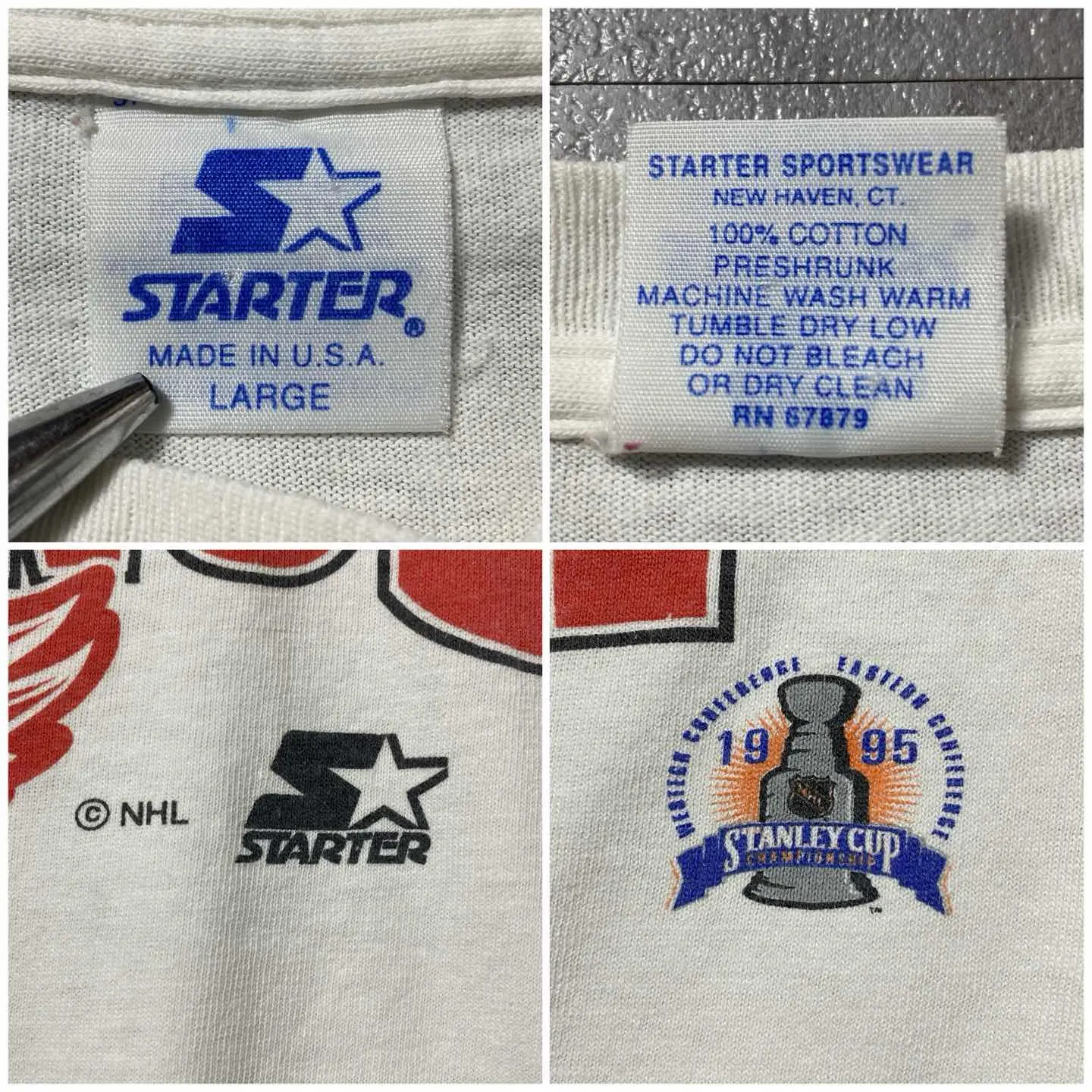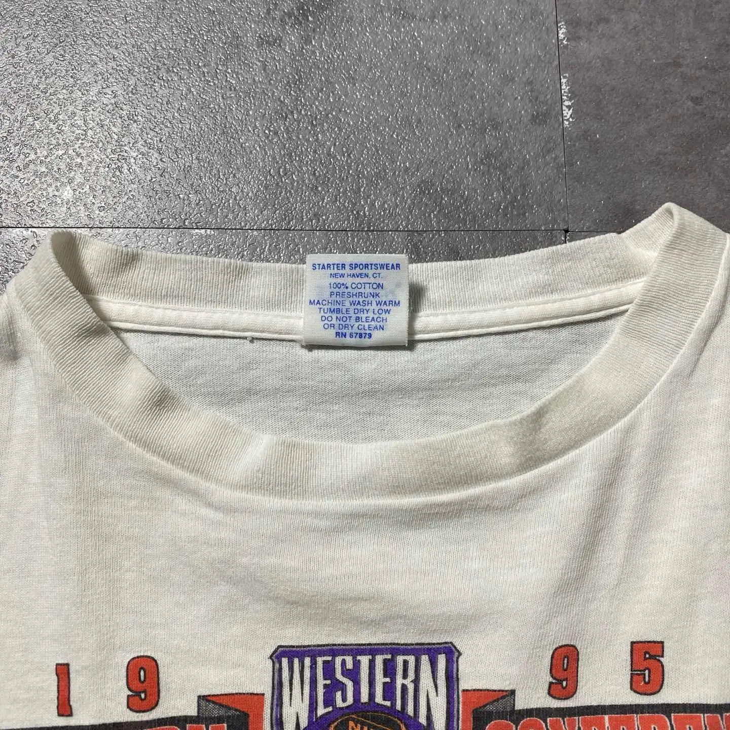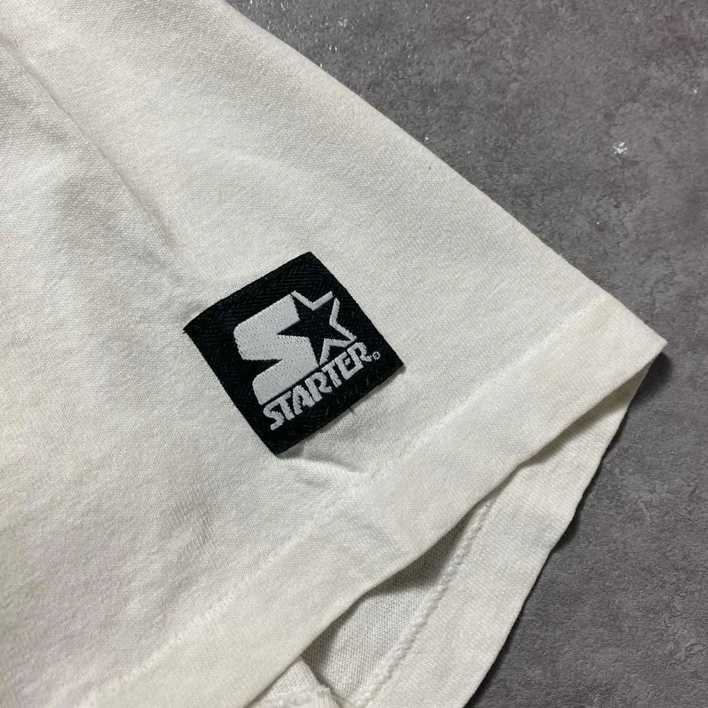 ◯ Explanation ◯ 1995年、NHLウエスタンカンファレンス優勝時のDetroit Red Wingsを記念した、存在感抜群のヴィンテージTシャツ。 ボディはSTARTER、さらに**MADE IN U.S.A.**表記入りの嬉しい一枚です。 フロントには “1995 WESTERN CONFERENCE CHAMPIONS DETROIT RED WINGS” の大判グラフィックを配置。 中央にはホッケーパック、下部にはレッドウィングスの象徴的なウィングホイールロゴ、さらに1995年スタンレーカップ表記も入る、当時物らしい情報量の多い豪華なデザインが魅力です。 シルエットは身幅にゆとりのあるボックス寄り。 一枚で主役になるのはもちろん、シャツやライトアウターのインナーとしても映えるアイテムです。 NHL物、アメリカ製Tシャツ、STARTERボディ、90sスポーツ物がお好きな方にはかなり刺さる一着かと思います。 Detroit Red Wingsは“Original Six”の名門としても知られ、ファッション目線でも人気の高いチーム。 その中でもこちらは1995年のウエスタンカンファレンス優勝記念という年代・内容ともに分かりやすいプリントで、コレクションとしてもおすすめです。 ○Size○ 表記→L ・着丈60 ・身幅61 ・肩幅52 ・袖丈22 (cm) ○Color○ ・ホワイト ○Material○ ・100%コットン ○Condition○ ・首元多少のヤレあり ・右脇下にほつれによる穴あき箇所あり ○Caution○ 当店で取り扱っている商材は全て『古着』となっております。 そのため、多少の状態難(ほつれ、傷、汚れ、リブの伸び、使用感、擦れ、色あせ、etc)がある場合がございます。 新品同様の完璧なお品物をお求めの方は当店でのお買い物を控えて頂きますよう宜しくお願いします。 また、購入された商品に関しましては、購入日時から起算して『72時間以内に』発送手続きの方を取らせて頂きます。 お急ぎの場合は購入前に当店オンラインストアの方にお問い合わせ頂きますよう宜しくお願いします。 26/678