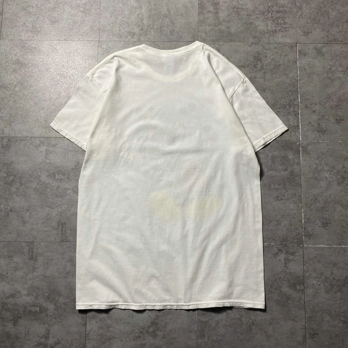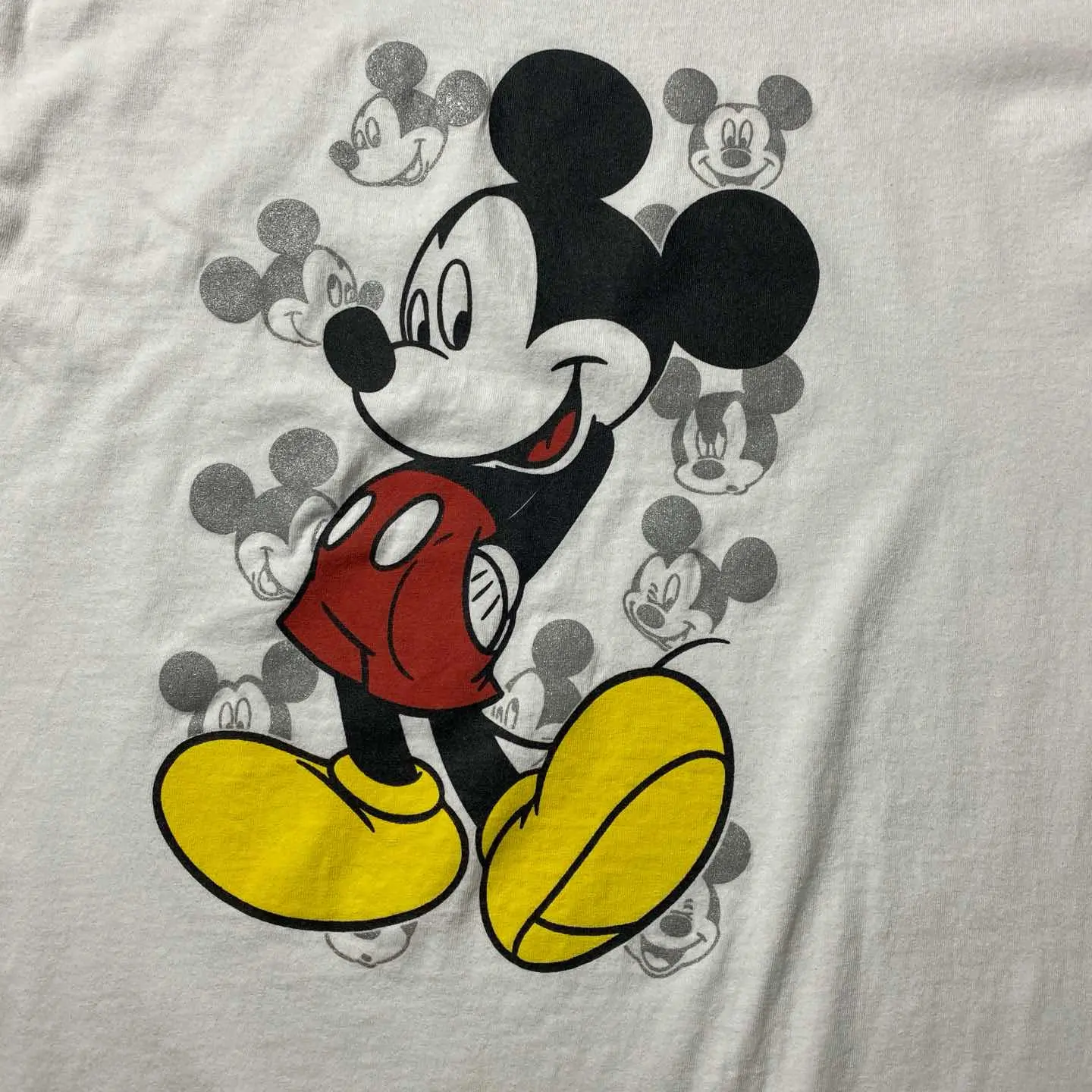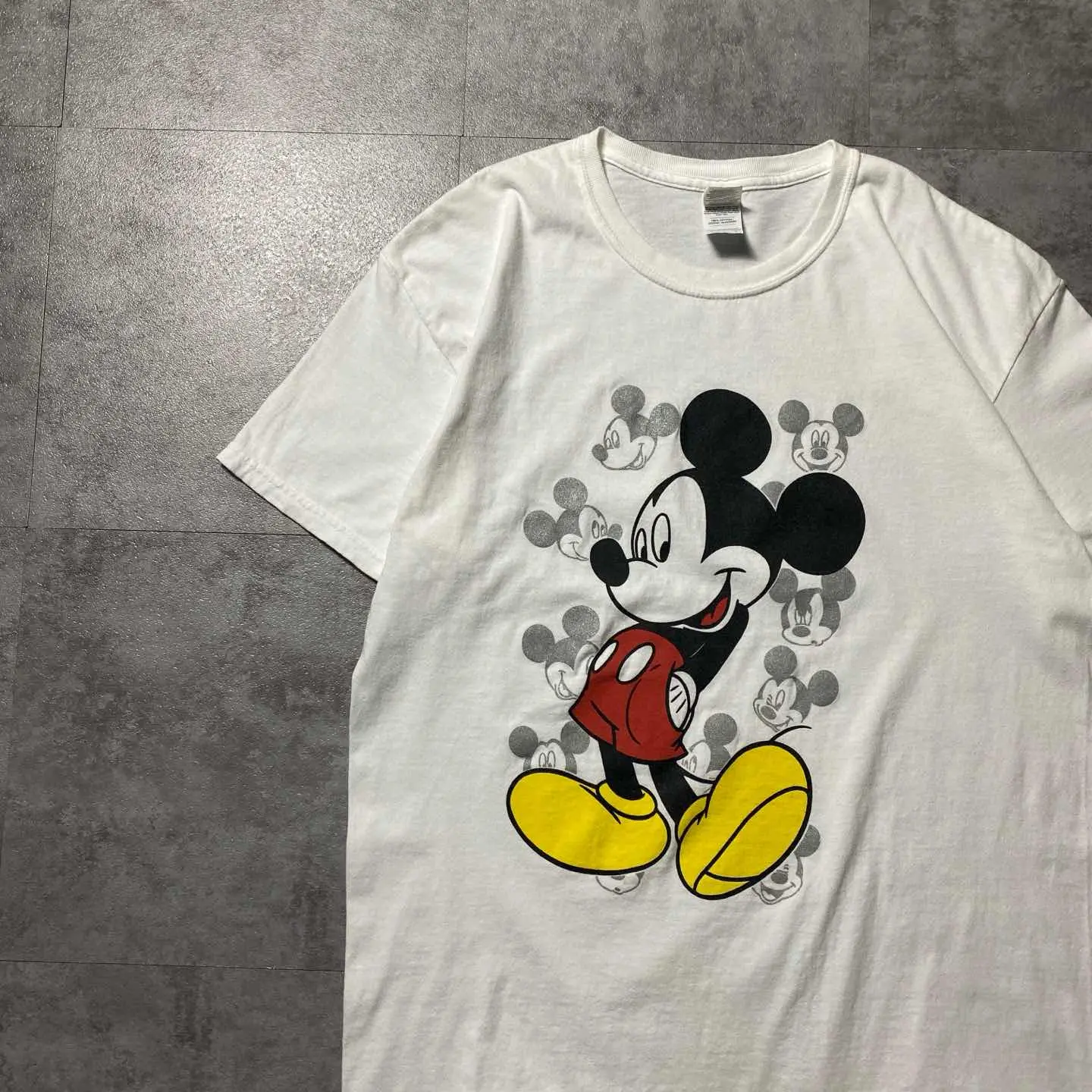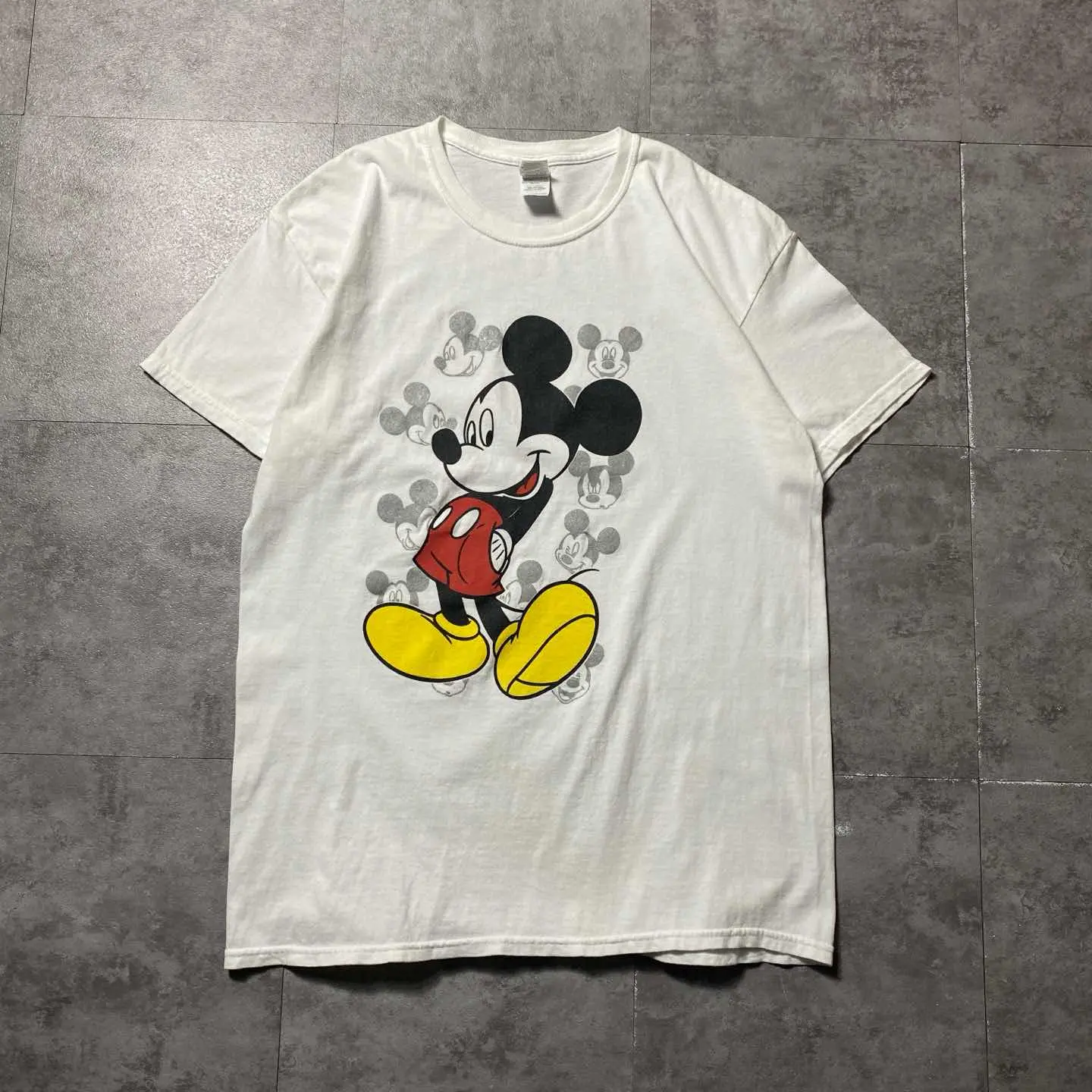 ◯ Explanation ◯ ディズニーを代表するキャラクター、Mickey Mouseをフロントに配したプリントTシャツ。 クラシックなミッキーをメインに、背後にはフェードしたミッキーのグラフィックを重ねたレイヤーデザイン。 シンプルながら奥行きのある仕上がりで、定番とは一線を画す一枚です。 ホワイトボディに映えるブラック・レッド・イエローの配色は、ストリートから古着ミックスまで幅広く対応。 一枚で着ても、インナーとしても使いやすい万能なアイテムです。 ボディはGILDAN Heavy Cottonを使用し、ラフに着られるタフな質感。 サイズはLで程よくゆとりのあるシルエット。 “王道”だからこそ外さない。 デイリーに使えるキャラクターTを探している方におすすめの一着です。 ○Size○ 表記→L ・着丈71 ・身幅53 ・肩幅50 ・袖丈18 (cm) ○Color○ ・ホワイト ○Material○ ・100%コットン ○Condition○ ・フロント腹部薄汚れ箇所あり ○Caution○ 当店で取り扱っている商材は全て『古着』となっております。 そのため、多少の状態難(ほつれ、傷、汚れ、リブの伸び、使用感、擦れ、色あせ、etc)がある場合がございます。 新品同様の完璧なお品物をお求めの方は当店でのお買い物を控えて頂きますよう宜しくお願いします。 また、購入された商品に関しましては、購入日時から起算して『72時間以内に』発送手続きの方を取らせて頂きます。 お急ぎの場合は購入前に当店オンラインストアの方にお問い合わせ頂きますよう宜しくお願いします。 26/570