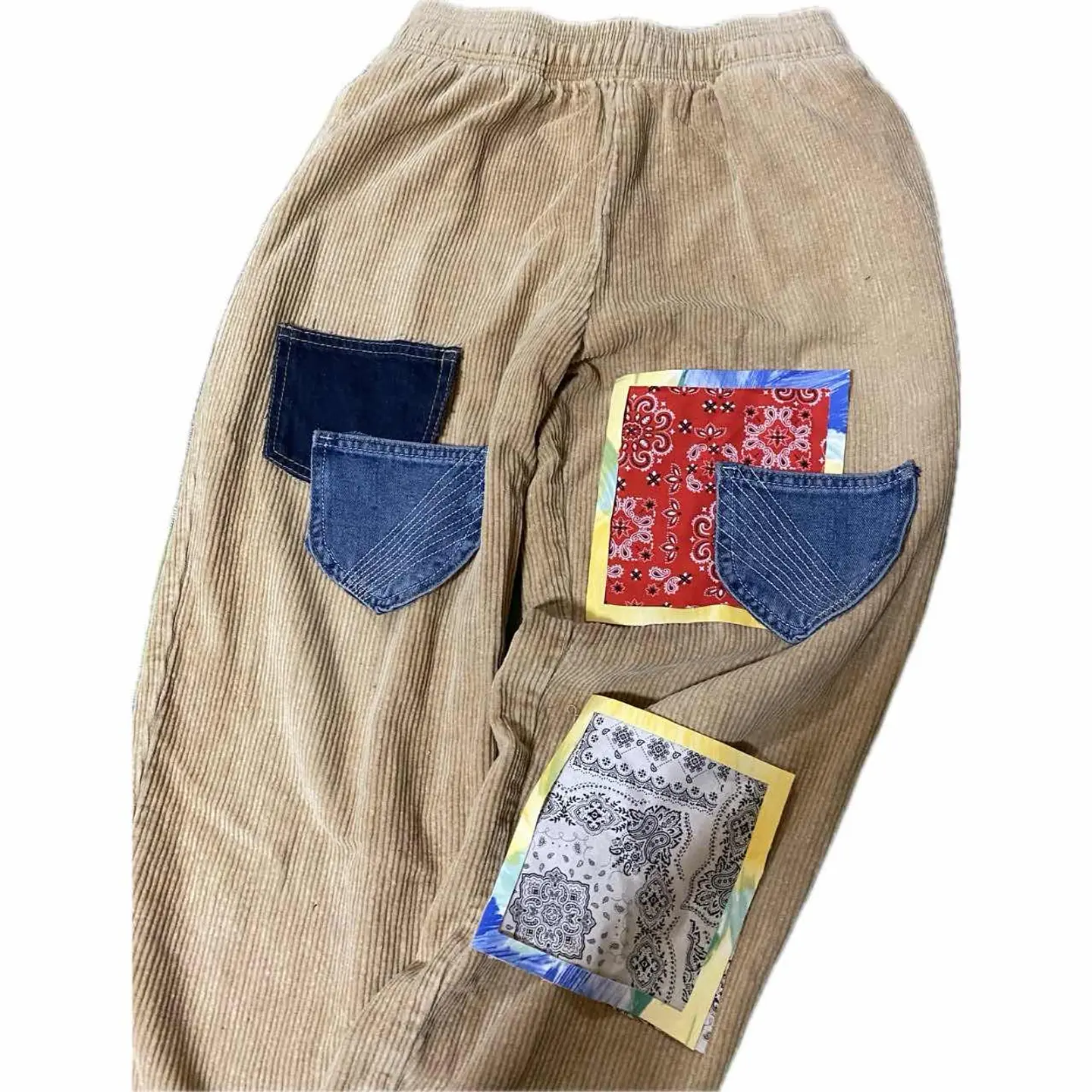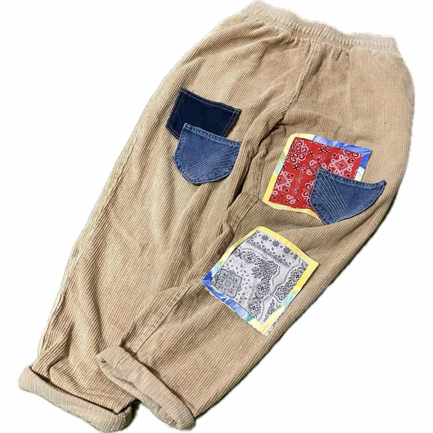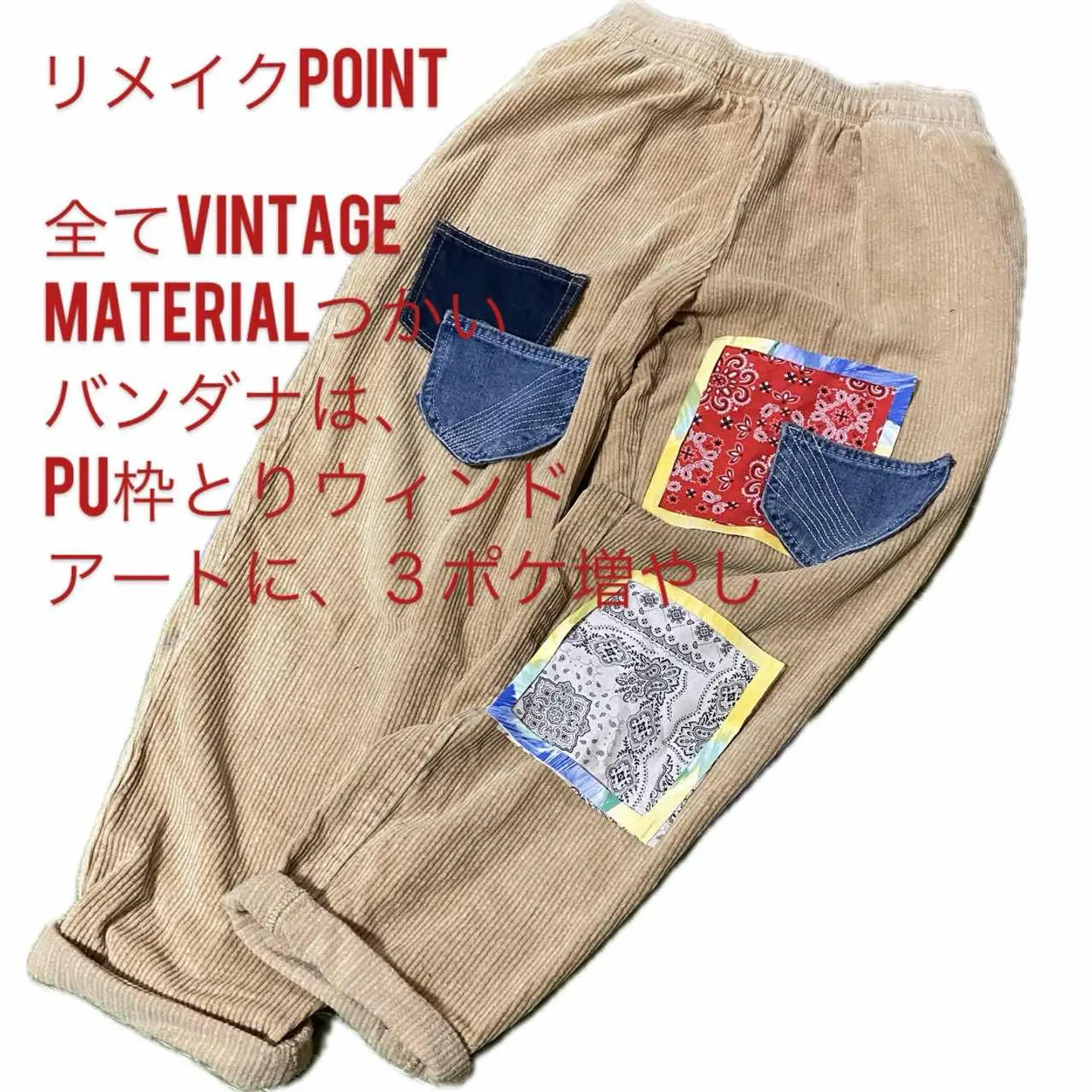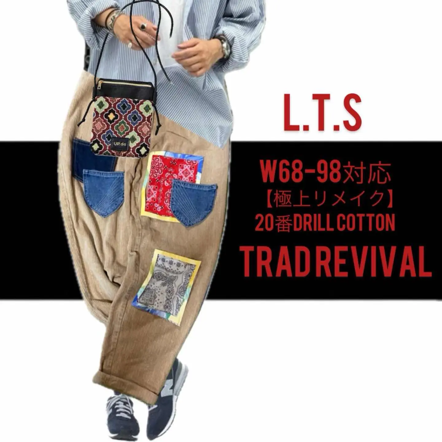 【極上リメイク】L.T.S 新品使用 revival trad drill20番ボトム 【カテゴリーワークにしときます】1950 1st trad を、リバイバルしたの使ったんで、 55starge L.T.S ワンサイズしか作らない。こだわりの強い少量生産、またはいってんものしか作らないこだわりのデザイナーのラストテストサンプル 1950の初期のトラッドスタイルをイメージして作られた独特のカーブパンツ、さらにフェード加工を施していて、雰囲気抜群に仕上げ、シルエットを、現代によせたボトム、遠慮なく!! リメイクしました!! まずデニムのヴィンテージのポケットを3つ作り、取り付けデザイン性を上げたくて、ヴィンテージのバンダナを2枚使い 選択できるようにpuレザーを、ウィンドウアートとよばれる枠をつくり、バンダナぬいつけ、ボトムに取り付けると言う半端ない手間ひまをかけてみましたので、かなりかっこいい本となっております。今回コーディネートはニューバランスのスニーカー、 今年むっちゃ、人気の、ビックサイズのシャツにTシャツを仕込む感じにしました、大人カジュアルですね、 そうすることにより、ボトムのデザイン性が目を引きつけ、あなたのセンスは一目おかれるのは、 !!保証します!! ですが、一応せっかく1950年トラッドスタイルリバイバルね。なんで私だったら今回コーディネート省きますが、デニムジャケットとかサーマルとか少しタフな感じに仕上げると思いますが、お好みでガンガン着回せますのでぜひ体感ください ▷color◁ サンドベージュフェード加工 ※使いのブラウザにより色が変わってみえる場合あります ▷size◁ 平置き片面採寸【㎝表記】 表記sizeLとしときますが、どなたも対応 【※ウエストのみ、メジャーで一周採寸】 ウエストW68-98 股上33 ハイも決まる 股下71 腿渡り30 裾幅21 トレンドカーブシルエット モデル170㎝/普通体型、30インチジャストな体型参考に、 ▷material◁ 20番drillコットンテクスト ▷condition◁ 最強、L.S.Tつかったんで、新品ワンウォシュしただけ、 ※入念にチェックは、しておりますが、vintage/usedの特性ご理解下さい